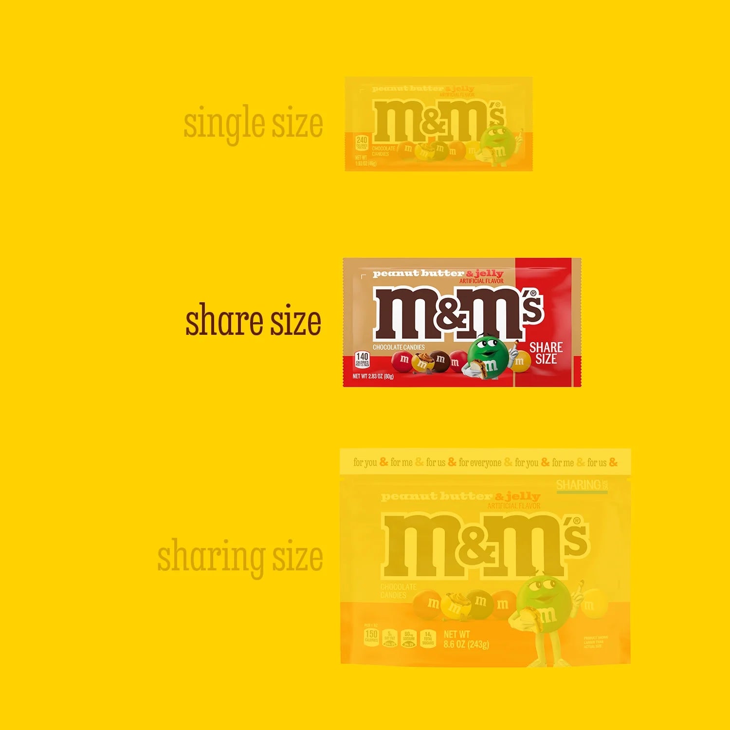 • Inspired by your favorite lunchtime snack, meet our NEW M&M'S Peanut Butter and Jelly candy! Enjoy the flavors of creamy peanut butter and sweet jelly, coated in milk chocolate and colorful candy shells