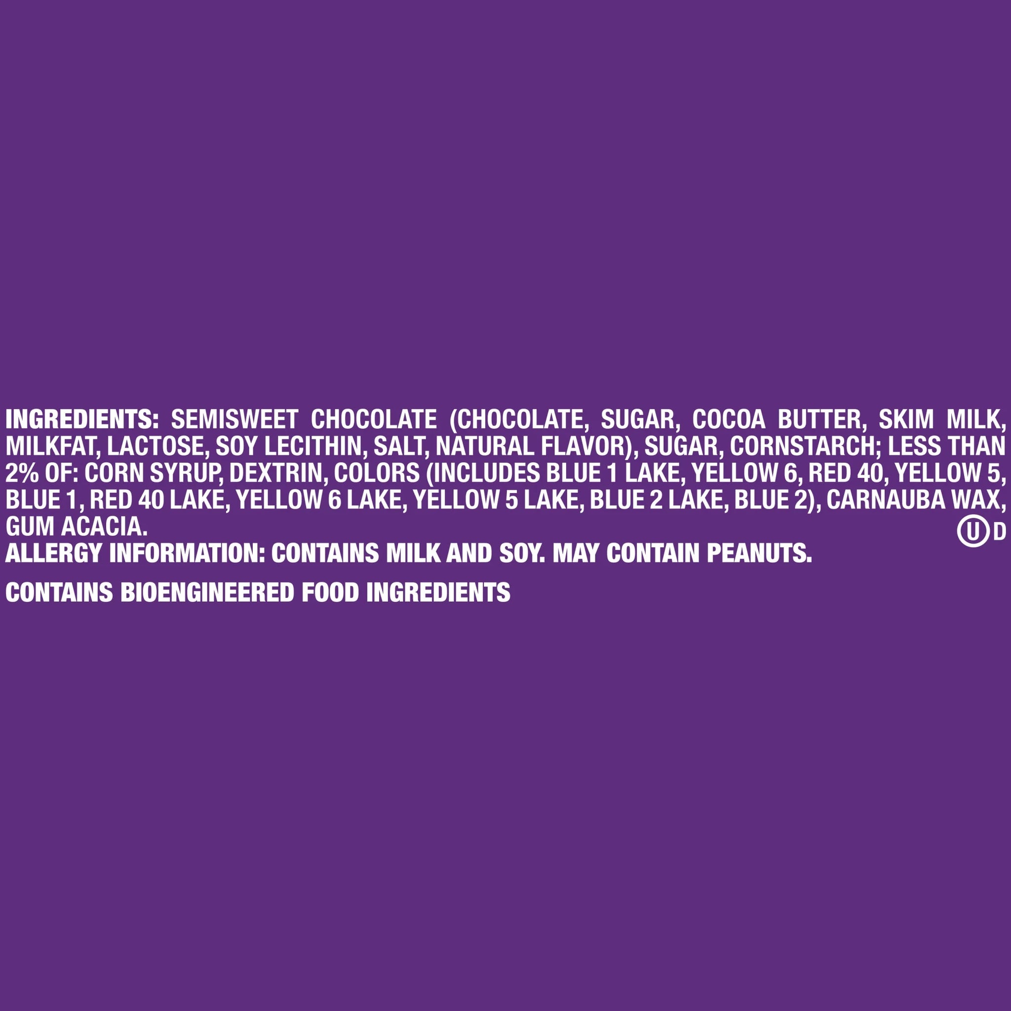 SEMISWEET CHOCOLATE (CHOCOLATE, SUGAR, COCOA BUTTER, SKIM MILK, MILKFAT, LACTOSE, SOY LECITHIN, SALT, NATURAL FLAVOR), SUGAR, CORNSTARCH; LESS THAN 2% OF: CORN SYRUP, DEXTRIN, COLORS (INCLUDES BLUE 1 LAKE, YELLOW 6, RED 40, YELLOW 5, BLUE 1, RED 40 LAKE, YELLOW 6 LAKE, YELLOW 5 LAKE, BLUE 2 LAKE, BLUE 2), CARNAUBA WAX, GUM ACACIA./div>