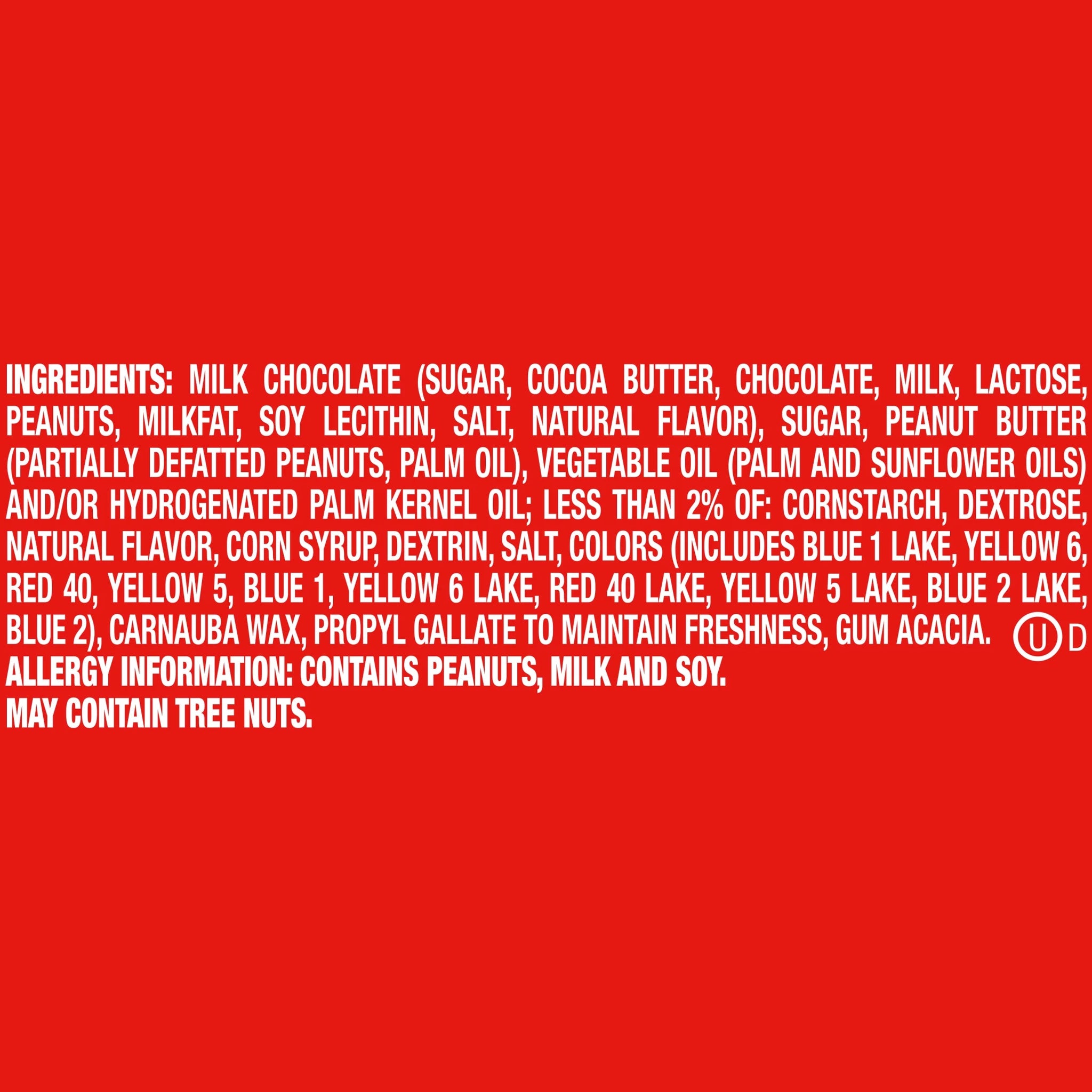 MILK CHOCOLATE (SUGAR, COCOA BUTTER, CHOCOLATE, MILK, LACTOSE, PEANUTS, MILKFAT, SOY LECITHIN, SALT, NATURAL FLAVOR), SUGAR, PEANUT BUTTER (PARTIALLY DEFATTED PEANUTS, PALM OIL), VEGETABLE OIL (PALM AND SUNFLOWER OILS) AND/OR HYDROGENATED PALM KERNEL OIL; LESS THAN 2% OF: CORNSTARCH, DEXTROSE, NATURAL FLAVOR, CORN SYRUP, DEXTRIN, SALT, COLORS (INCLUDES BLUE 1 LAKE, YELLOW 6, RED 40, YELLOW 5, BLUE 1, YELLOW 6 LAKE, RED 40 LAKE, YELLOW 5 LAKE, BLUE 2 LAKE, BLUE 2), CARNAUBA WAX, PROPYL GALLATE TO MAINTAIN FRESHNESS, GUM ACACIA./div>