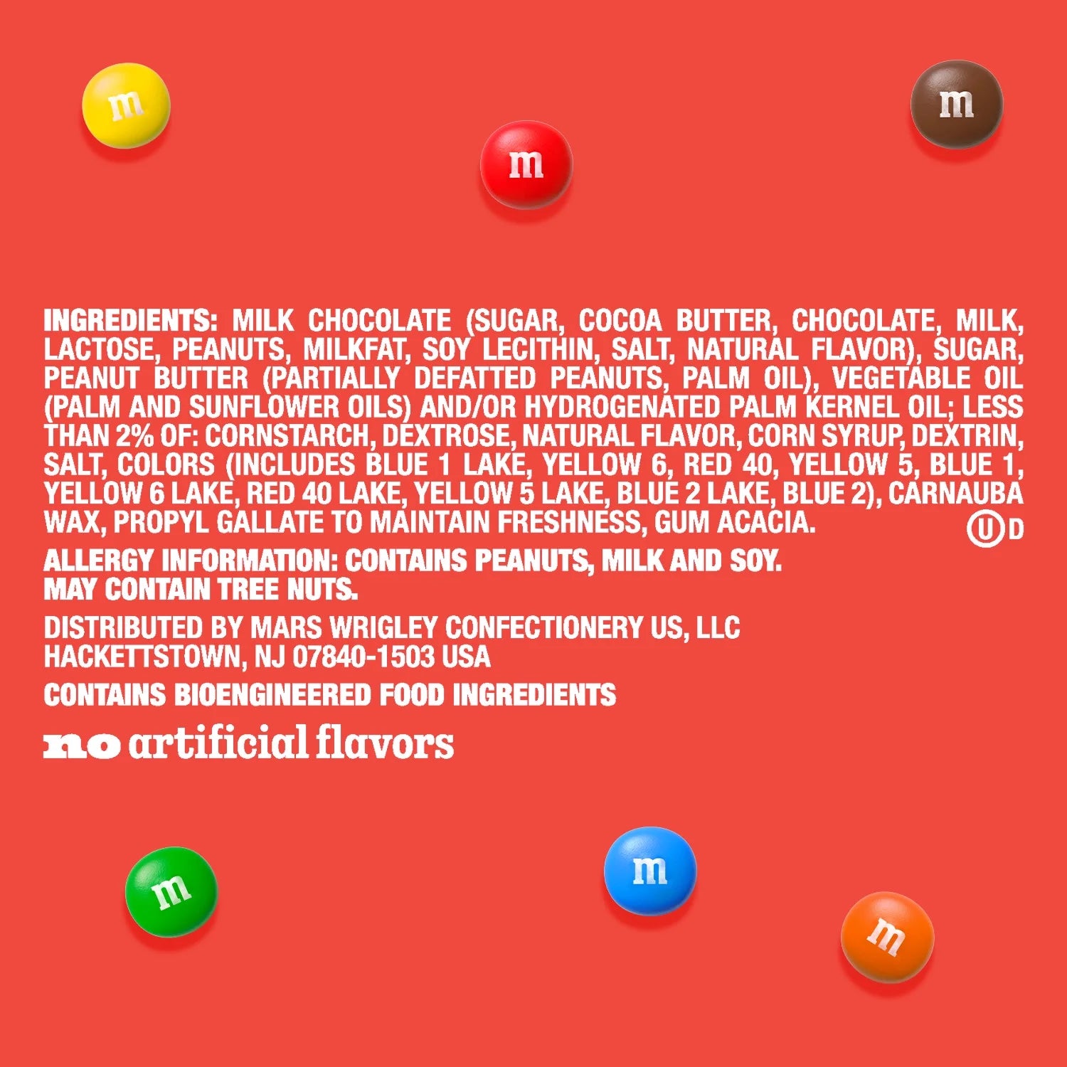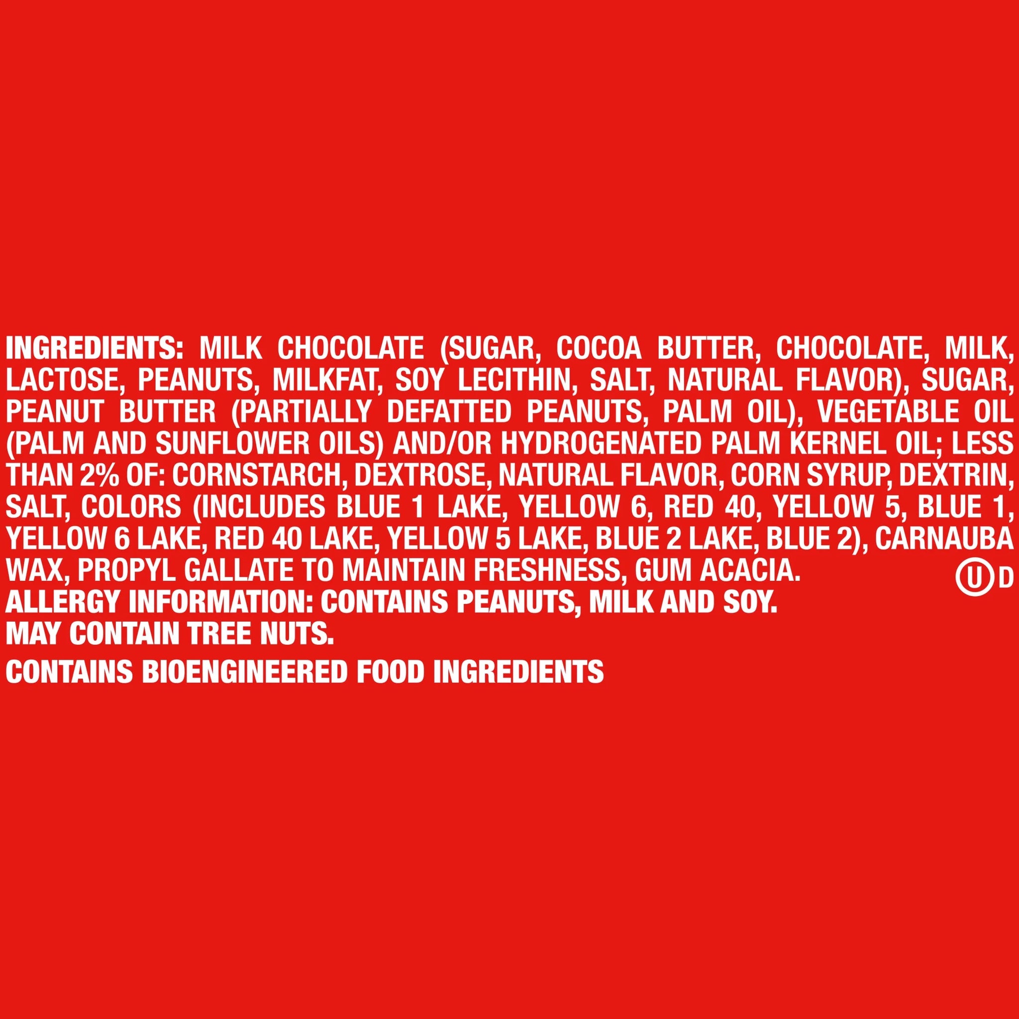 MILK CHOCOLATE (SUGAR, COCOA BUTTER, CHOCOLATE, MILK, LACTOSE, PEANUTS, MILKFAT, SOY LECITHIN, SALT, NATURAL FLAVOR), SUGAR, PEANUT BUTTER (PARTIALLY DEFATTED PEANUTS, PALM OIL), VEGETABLE OIL (PALM AND SUNFLOWER OILS) AND/OR HYDROGENATED PALM KERNEL OIL; LESS THAN 2% OF: CORNSTARCH, DEXTROSE, NATURAL FLAVOR, CORN SYRUP, DEXTRIN, SALT, COLORS (INCLUDES BLUE 1 LAKE, YELLOW 6, RED 40, YELLOW 5, BLUE 1, YELLOW 6 LAKE, RED 40 LAKE, YELLOW 5 LAKE, BLUE 2 LAKE, BLUE 2), CARNAUBA WAX, PROPYL GALLATE TO MAINTAIN FRESHNESS, GUM ACACIA./div>