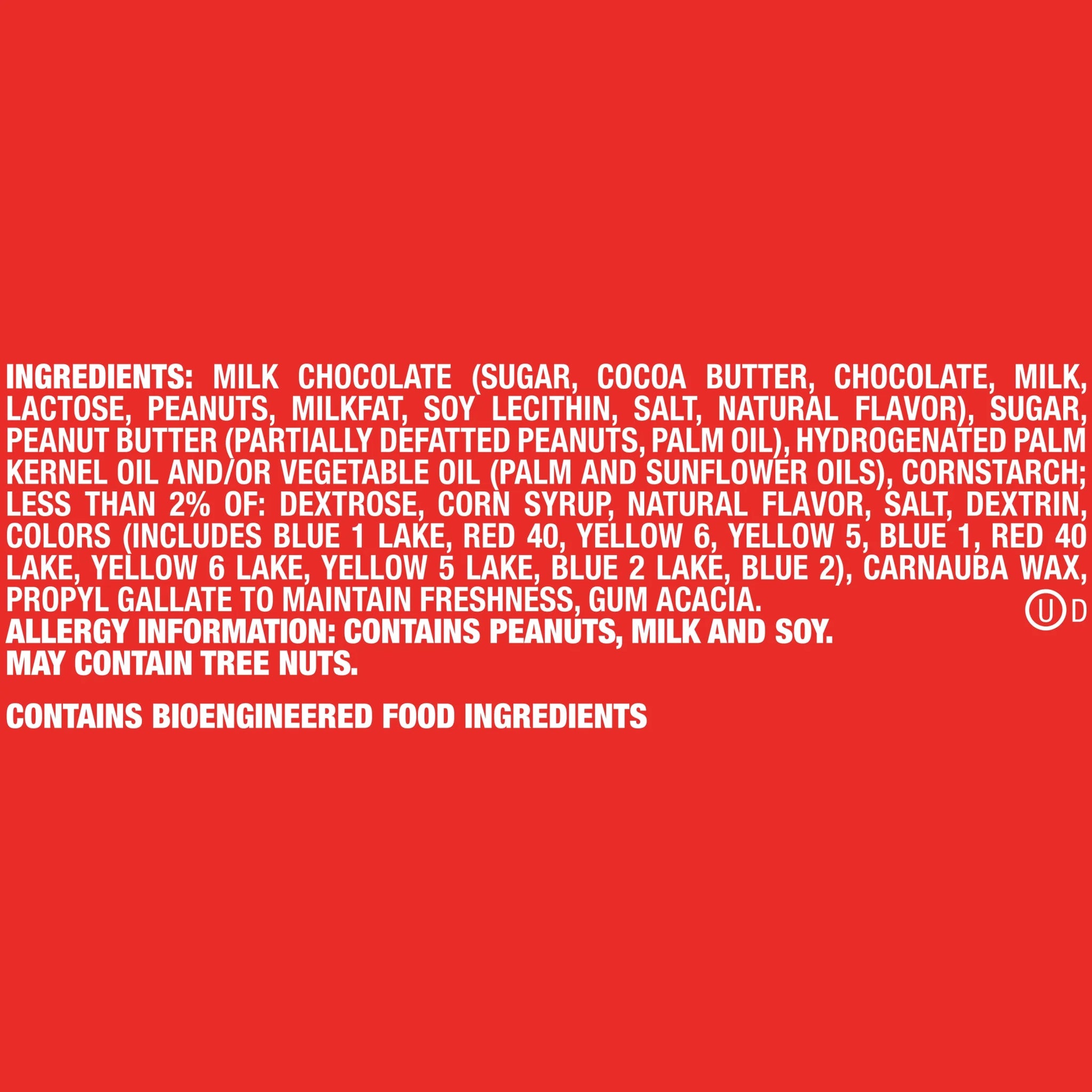 MILK CHOCOLATE (SUGAR, COCOA BUTTER, CHOCOLATE, MILK, LACTOSE, PEANUTS, MILKFAT, SOY LECITHIN, SALT, NATURAL FLAVOR), SUGAR, PEANUT BUTTER (PARTIALLY DEFATTED PEANUTS, PALM OIL), HYDROGENATED PALM KERNEL OIL, CORNSTARCH, DEXTROSE; LESS THAN 1% OF: CORN SYRUP, NATURAL FLAVOR, SALT, DEXTRIN, COLORS (INCLUDES BLUE 1 LAKE, RED 40, YELLOW 6, YELLOW 5, BLUE 1, RED 40 LAKE, YELLOW 6 LAKE, YELLOW 5 LAKE, BLUE 2 LAKE, BLUE 2), CARNAUBA WAX, PROPYL GALLATE TO MAINTAIN FRESHNESS, GUM ACACIA./div>