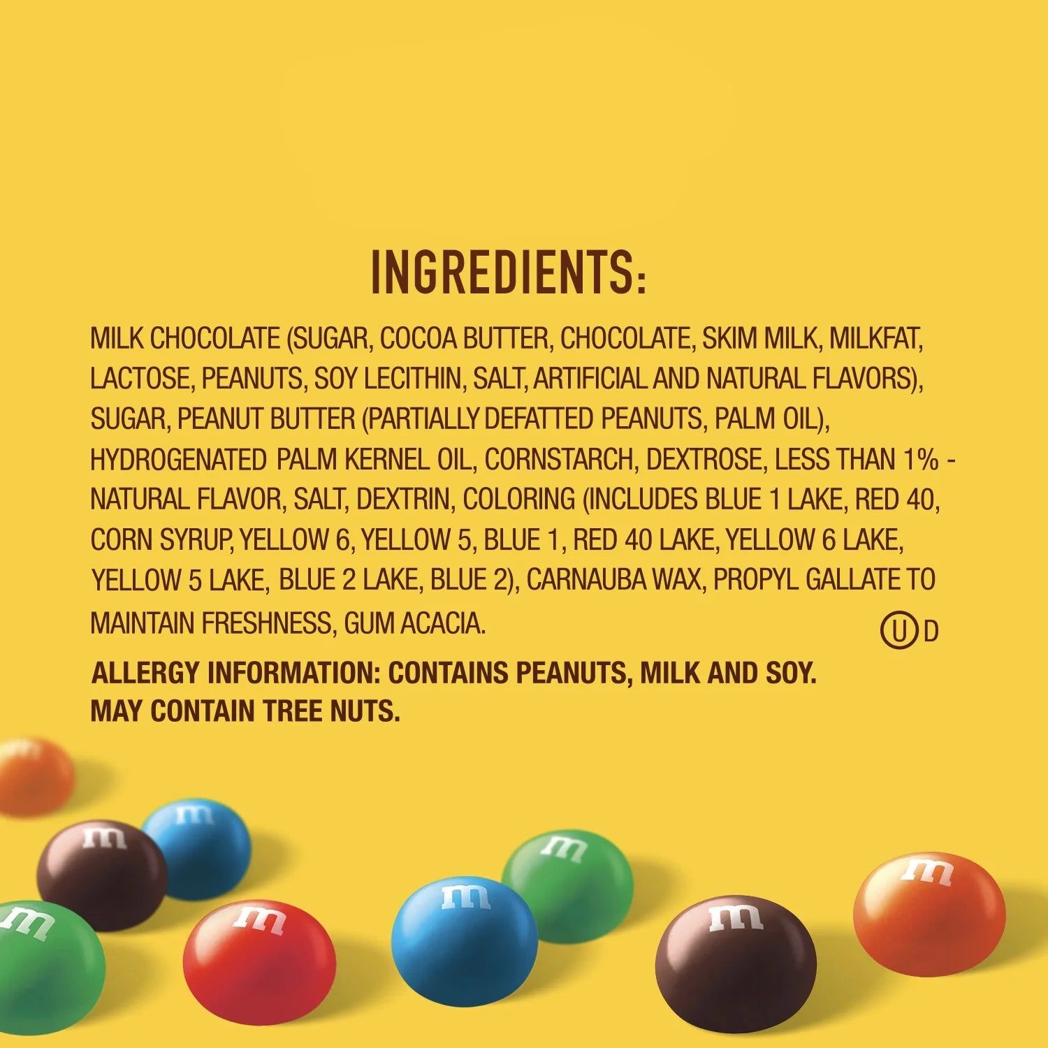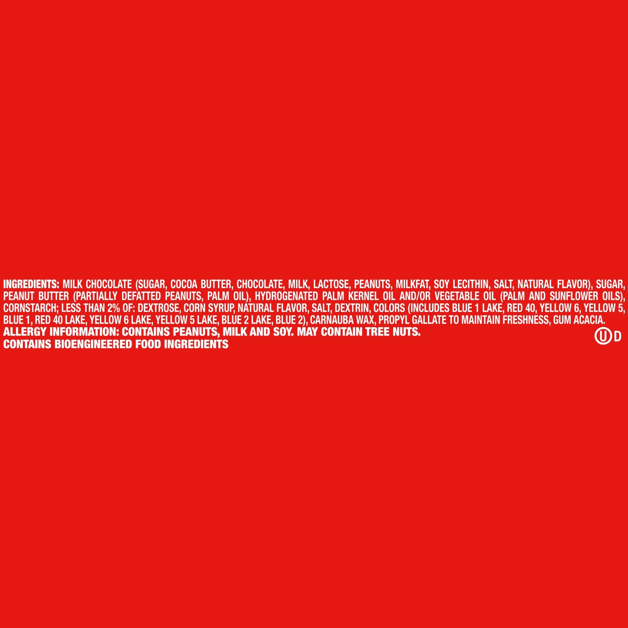 MILK CHOCOLATE (SUGAR, COCOA BUTTER, CHOCOLATE, MILK, LACTOSE, PEANUTS, MILKFAT, SOY LECITHIN, SALT, NATURAL FLAVOR), SUGAR, PEANUT BUTTER (PARTIALLY DEFATTED PEANUTS, PALM OIL), HYDROGENATED PALM KERNEL OIL, CORNSTARCH, DEXTROSE, LESS THAN 1% OF: CORN SYRUP, NATURAL FLAVOR, SALT, DEXTRIN, COLORS (INCLUDES BLUE 1 LAKE, RED 40, YELLOW 6, YELLOW 5, BLUE 1, RED 40 LAKE, YELLOW 6 LAKE, YELLOW 5 LAKE, BLUE 2 LAKE, BLUE 2), CARNAUBA WAX, PROPYL GALLATE TO MAINTAIN FRESHNESS, GUM ACACIA./div>