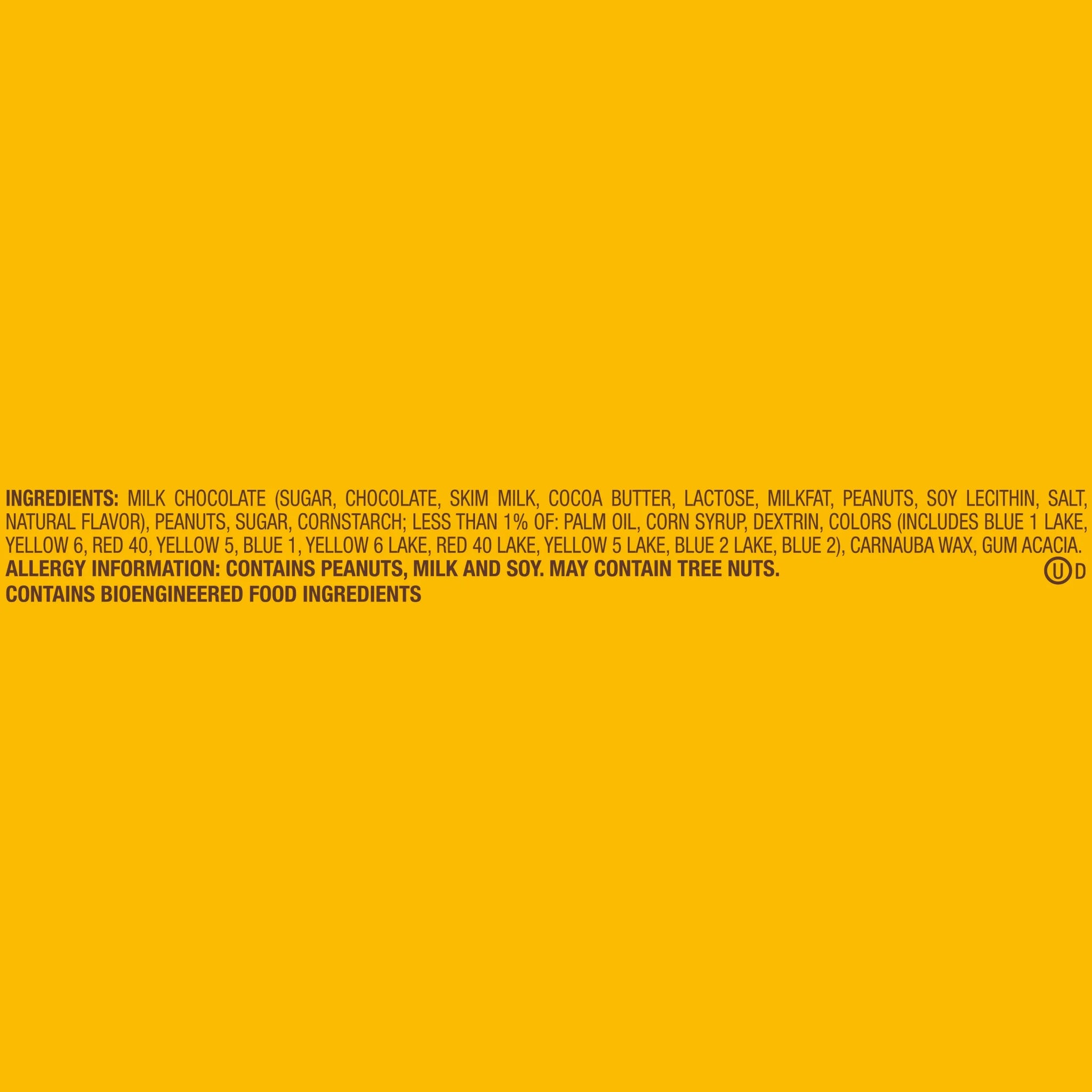 MILK CHOCOLATE (SUGAR, CHOCOLATE, SKIM MILK, COCOA BUTTER, LACTOSE, MILKFAT, PEANUTS, SOY LECITHIN, SALT, NATURAL FLAVOR), PEANUTS, SUGAR, CORNSTARCH; LESS THAN 1% OF: PALM OIL, CORN SYRUP, DEXTRIN, COLORS (INCLUDES BLUE 1 LAKE, YELLOW 6, RED 40, YELLOW 5, BLUE 1, YELLOW 6 LAKE, RED 40 LAKE, YELLOW 5 LAKE, BLUE 2 LAKE, BLUE 2), CARNAUBA WAX, GUM ACACIA./div>