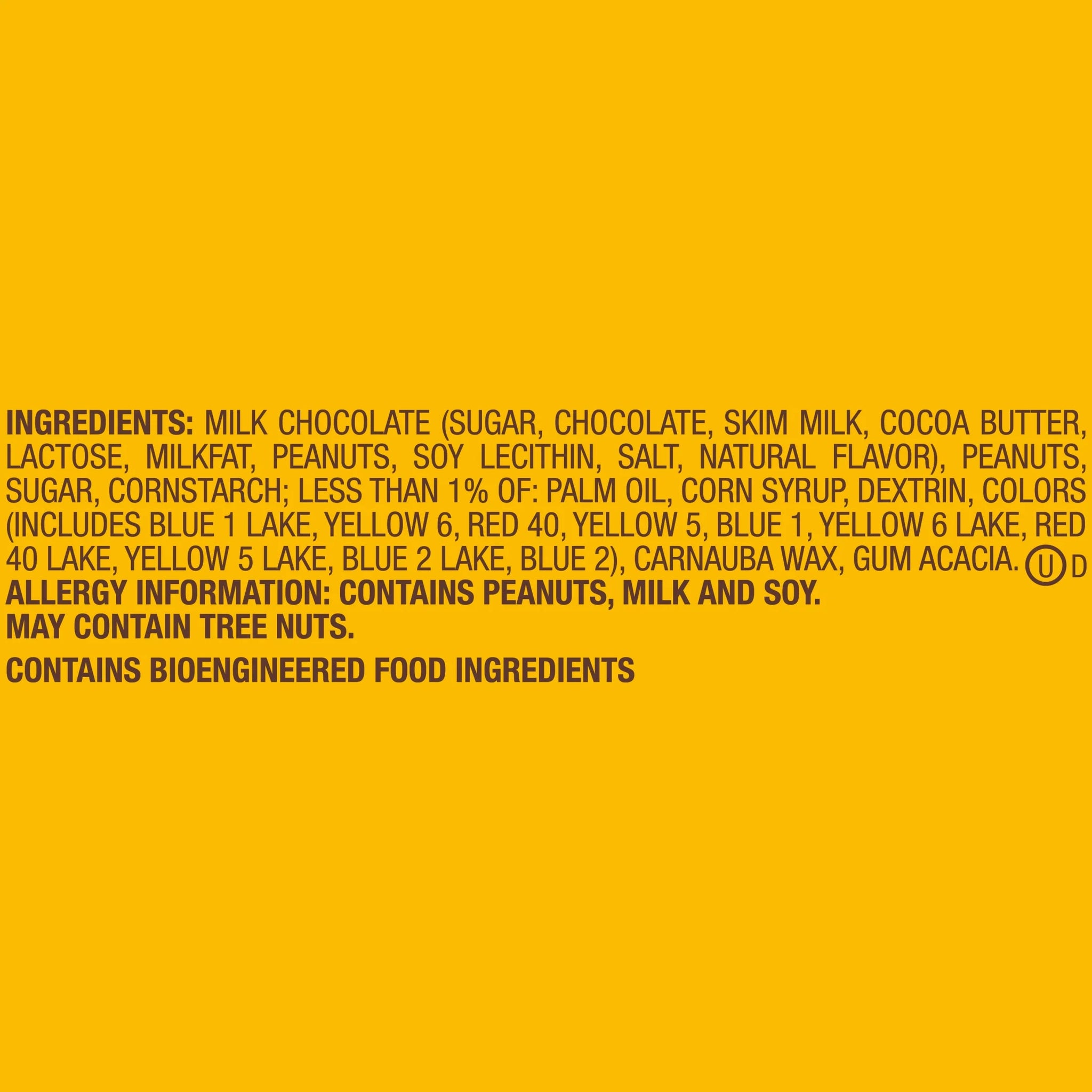MILK CHOCOLATE (SUGAR, CHOCOLATE, SKIM MILK, COCOA BUTTER, LACTOSE, MILKFAT, PEANUTS, SOY LECITHIN, SALT, NATURAL FLAVOR), PEANUTS, SUGAR, CORNSTARCH; LESS THAN 1% OF: PALM OIL, CORN SYRUP, DEXTRIN, COLORS (INCLUDES BLUE 1 LAKE, YELLOW 6, RED 40, YELLOW 5, BLUE 1, YELLOW 6 LAKE, RED 40 LAKE, YELLOW 5 LAKE, BLUE 2 LAKE, BLUE 2), CARNAUBA WAX, GUM ACACIA./div>