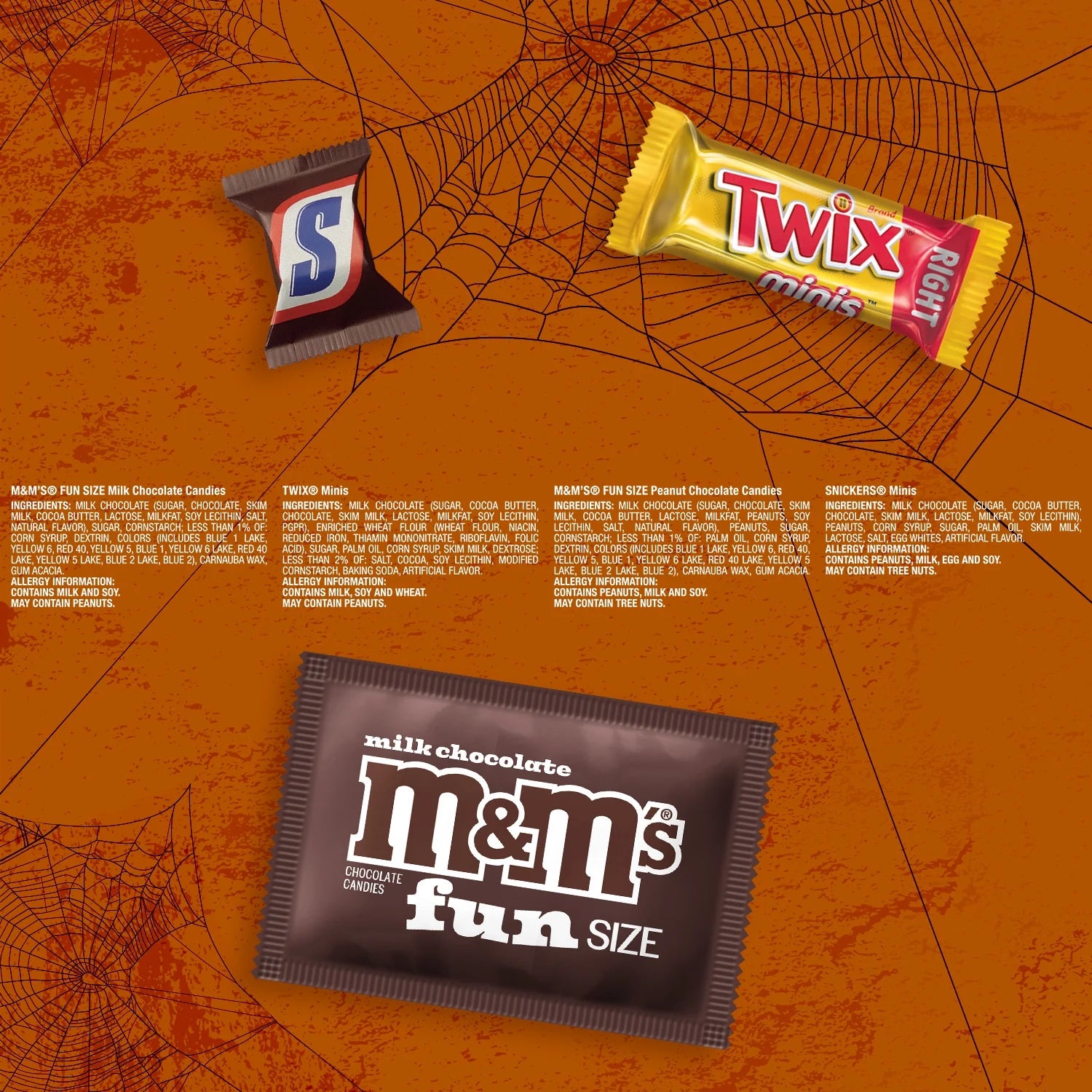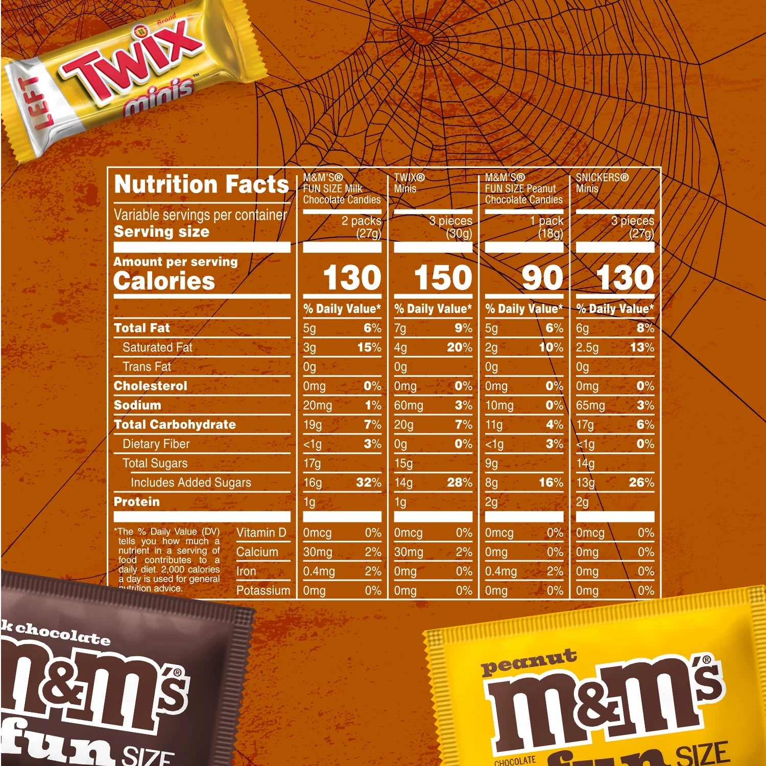 • Treat your taste buds to the milk chocolate goodness of M&M'S Milk Chocolate Fun Size, M&M'S Peanut Fun Size, SNICKERS Minis & TWIX Mini Chocolates