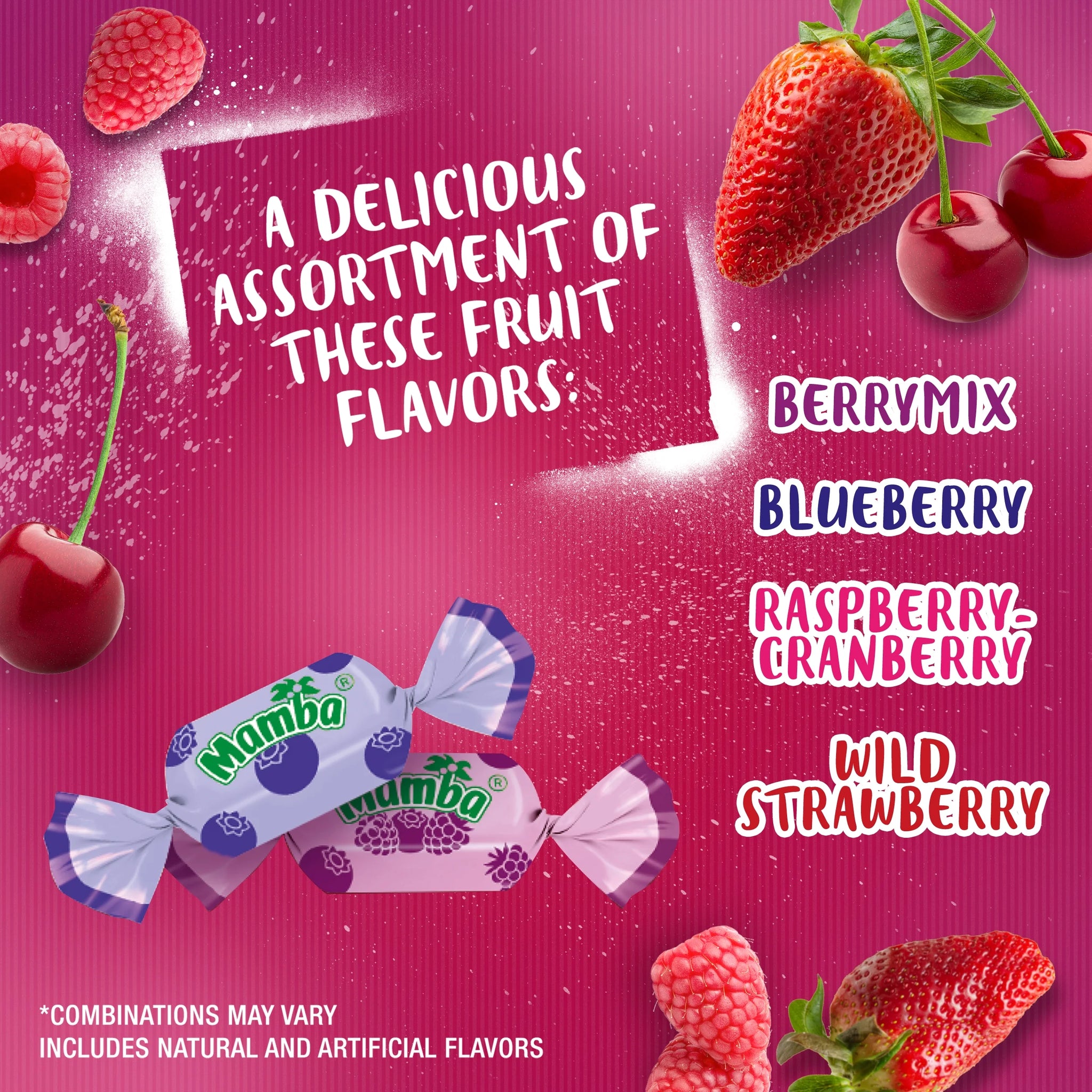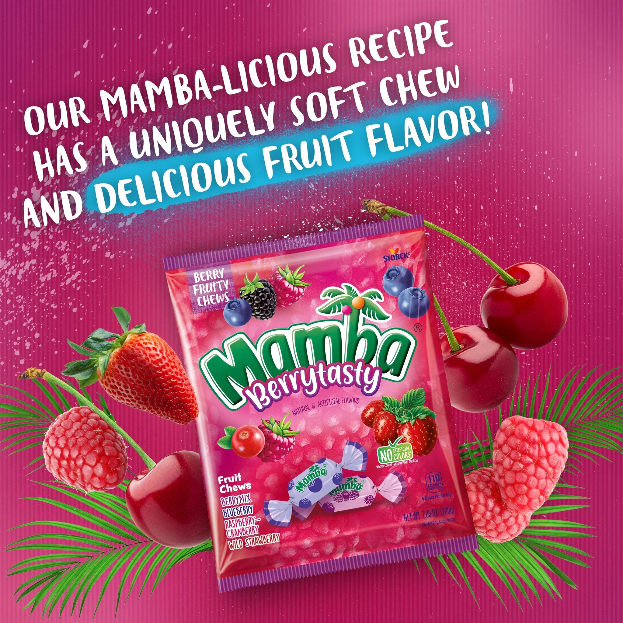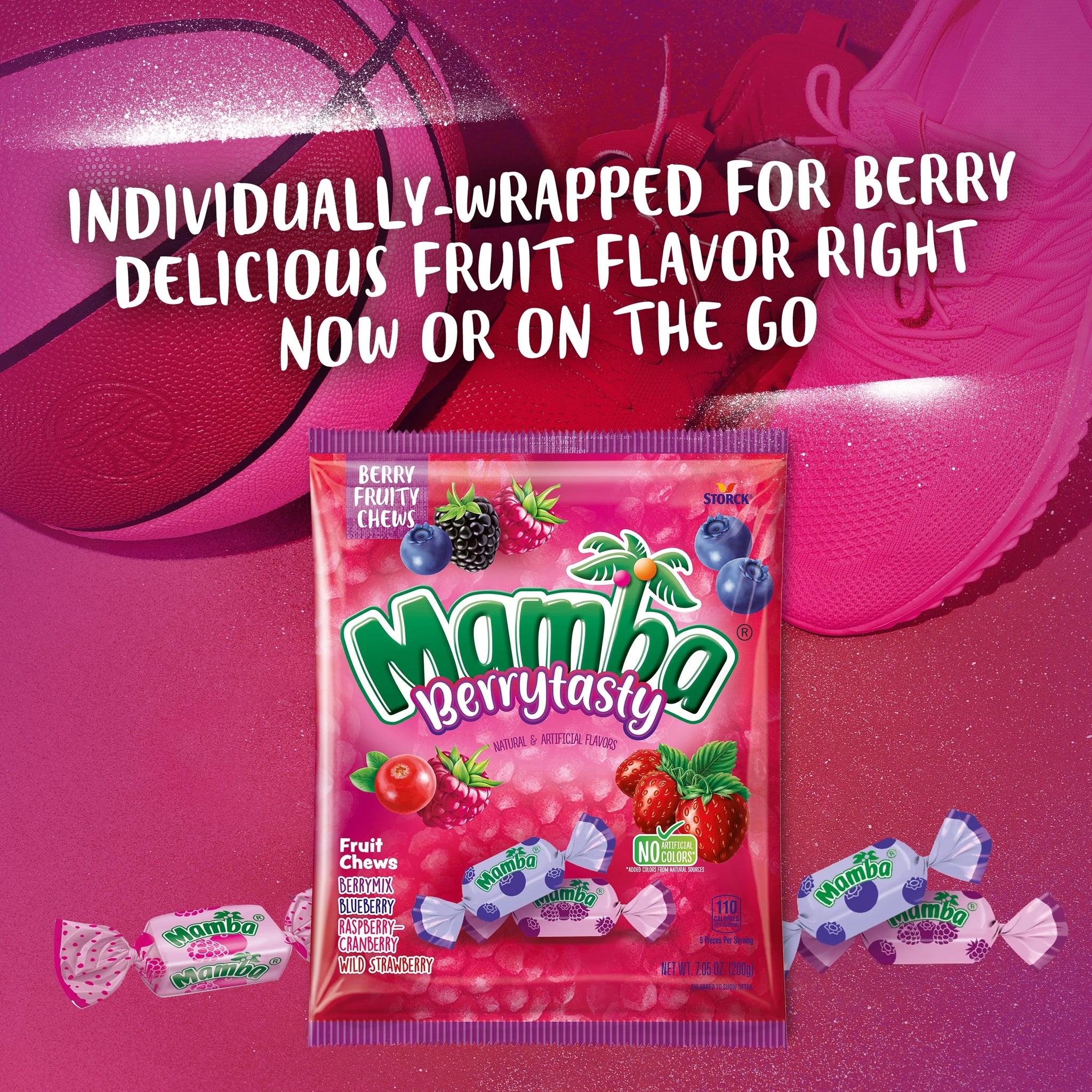 Take a beat with Mamba candy and enjoy a long lasting juicy chew with new Berry Tasty mix. This 7.05 oz. shareable bag of chewy candy contains up to four deliciously juicy flavors: Berry Mix, Blueberry, Raspberry-Cranberry, and Wild Strawberry. A delicious and fruity treat, Mamba fruity candy is a soft chewy candy with long lasting fruity flavor made with natural and artificial flavors. Each piece of chewy candy is individually wrapped to keep the candy soft and . Great for enjoying on the go or sharing with family and friends. Love Mamba Berry Tasty Fruit Chews? Try the other Mamba candy varieties: Mamba Sour Fruit Chews sour candy, Mamba Tropics Fruit Chews and Mamba Magic Sticks Fruit Chews. Contains Wheat - Shellfish-Free