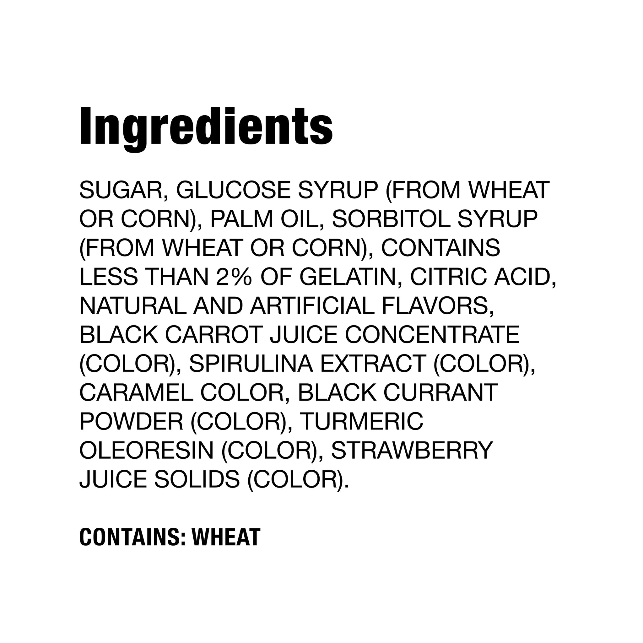 Sugar, Glucose Syrup (from Wheat or Corn), Palm Oil, Sorbitol Syrup (from Wheat or Corn), Contains Less than 2% of Gelatin, Citric Acid, Natural and Artificial Flavors, Black Carrot Juice Concentrate (Color), Spirulina Extract (Color), Caramel Color, Black Currant Powder (Color), Turmeric Oleoresin (Color), Strawberry Juice Solids (Color)./div>