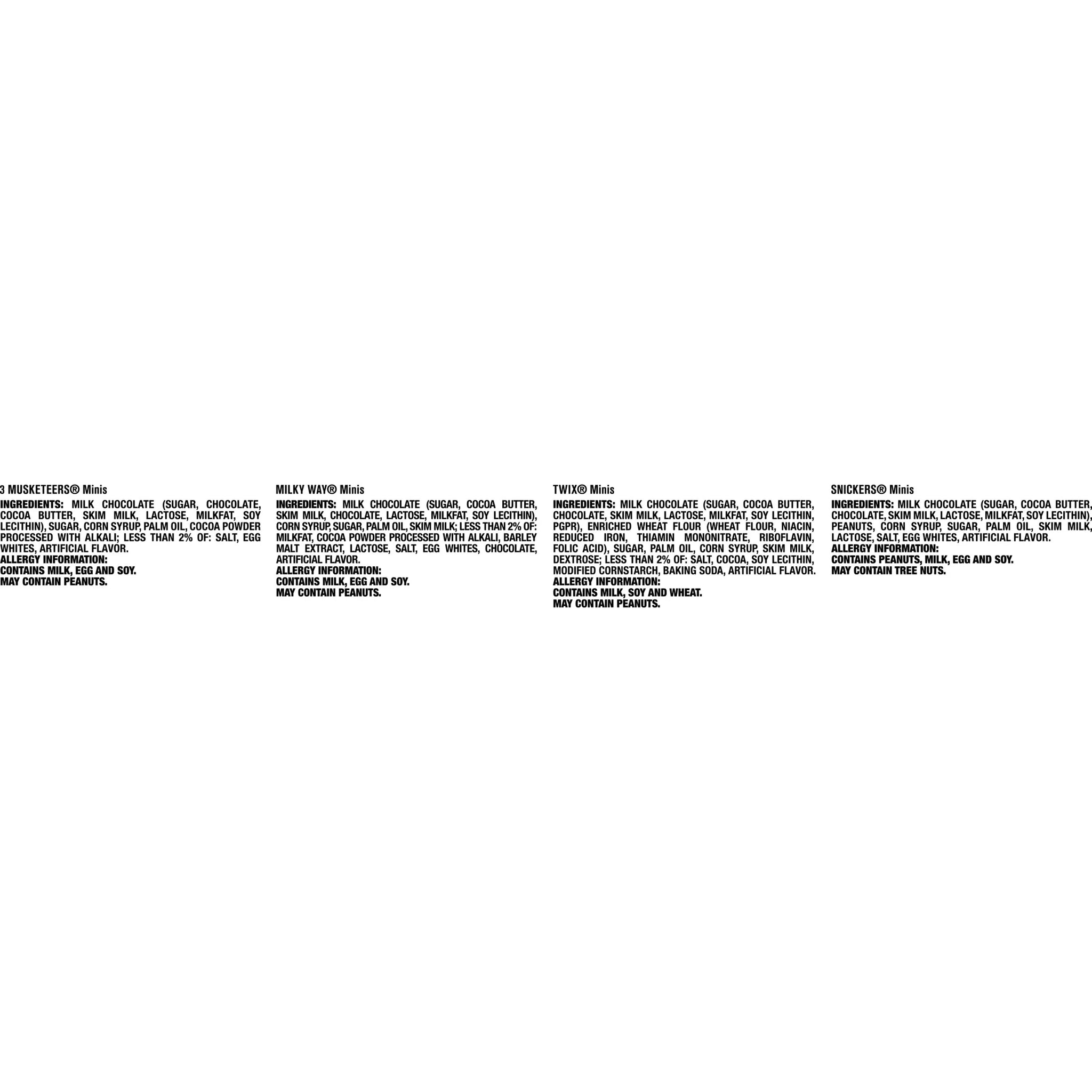 • Features a miniature assortment of SNICKERS Candy Bars, TWIX Caramel Cookie Bars, MILKY WAY Caramel Chocolate Bars, and 3 MUSKETEERS Chocolate Candy Bars