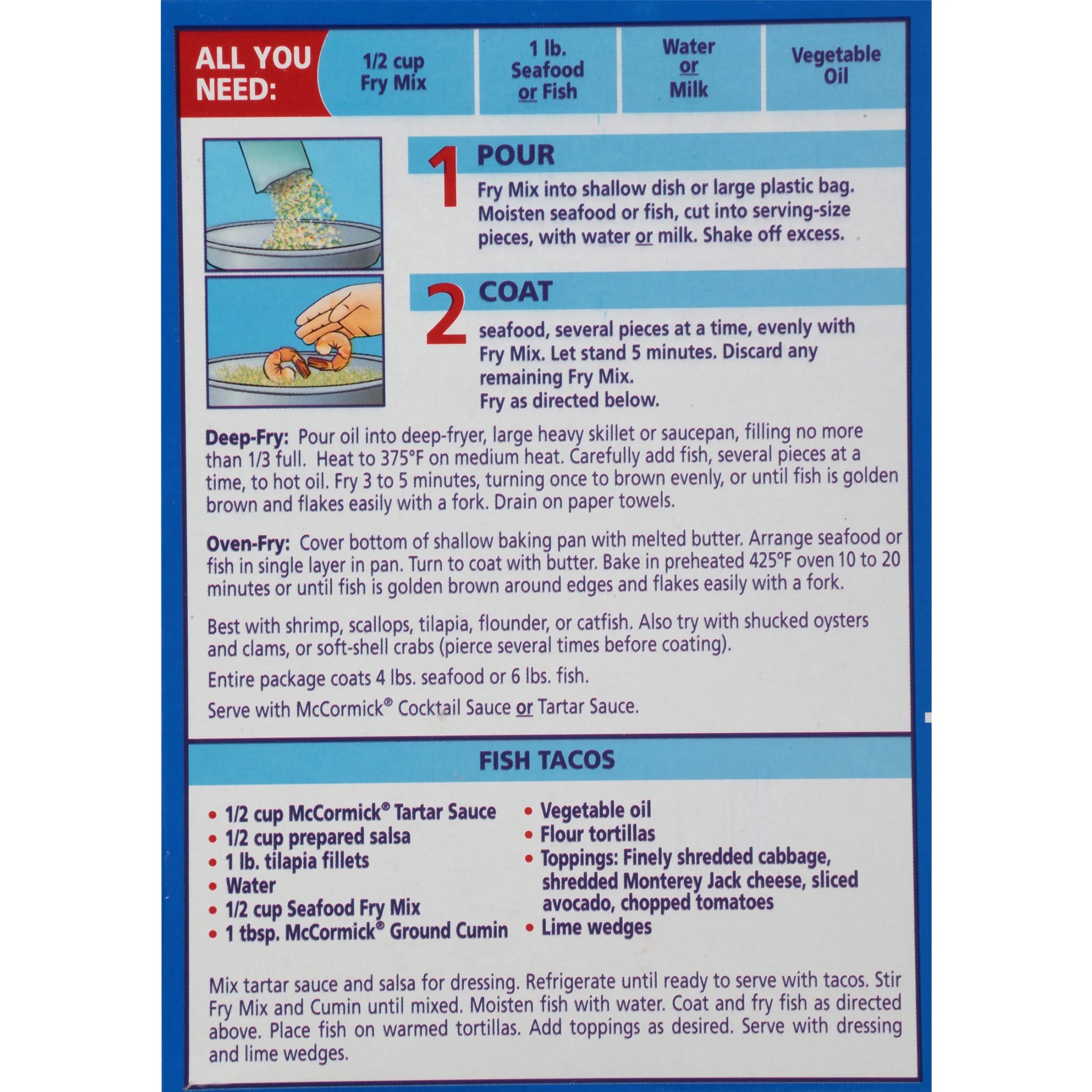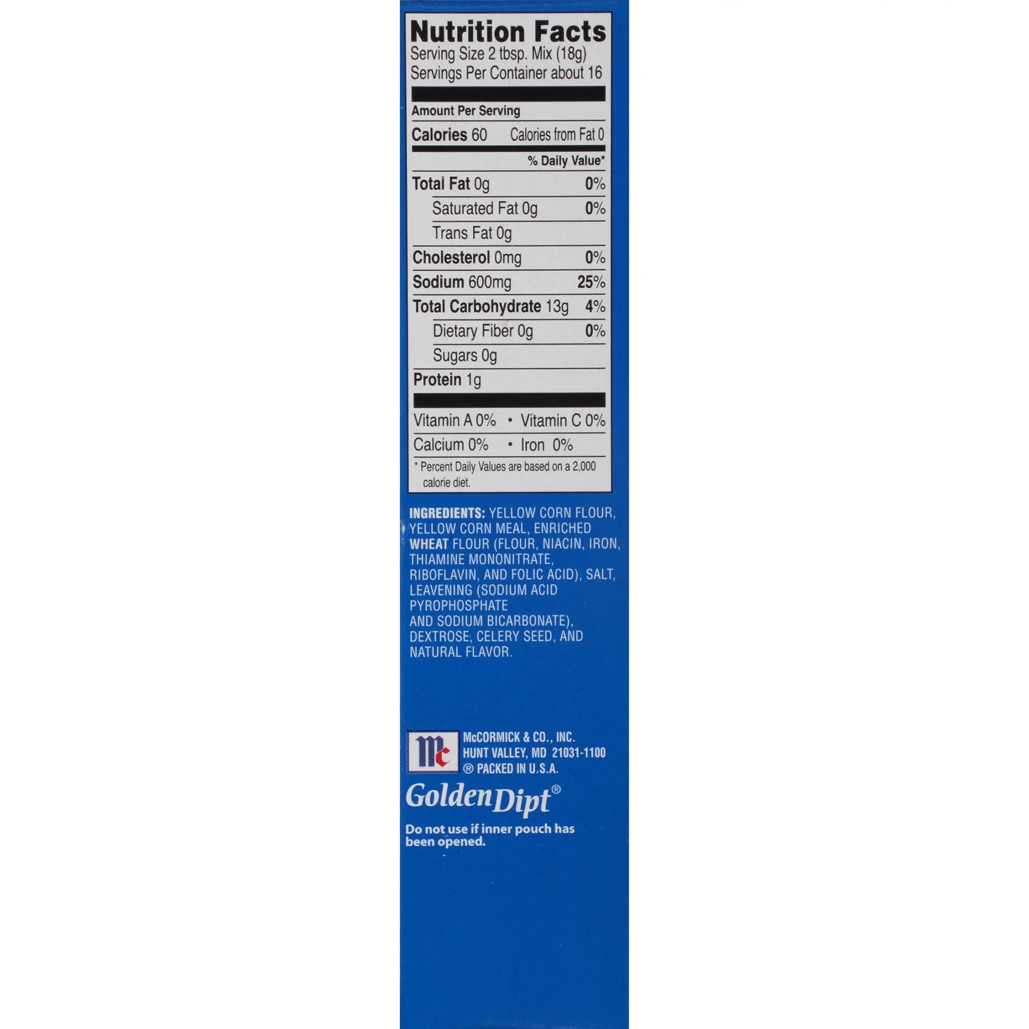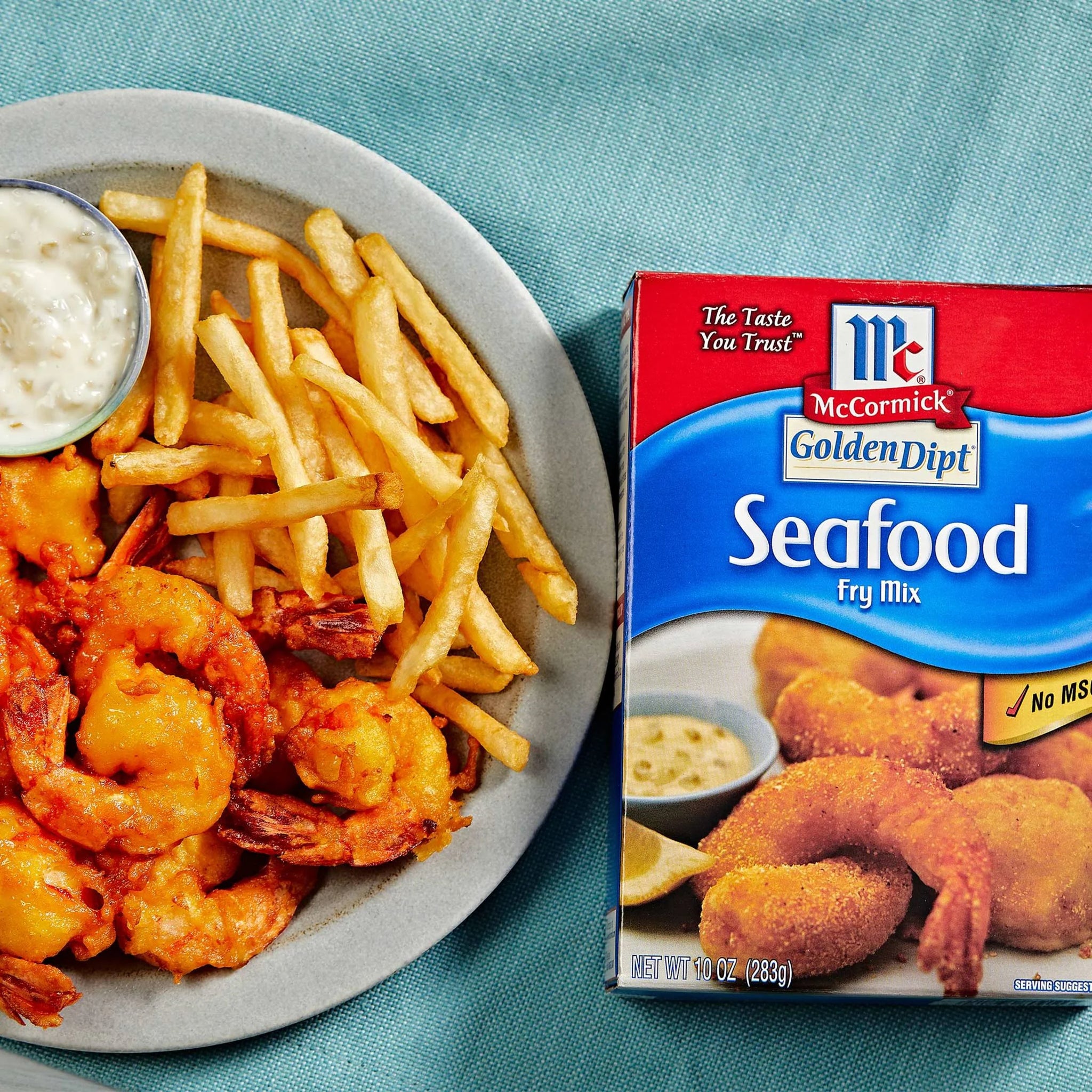 McCormick GOLDEN DIPT Seafood Fry Mix, 10 oz Box. Golden Dipt Seafood Fry Mix is made with a blend of the highest quality flours, McCormick spices and no MSG added. This seasoned breading provides a superior coating that seals in moisture and adds flavor to fried fish and seafood. Use our seafood breading to make a fish fry dinner with fish like tilapia, flounder, cod, catfish or trout. This versatile fish fry seasoning makes an easy fish sticks breading, as well as breading for shrimp, scallops, shucked oysters and clams, or soft-shell crabs. It's so easy- simply moisten seafood in water or milk, coat in the Fry Mix, then deep-fry or oven-fry until golden brown. Serving a crowd? Use the entire package to coat 4 lbs. seafood or 6 lbs. fish and serve with McCormick Cocktail Sauce or Tartar Sauce. This McCormick GOLDEN DIPT Seafood Fry Mix is in a Cardboard box that is 10 ounces. Store this shelf-stable item at an ambient temperature.
