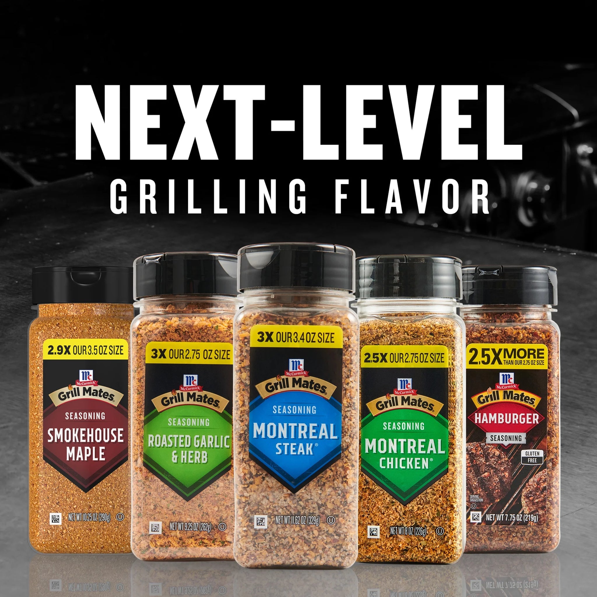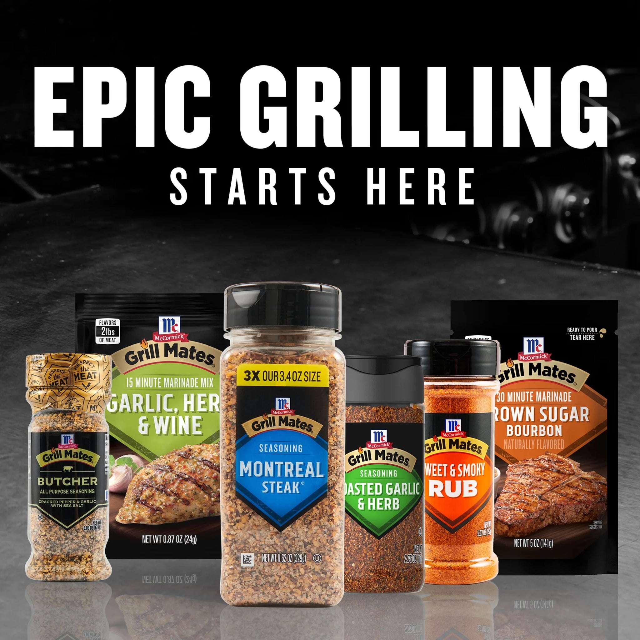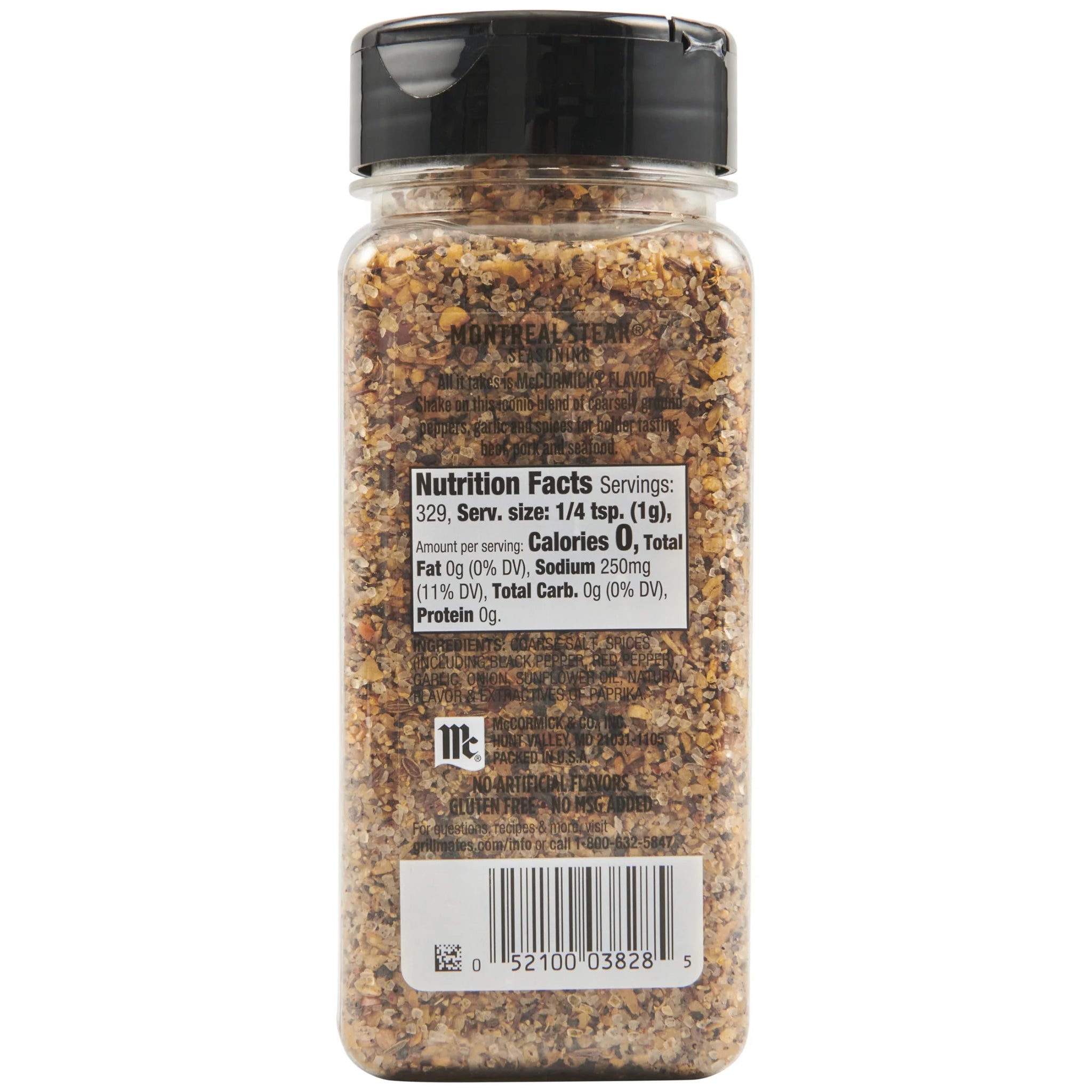 McCormick GRILL MATES Gluten Free Montreal Steak Seasoning, 11.62 oz Bottle. Knock dinner out of the park with a shake of McCormick Grill Mates Montreal Steak Seasoning. Made with spices coarsely ground peppers, garlic, and spices, Montreal Steak Seasoning adds bold, iconic flavor to steaks, burgers, and pork with every shake of the bottle.When you're grilling, tenderizing, or roasting your meats, Montreal Steak is the only way to go. The coarser texture creates a craveable crust on the grill, sealing juices and flavor inside. For a mouthwatering crust with Montreal Steak, start with a 1” or thicker cut of beef. Preheat your grill to 400-500 degrees Fahrenheit (high heat!) and coat with a dry rub like Montreal Steak before quickly searing.With three times more seasoning than our 3.4 oz size bottle you'll always have delicious flavor on hand. Gluten free with no artificial flavors and no MSG, Montreal Steak is flavor you can feel good about serving your family and friends. All it takes is just one tablespoon of seasoning per pound of meat to turn a simple meal into a mouthwatering event. This McCormick GRILL MATES Montreal Steak Seasoning is in a Plastic bottle that is 11.62 ounces. Store this shelf-stable item at an ambient temperature.