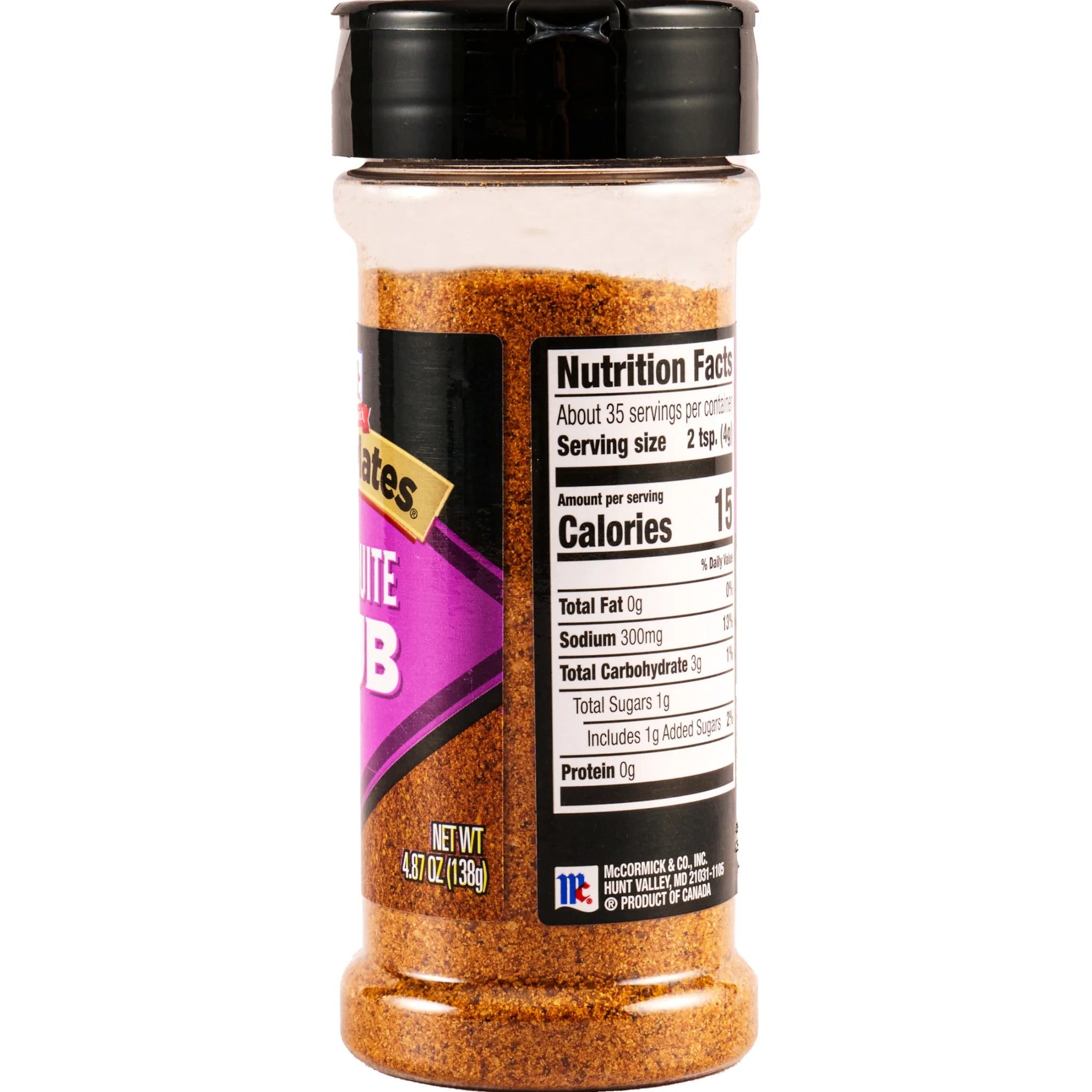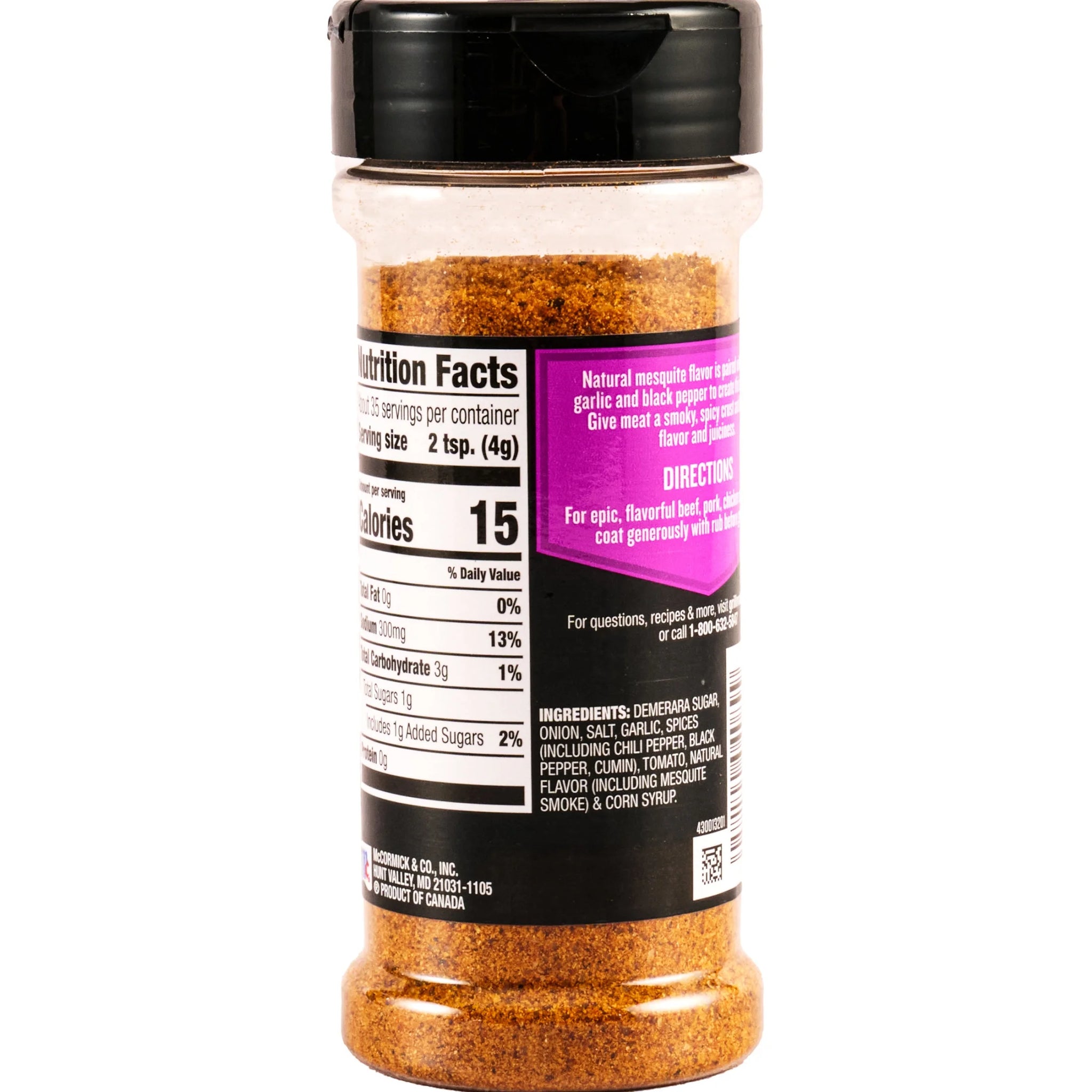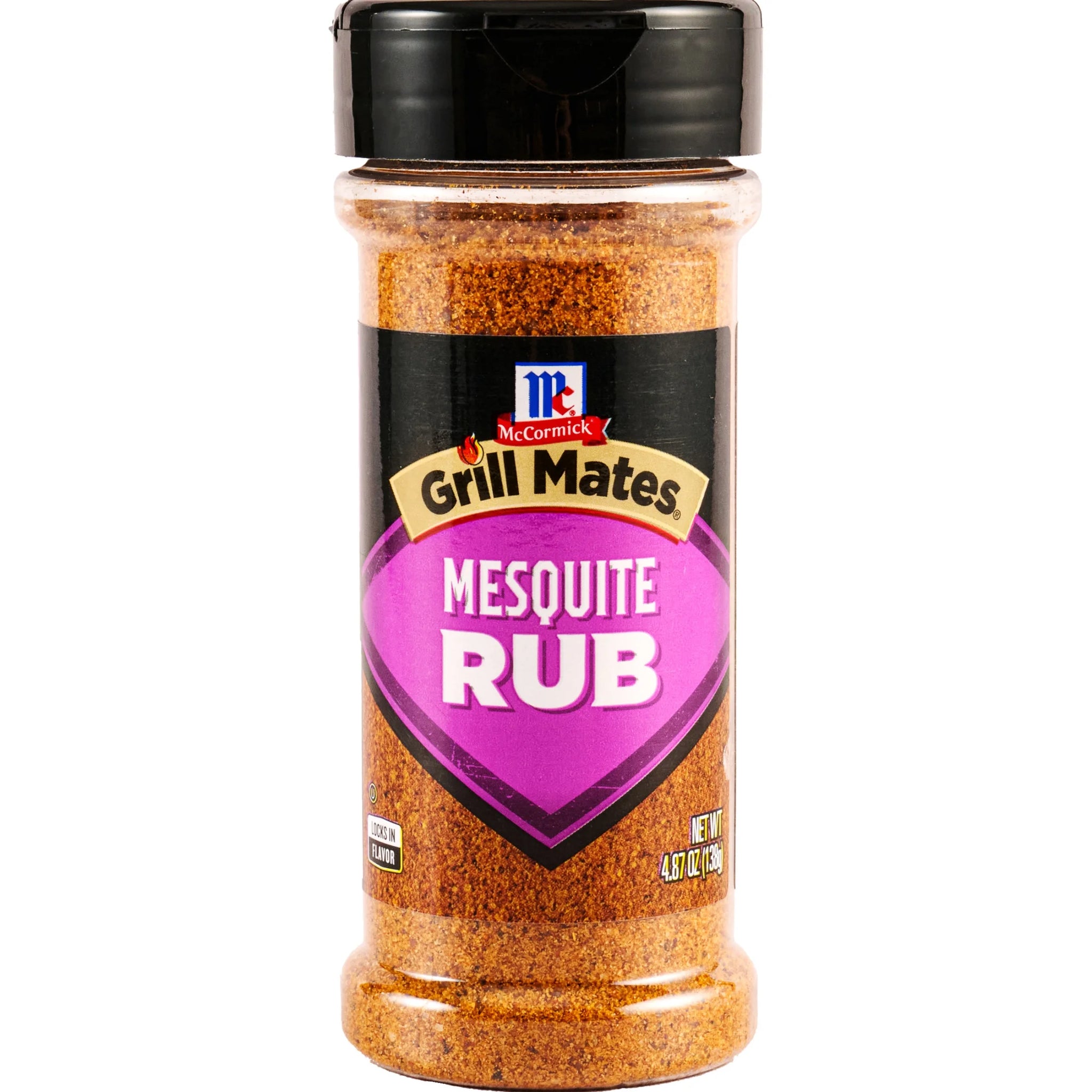 McCormick Grill Mates Mesquite Rub, 4.87 oz Bottle. Spice up dinner time with a robust blend of onion, peppers and mesquite smoke. For smoky, bold flavor, Grill Mates Mesquite Rub is a must. When it comes to America’s #1 grilling seasoning, the taste does the talking -- you do the grilling. Our bottle is designed with a dual flip-cap to shake or sprinkle flavor with a wide mouth for a measuring. Shake this rub onto whatever you’re grillin next, whether it’s beef, pork, chicken or seafood, you’re the master of the grill. Just 8 tbsp to 1 whole chicken breast locks in juicy flavor with a smoky, spicy crust. Applied at the grill or as an overnight marinade, it’s absorbed directly into the meat as it heats up, leaving you with a tender, tasty, flavor-crusted meal every time. This McCormick Grill Mates Mesquite Rub is in a Plastic bottle that is 4.87 ounces. Store this shelf-stable item at an ambient temperature.