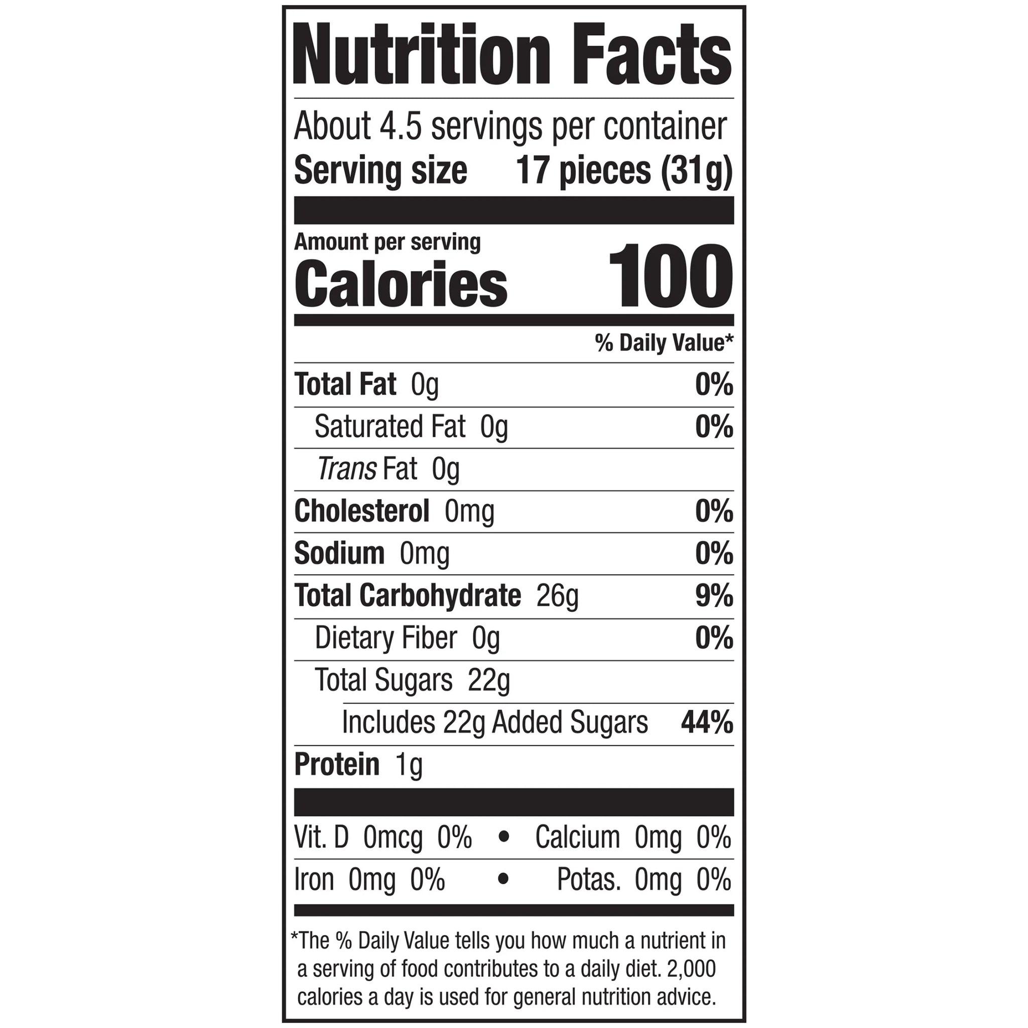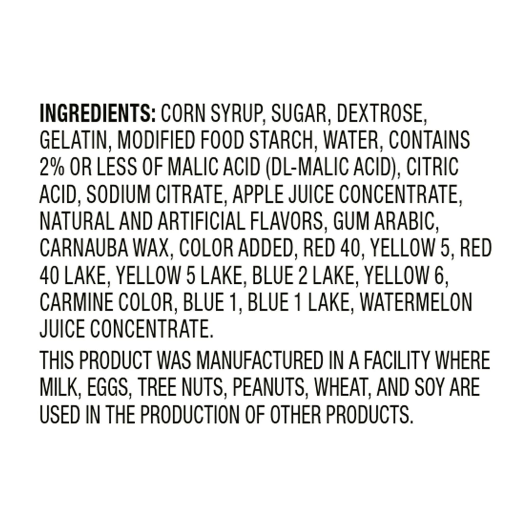 Corn Syrup, Sugar, Dextrose, Gelatin, Modified Food Starch, 2% or Less of Malic Acid, Citric Acid, Sodium Citrate, Natural and Artificial Flavors, Apple Juice Concentrate, Acacia (Gum Arabic), Carnauba Wax, Carmine Color, Color Added, Blue 1, Blue 1 Lake, Blue 2 Lake, Red 40, Red 40 Lake, Yellow 5, Yellow 5 Lake, Yellow 6./div>