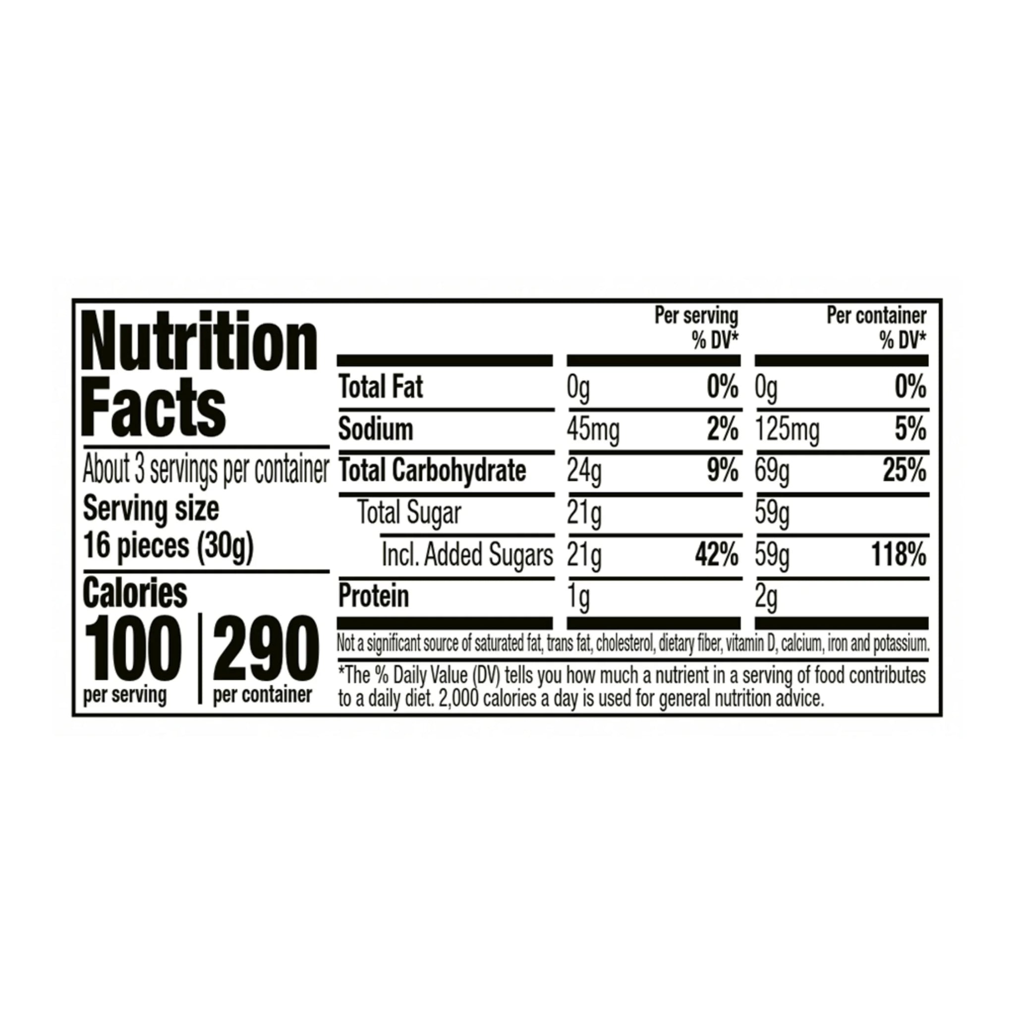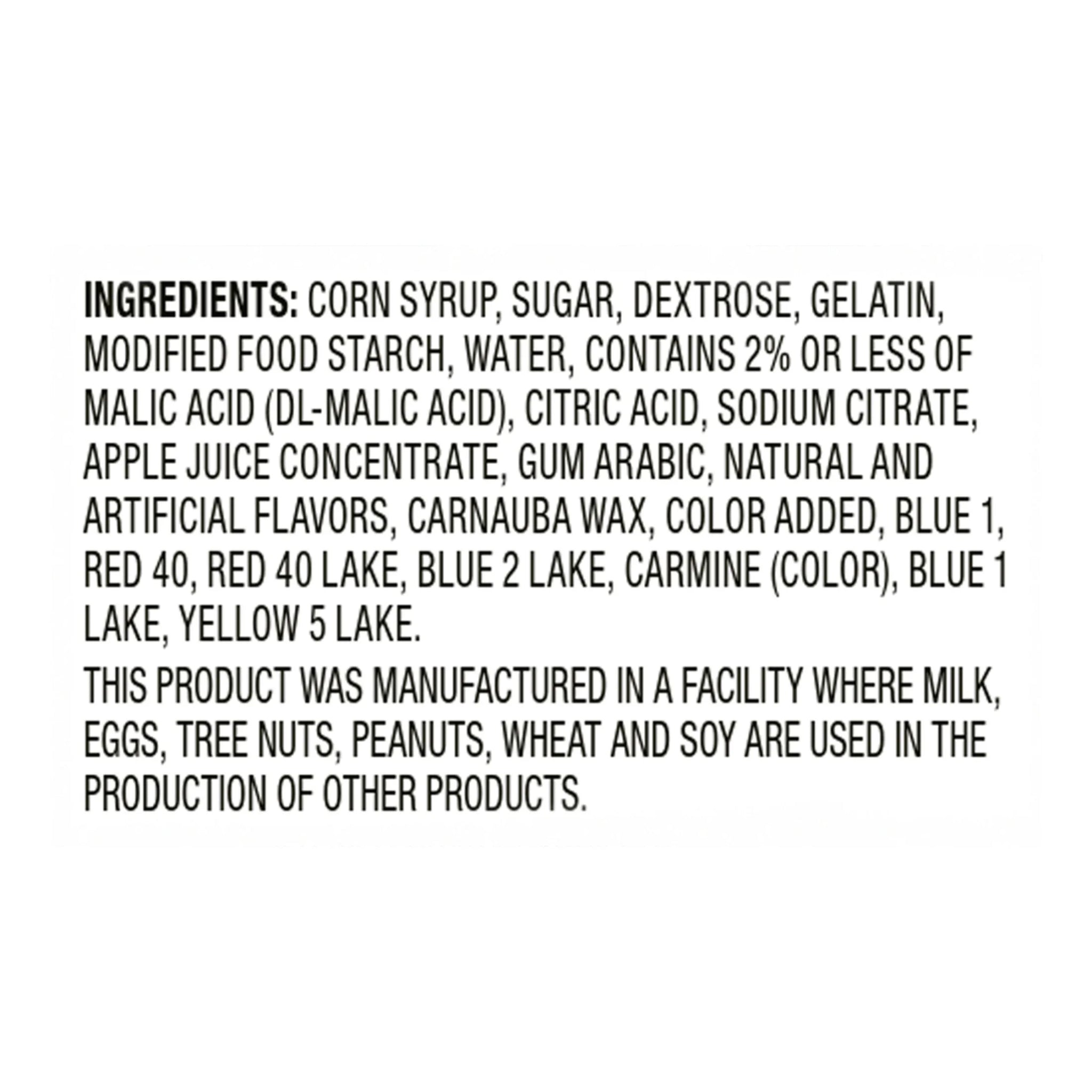 Dextrose, Sugar, Corn Syrup, Modified Corn Starch, Gelatin, Contains 2% or Less of Malic Acid, Citric Acid, Sodium Citrate, Apple Juice Concentrate, Acacia (Gum Arabic), Natural and Artificial Flavors, Carnauba Wax, Color Added, Blue 1, Red 40, Red 40 Lake, Blue 2 Lake, Carmine (Color), Blue 1 Lake, Yellow 5 Lake./div>