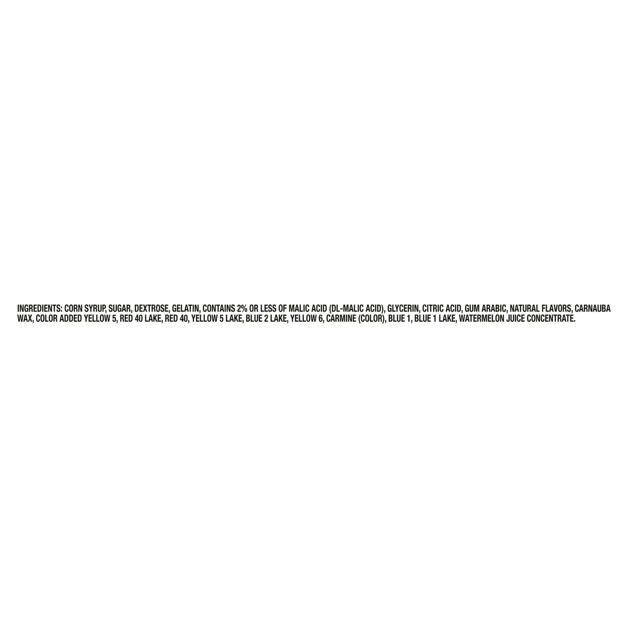 Dextrose, Sugar, Corn Syrup, 2% or Less of Malic Acid, Gelatin, Glycerin, Natural Flavors, Confectioner's Glaze (Lac-Resin), Citric Acid, Carnauba Wax, Carmine Color, Color Added, Blue 1, Blue 1 Lake, Blue 2 Lake, Red 40, Red 40 Lake, Yellow 5, Yellow 5 Lake, Yellow 6./div>