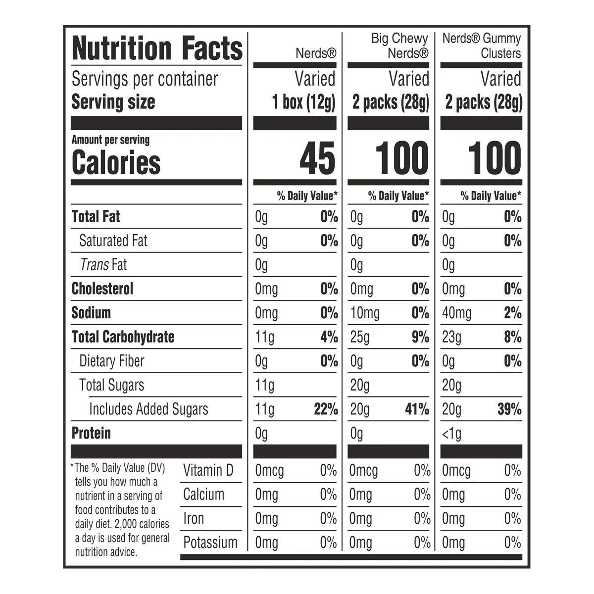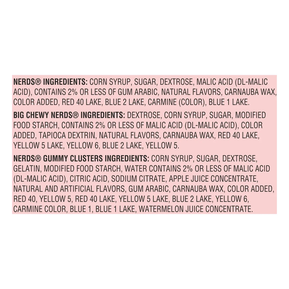 Nerds: Corn Syrup, Sugar, Dextrose, Malic Acid (DL-Malic Acid), Contains 2% or Less of Gum Arabic, Natural Flavors, Carnauba Wax, Color Added, Red 40 Lake, Blue 2 Lake, Carmine (Color), Blue 1 Lake. Big Chewy Nerds: Dextrose, Corn Syrup, Sugar, Modified Food Starch, Contains 2% or Less of Malic Acid (DL-Malic Acid), Color Added, Tapioca Dextrin, Natural Flavors, Carnauba Wax, Red 40 Lake, Yellow 5 Lake, Yellow 6, Blue 2 Lake, Yellow 5. Nerds Gummy Clusters: Corn Syrup, Sugar, Dextrose, Gelatin, Modified Food Starch, Water Contains 2% or Less of Malic Acid (DL-Malic Acid), Citric Acid, Sodium Citrate, Apple Juice Concentrate, Natural and Artificial Flavors, Gum Arabic, Carnauba Wax, Color Added, Red 40, Yellow 5, Red 40 Lake, Yellow 5 Lake, Blue 2 Lake, Yellow 6, Carmine Color, Blue 1, Blue 1 Lake, Watermelon Juice Concentrate./div>