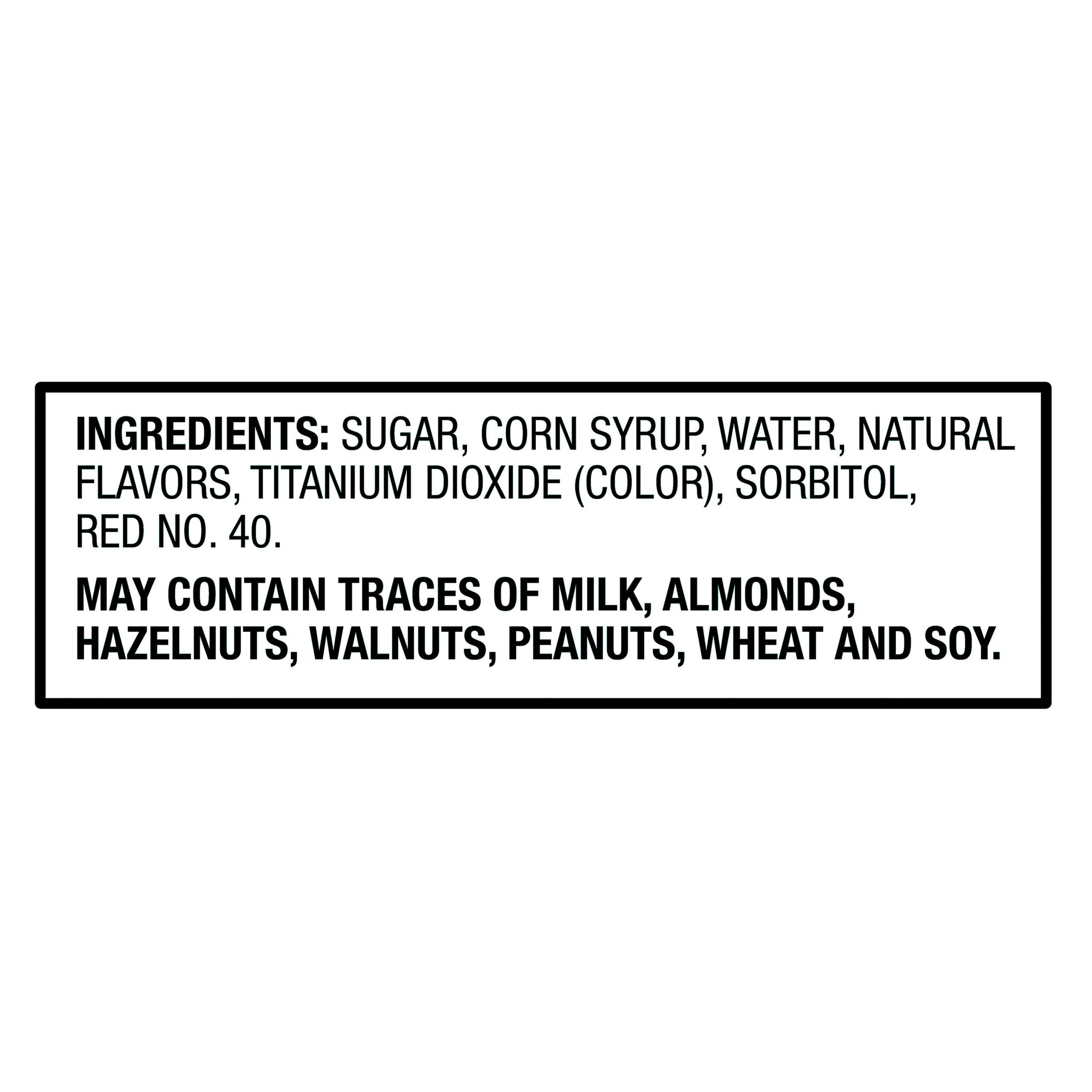 SUGAR, CORN SYRUP, WATER, NATURAL FLAVORS, TITANIUM DIOXIDE (COLOR), SORBITOL, RED NO. 40./div>
