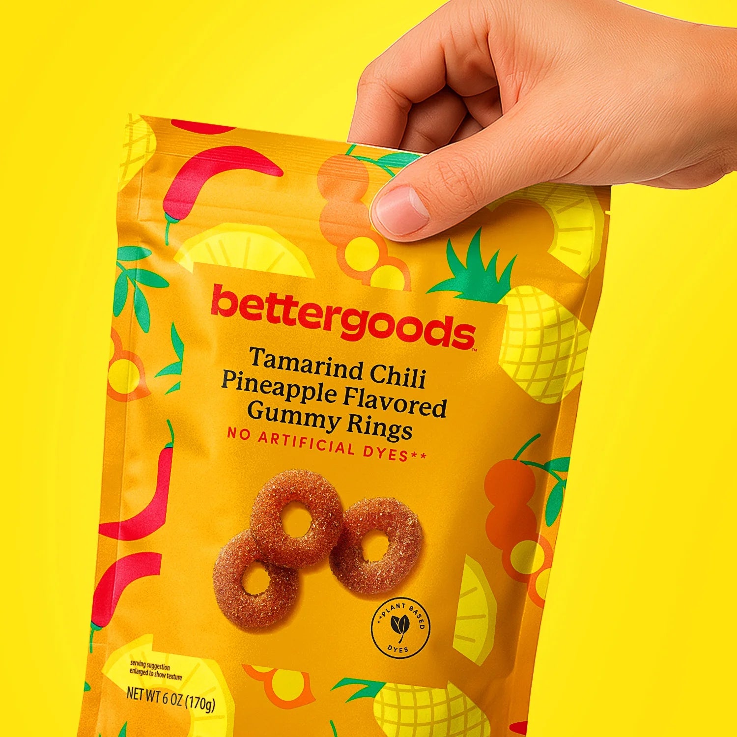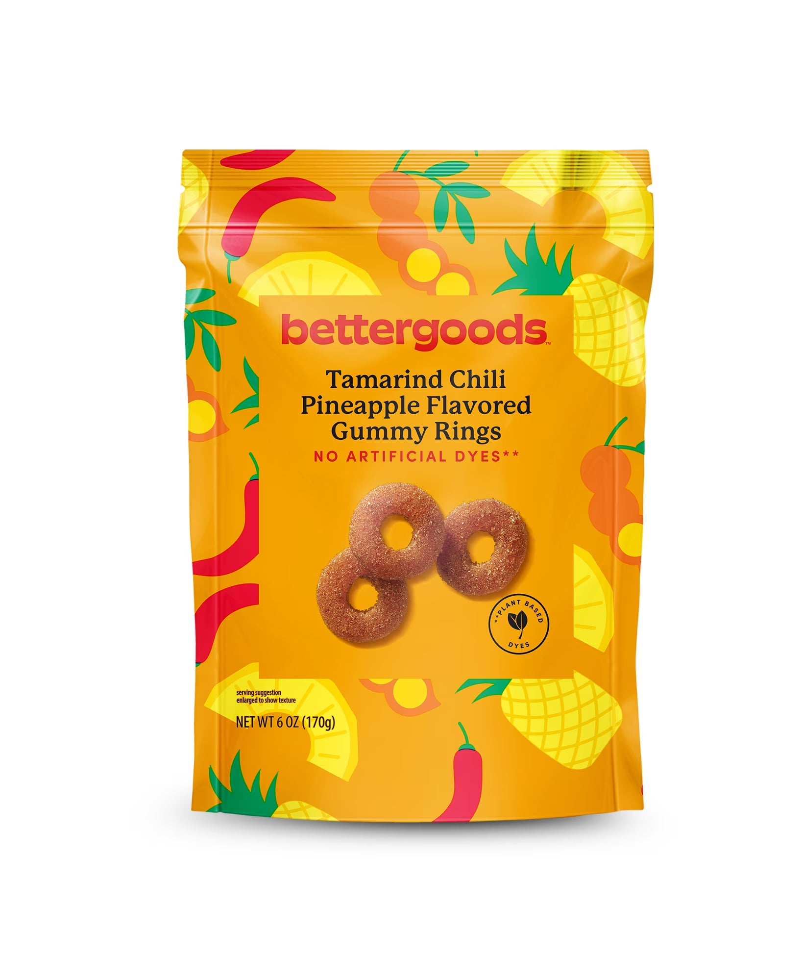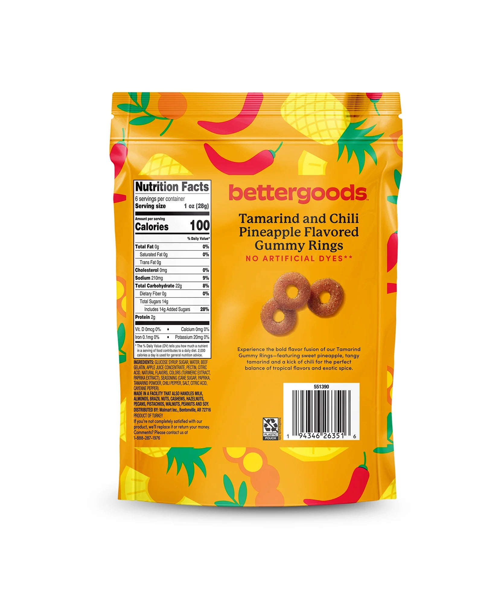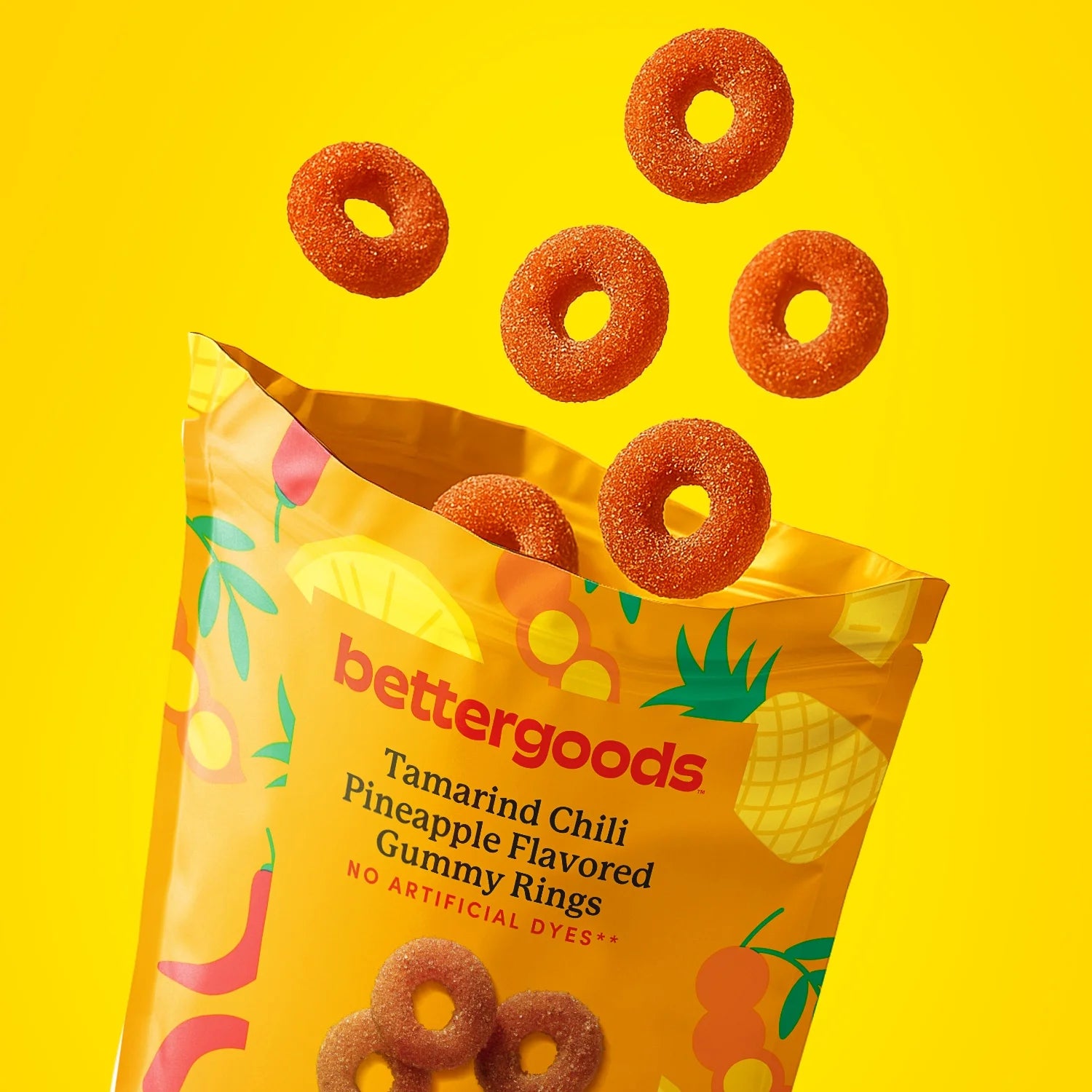 Experience the bold flavor fusion of our bettergoods Tamarind and Chili Pineapple Flavored Gummy Rings -- featuring sweet pineapple, tangy tamarind, and a kick of chili for the perfect balance of tropical flavors and exotic spice. Made with plant-based dyes, these treats offer a unique and vibrant taste experience. Share them at your next gathering with friends, or enjoy them during a cozy movie night with family for a delightful twist. Tropical, sweet, and spicy are just a few words to describe our Pineapple Chili Tamarind Gummy Rings, but words can't truly capture the spicy explosion of flavors in every bite.