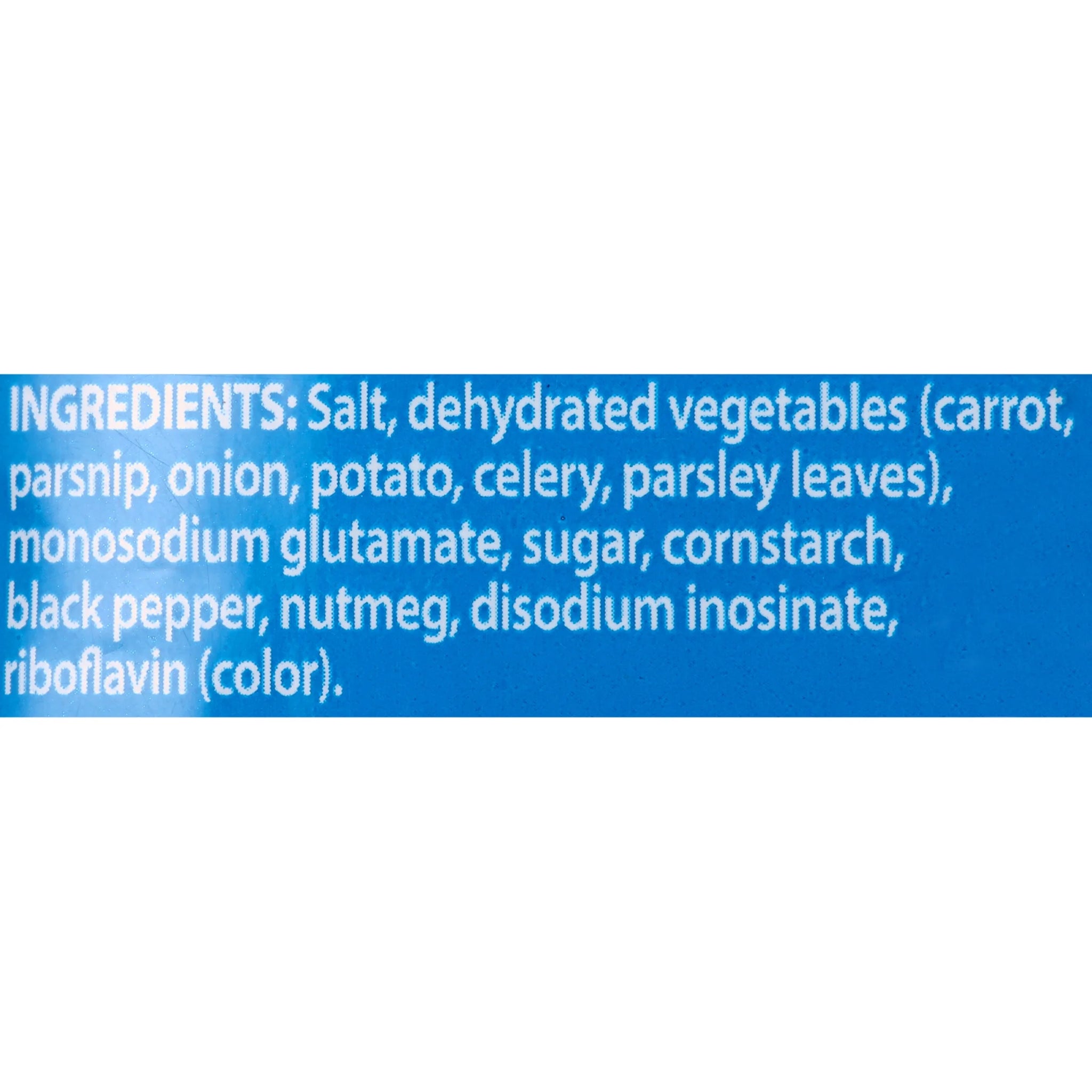 Salt, Dehydrated Vegetables (Carrots, Parsnip, Onion, Potato, Celery, Parsley Leaves), Monosodium Glutamate, Sugar, Cornstarch, Black Pepper, Nutmeg, Disodium Inosinate, Riboflavin (Color)./div>