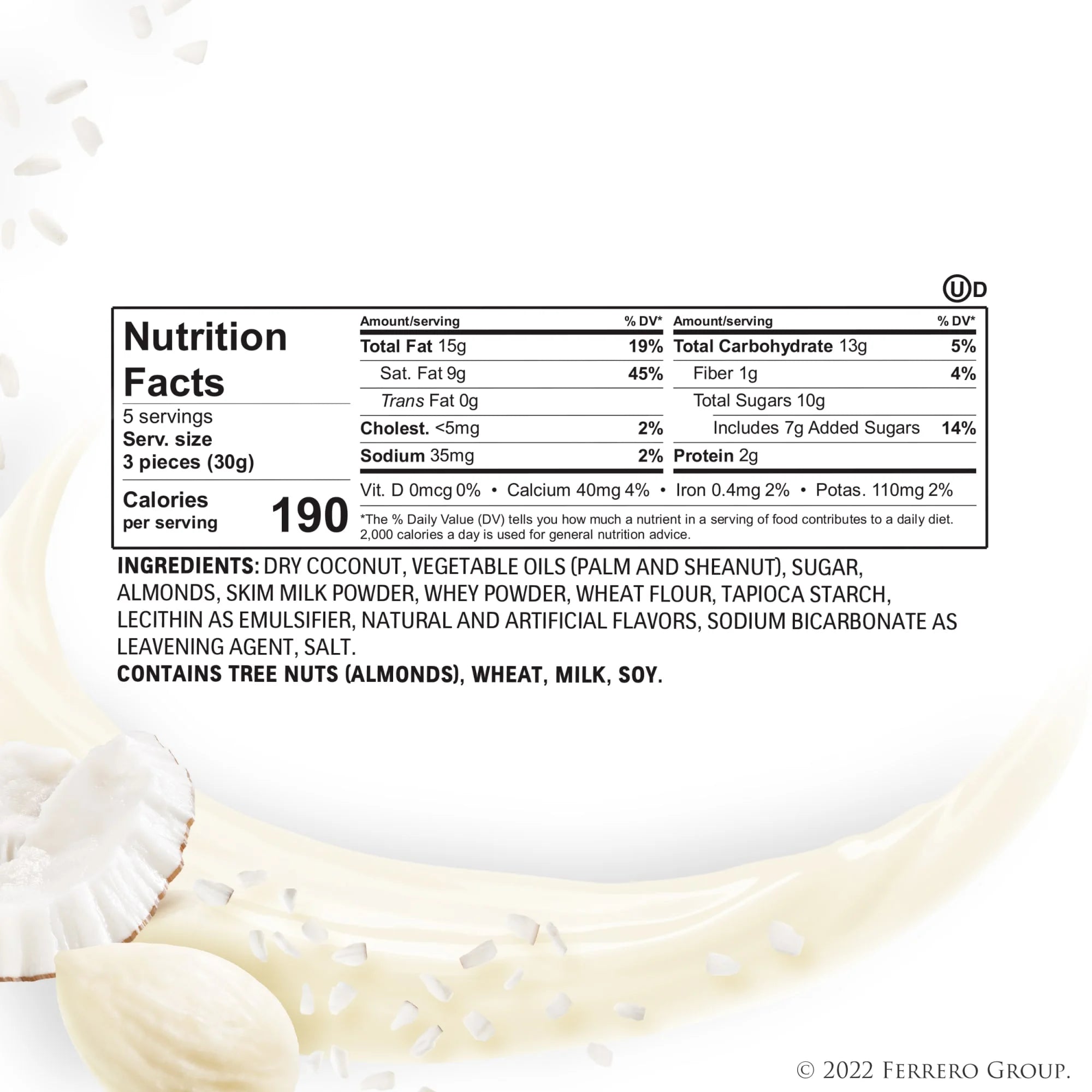 • COCONUT, MILK CREAM and WHITE ALMOND: A precious heart of white almond enveloped in a deliciously creamy filling, all enclosed in a crispy wafer shell and covered with fragrant coconut flakes