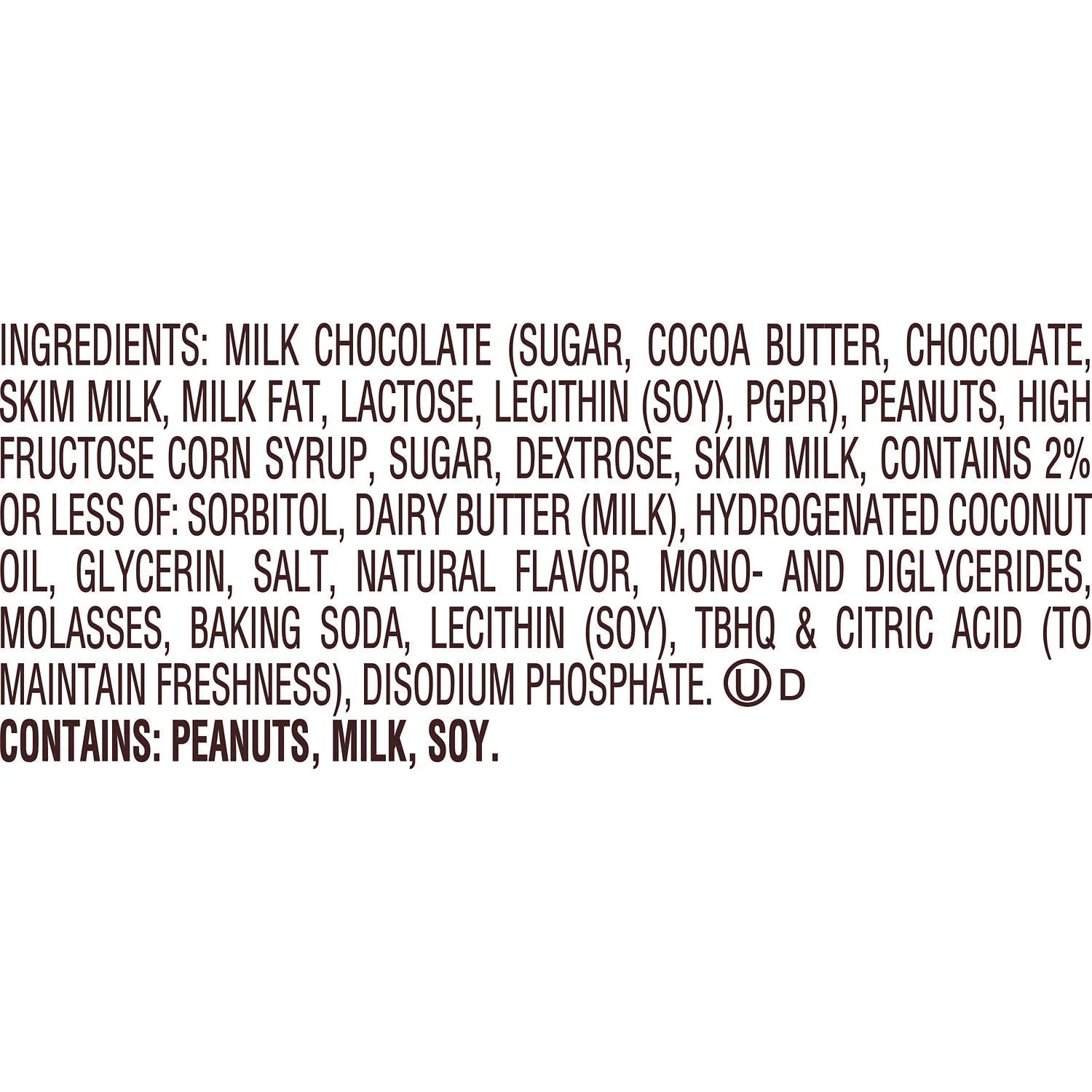 MILK CHOCOLATE (SUGAR, COCOA BUTTER, CHOCOLATE, SKIM MILK, MILK FAT, LACTOSE, LECITHIN (SOY), PGPR), PEANUTS, HIGH FRUCTOSE CORN SYRUP, SUGAR, DEXTROSE, SKIM MILK, CONTAINS 2% OR LESS OF: SORBITOL, DAIRY BUTTER (MILK), HYDROGENATED COCONUT OIL, GLYCERIN, SALT, NATURAL FLAVOR, MONO- AND DIGLYCERIDES, MOLASSES, BAKING SODA, LECITHIN (SOY), TBHQ & CITRIC ACID (TO MAINTAIN FRESHNESS), DISODIUM PHOSPHATE./div>