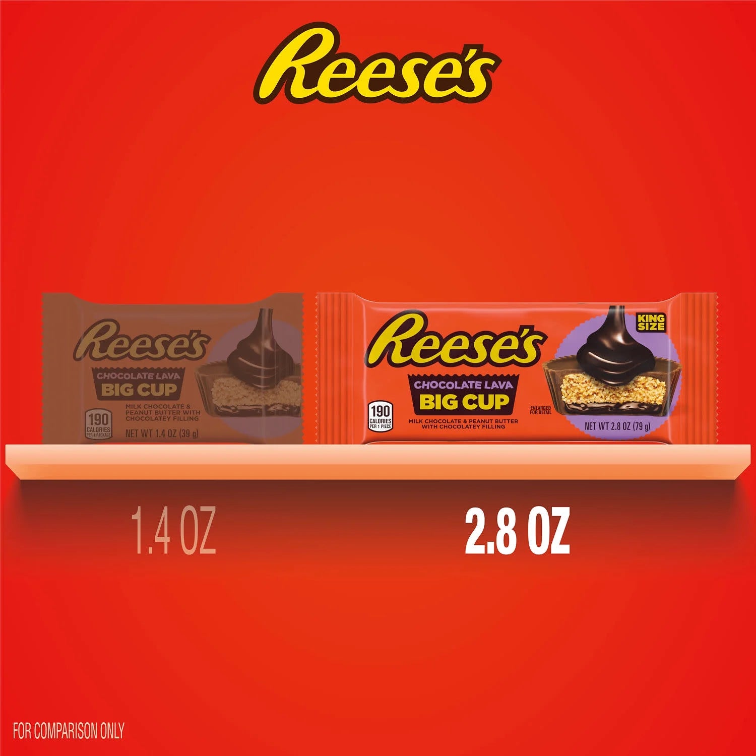 - Contains one (1) 2.8-ounce pack of REESE'S Big Cup Chocolate Lava Milk Chocolate King Size Peanut Butter Cups Candy
