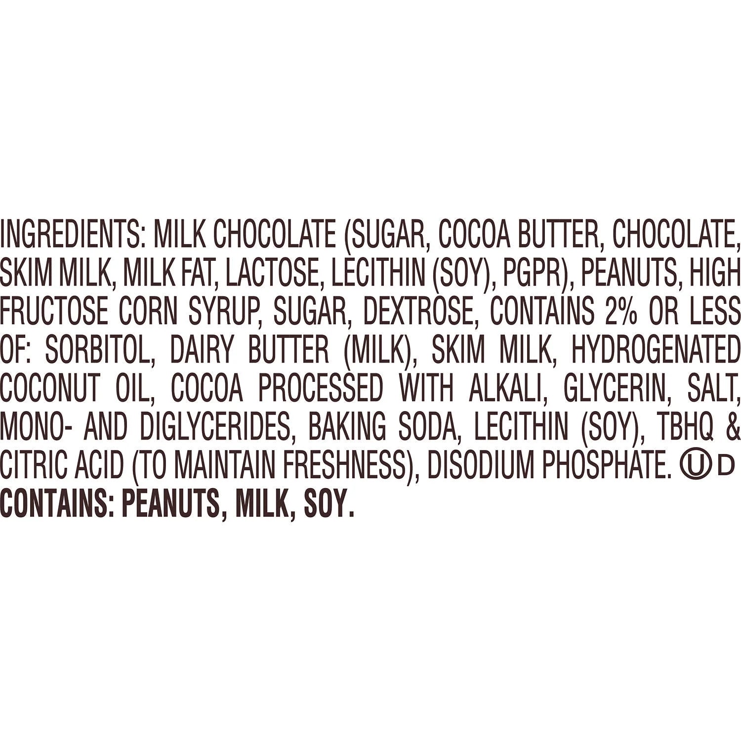 MILK CHOCOLATE (SUGAR, COCOA BUTTER, CHOCOLATE, SKIM MILK, MILK FAT, LACTOSE, LECITHIN (SOY), PGPR), PEANUTS, HIGH FRUCTOSE CORN SYRUP, SUGAR, DEXTROSE, CONTAINS 2% OR LESS OF: SORBITOL, DAIRY BUTTER (MILK), SKIM MILK, HYDROGENATED COCONUT OIL, COCOA PROCESSED WITH ALKALI, GLYCERIN, SALT, MONO- AND DIGLYCERIDES, BAKING SODA, LECITHIN (SOY), TBHQ & CITRIC ACID (TO MAINTAIN FRESHNESS), DISODIUM PHOSPHATE./div>