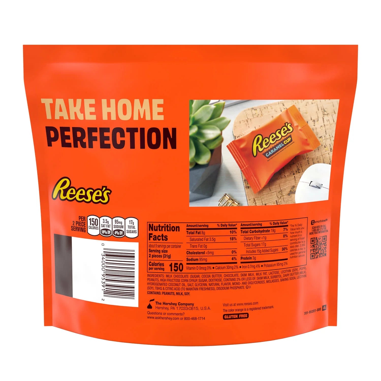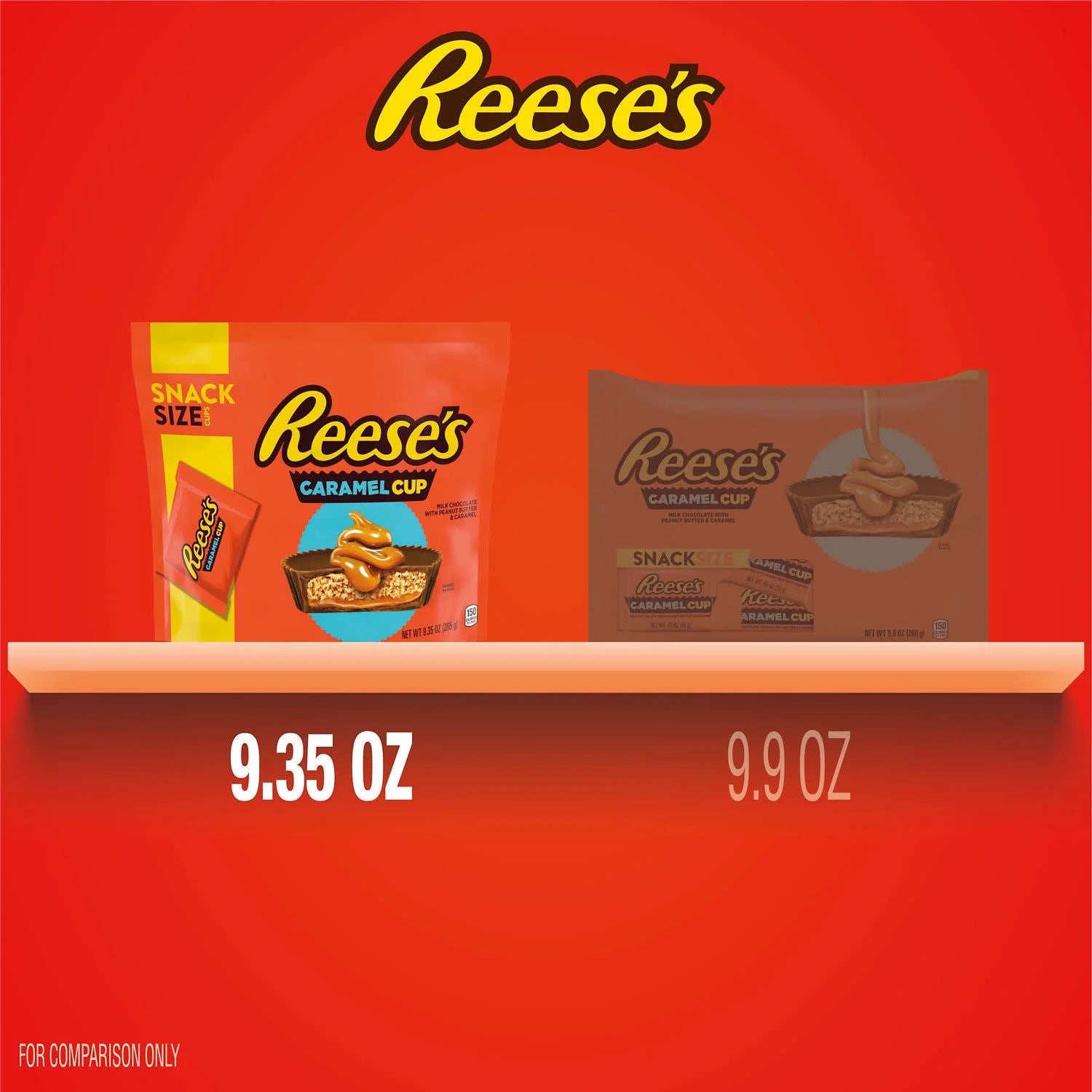 - Contains one (1) 9.35-ounce bag of REESE'S Caramel Milk Chocolate Snack Size Peanut Butter Cups Candy