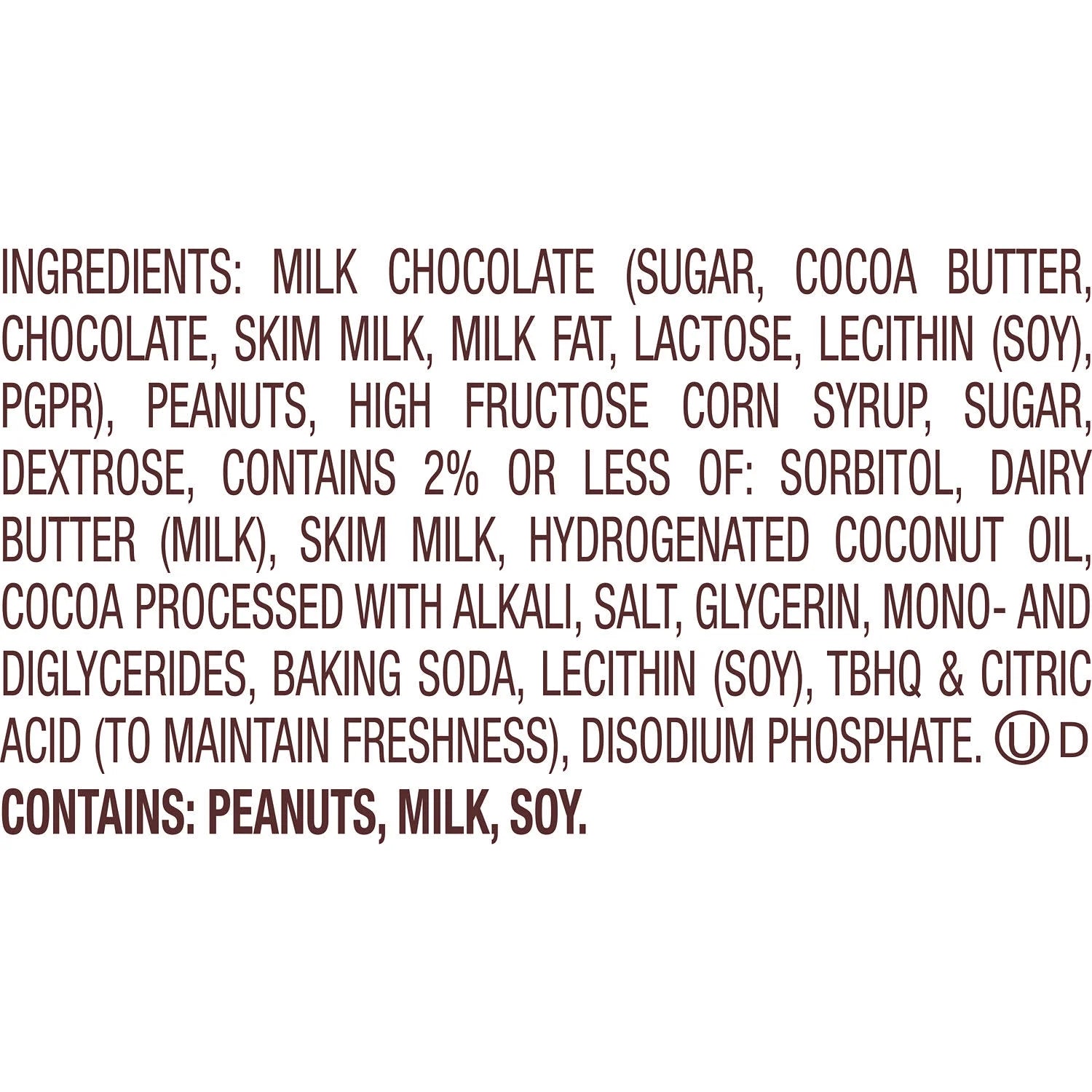 MILK CHOCOLATE (SUGAR, COCOA BUTTER, CHOCOLATE, SKIM MILK, MILK FAT, LACTOSE, LECITHIN (SOY), PGPR), PEANUTS, HIGH FRUCTOSE CORN SYRUP, SUGAR, DEXTROSE, CONTAINS 2% OR LESS OF: SORBITOL, DAIRY BUTTER (MILK), SKIM MILK, HYDROGENATED COCONUT OIL, COCOA PROCESSED WITH ALKALI, SALT, GLYCERIN, MONO- AND DIGLYCERIDES, BAKING SODA, LECITHIN (SOY), TBHQ & CITRIC ACID (TO MAINTAIN FRESHNESS), DISODIUM PHOSPHATE./div>