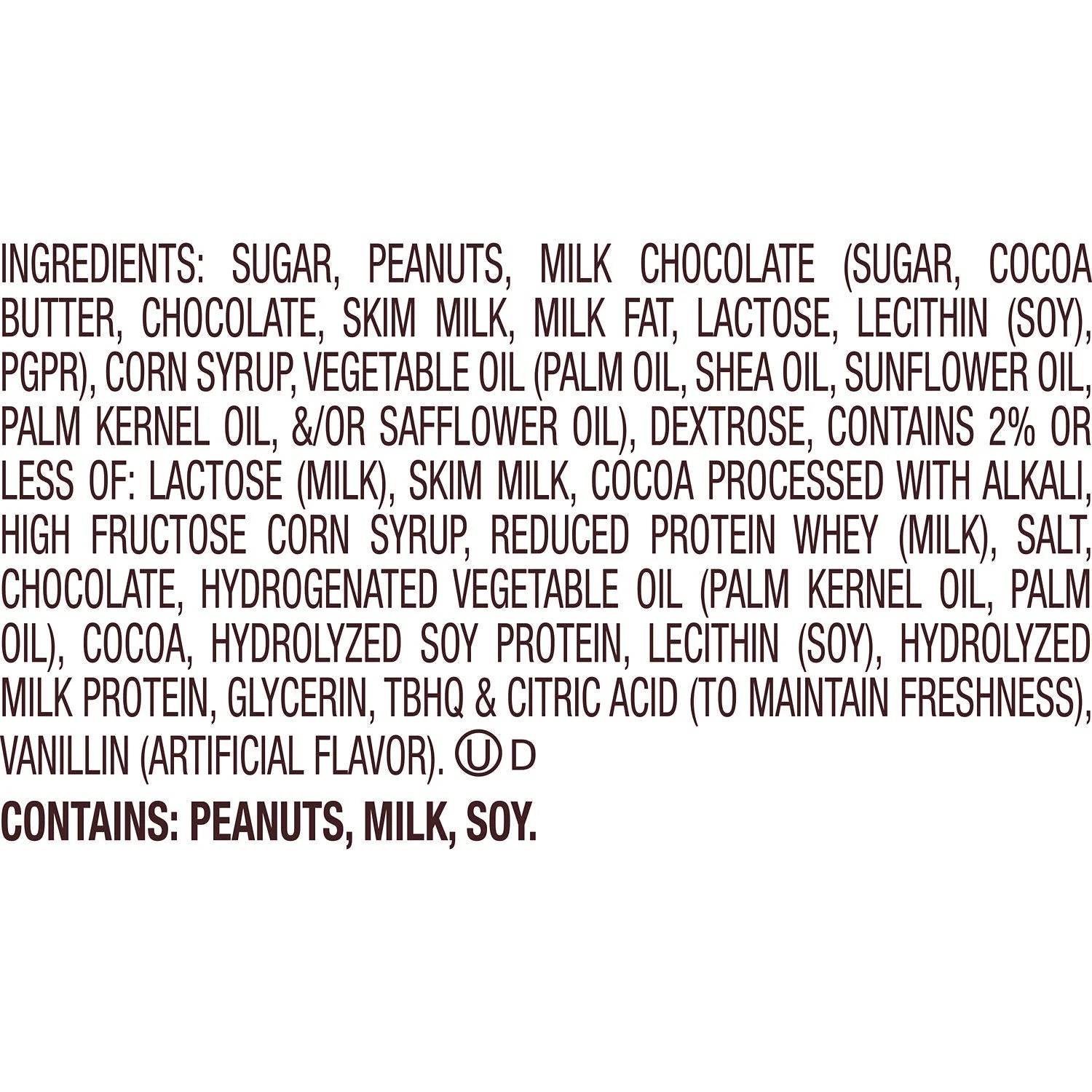 SUGAR, PEANUTS, CORN SYRUP, VEGETABLE OIL (PALM OIL, SHEA OIL, SUNFLOWER OIL, PALM KERNEL OIL, &/OR SAFFLOWER OIL), DEXTROSE, LACTOSE (MILK), CONTAINS 2% OR LESS OF: HIGH FRUCTOSE CORN SYRUP, REDUCED PROTEIN WHEY (MILK), SKIM MILK, CHOCOLATE, COCOA PROCESSED WITH ALKALI, SALT, COCOA, HYDROGENATED VEGETABLE OIL (PALM KERNEL OIL, PALM OIL), LECITHIN (SOY), HYDROLYZED SOY PROTEIN, HYDROLYZED MILK PROTEIN, GLYCERIN, VANILLIN (ARTIFICIAL FLAVOR), TBHQ & CITRIC ACID (TO MAINTAIN FRESHNESS)/div>