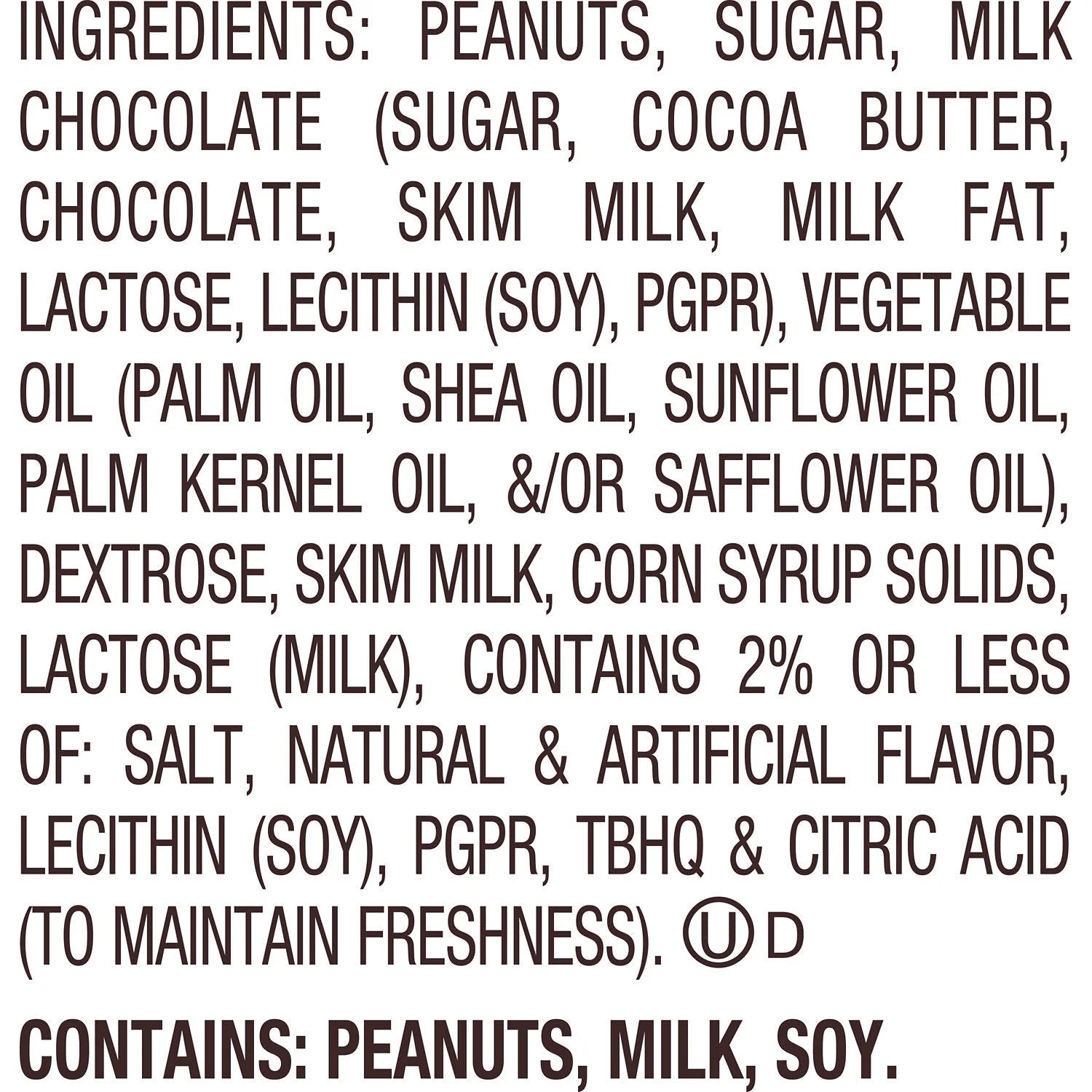 PEANUTS, SUGAR, MILK CHOCOLATE (SUGAR, COCOA BUTTER, CHOCOLATE, SKIM MILK, MILK FAT, LACTOSE, LECITHIN (SOY), PGPR), VEGETABLE OIL (PALM OIL, SHEA OIL, SUNFLOWER OIL, PALM KERNEL OIL, &/OR SAFFLOWER OIL), DEXTROSE, SKIM MILK, CORN SYRUP SOLIDS, LACTOSE (MILK), CONTAINS 2% OR LESS OF: SALT, NATURAL & ARTIFICIAL FLAVOR, LECITHIN (SOY), PGPR, TBHQ & CITRIC ACID (TO MAINTAIN FRESHNESS)./div>