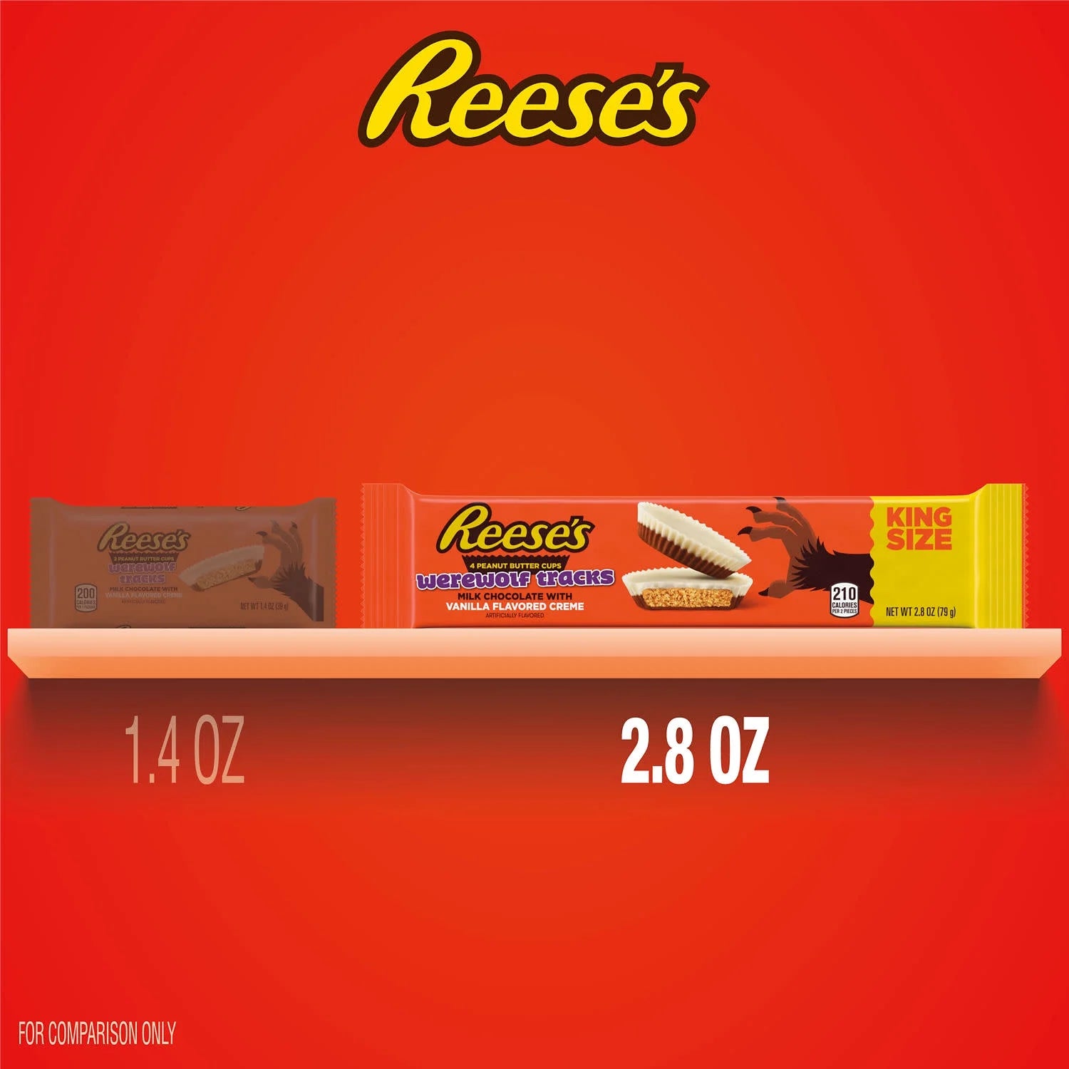 - Contains one (1) 2.8-ounce pack of REESE'S Werewolf Tracks Milk Chocolate with Vanilla Flavored Creme King Size Peanut Butter Cups Candy