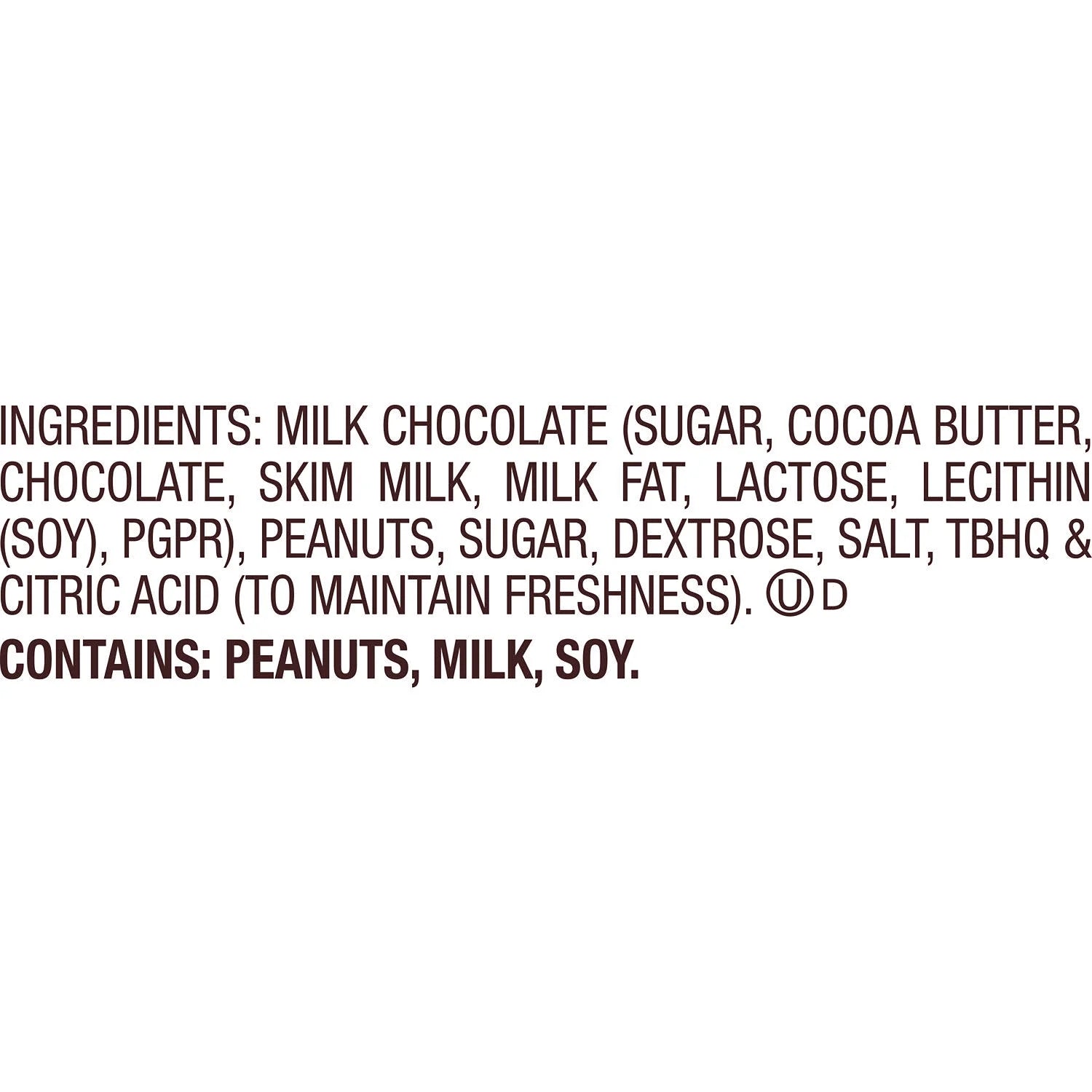 MILK CHOCOLATE (SUGAR, COCOA BUTTER, CHOCOLATE, SKIM MILK, MILK FAT, LACTOSE, LECITHIN (SOY), PGPR), PEANUTS, SUGAR, DEXTROSE, SALT, TBHQ & CITRIC ACID (TO MAINTAIN FRESHNESS)./div>