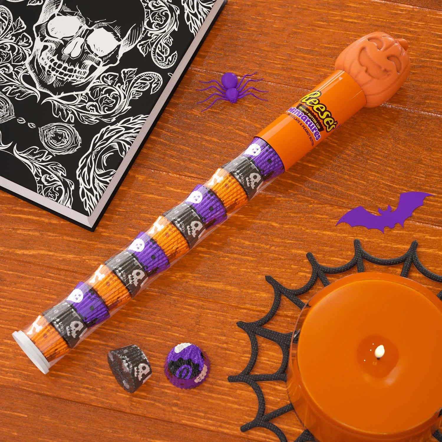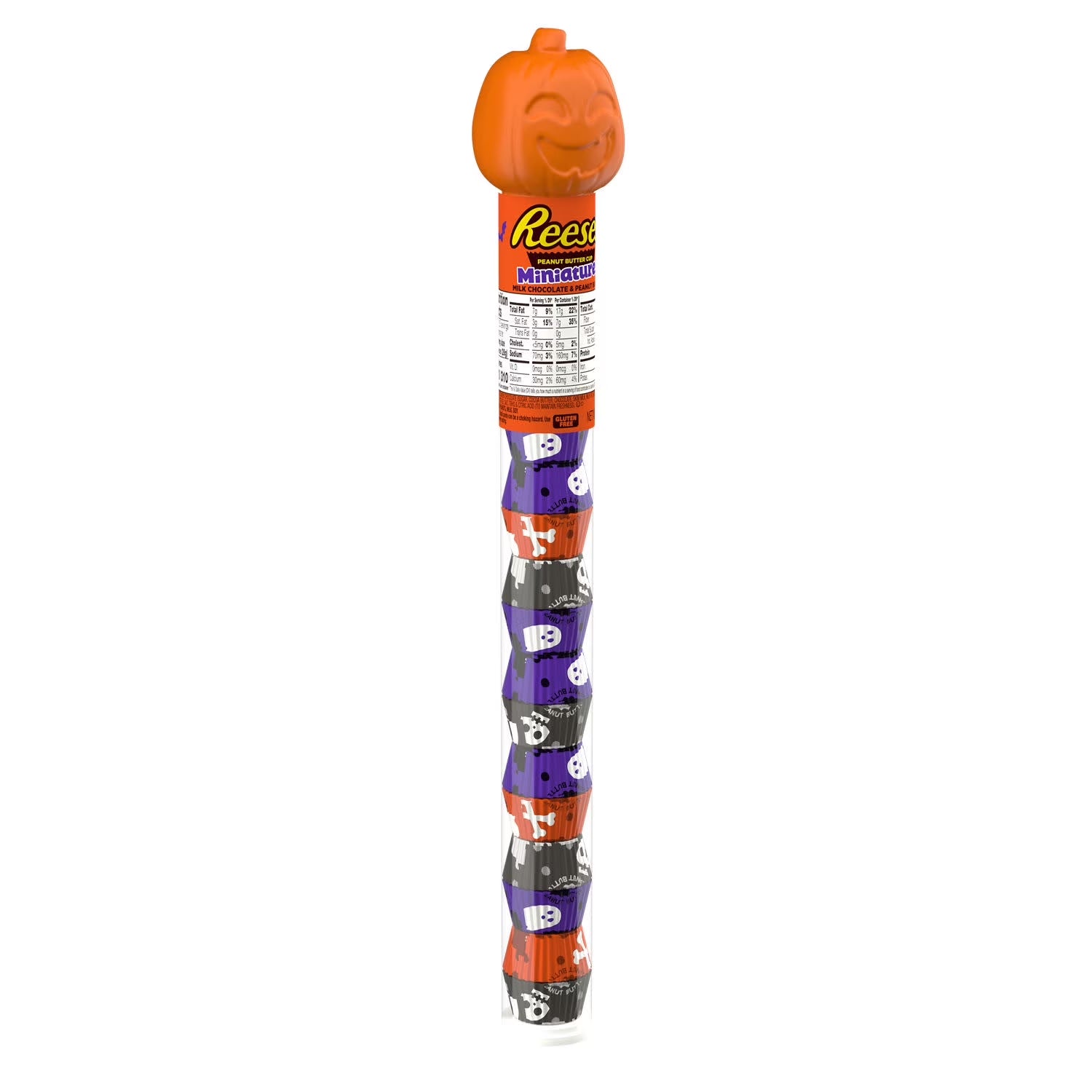 Don't let their small size fool you: REESE'S Miniatures milk chocolate peanut butter cups candies are huge on chocolate and peanut butter taste. Prepare for trick or treaters, costume party guests and your own family movie nights with these plastic canes of REESE'S Halloween miniature candies. These kosher and gluten free sweets are the first Halloween candy everyone goes for in the candy bowl, right? Place a few miniature candies in lunch boxes or treat a loved one to this entire pumpkin topped plastic cane full of milk chocolate peanut butter flavor. You can even share individually wrapped milk chocolate peanut butter cups during fall sporting events, birthday parties and every moment in between.
