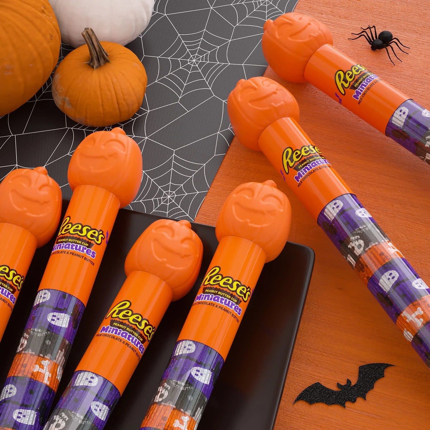 • Pop these plastic canes full of REESE'S Miniatures milk chocolate peanut butter cups into Halloween candy party bags or hand them out at trunk or treat events