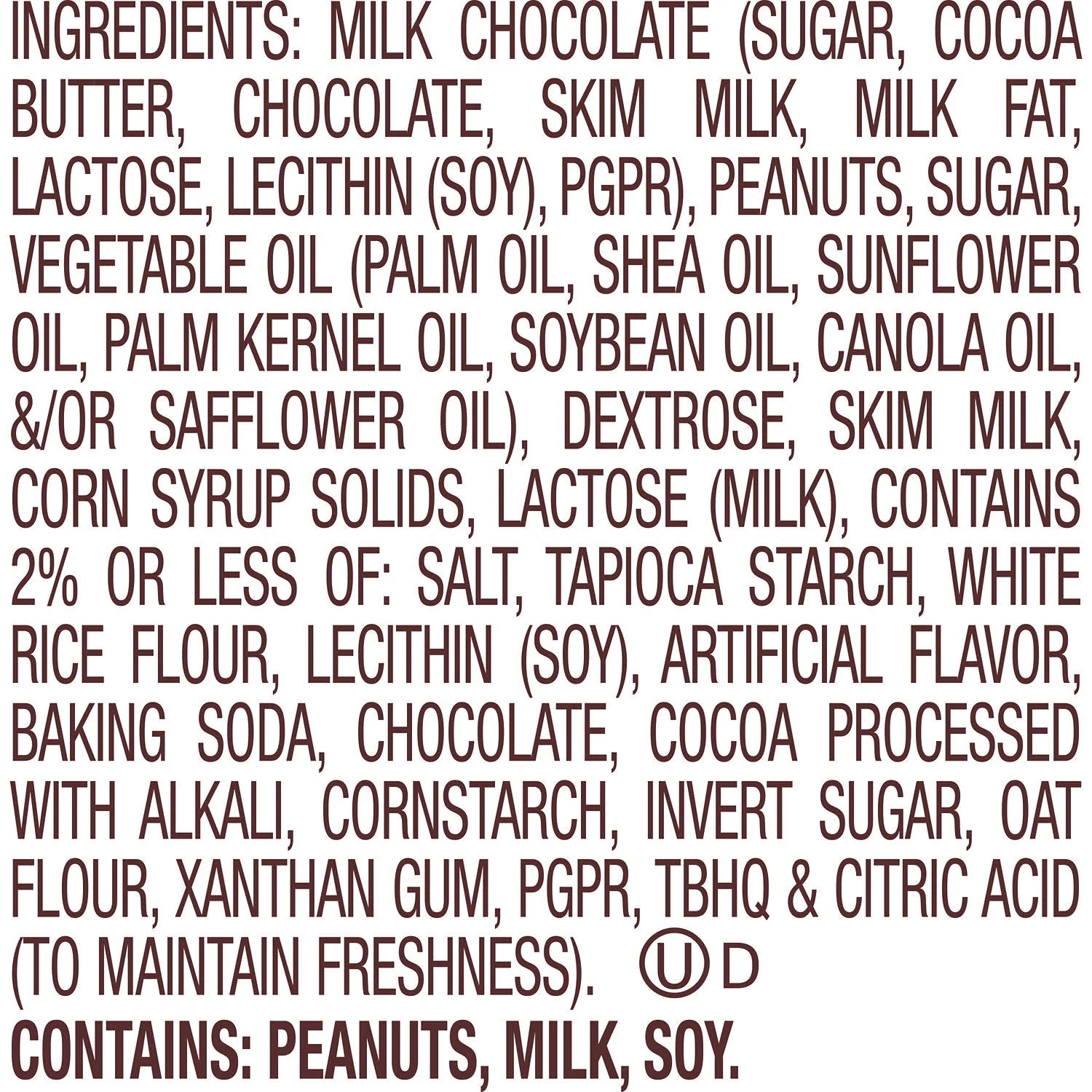 MILK CHOCOLATE (SUGAR, COCOA BUTTER, CHOCOLATE, SKIM MILK, MILK FAT, LACTOSE, LECITHIN (SOY), PGPR), PEANUTS, SUGAR, VEGETABLE OIL (PALM OIL, SHEA OIL, SUNFLOWER OIL, PALM KERNEL OIL, SOYBEAN OIL, CANOLA OIL, &/OR SAFFLOWER OIL), DEXTROSE, SKIM MILK, CORN SYRUP SOLIDS, LACTOSE (MILK), CONTAINS 2% OR LESS OF: SALT, TAPIOCA STARCH, WHITE RICE FLOUR, LECITHIN (SOY), ARTIFICIAL FLAVOR, BAKING SODA, CHOCOLATE, COCOA PROCESSED WITH ALKALI, CORNSTARCH, INVERT SUGAR, OAT FLOUR, XANTHAN GUM, PGPR, TBHQ & CITRIC ACID (TO MAINTAIN FRESHNESS)./div>