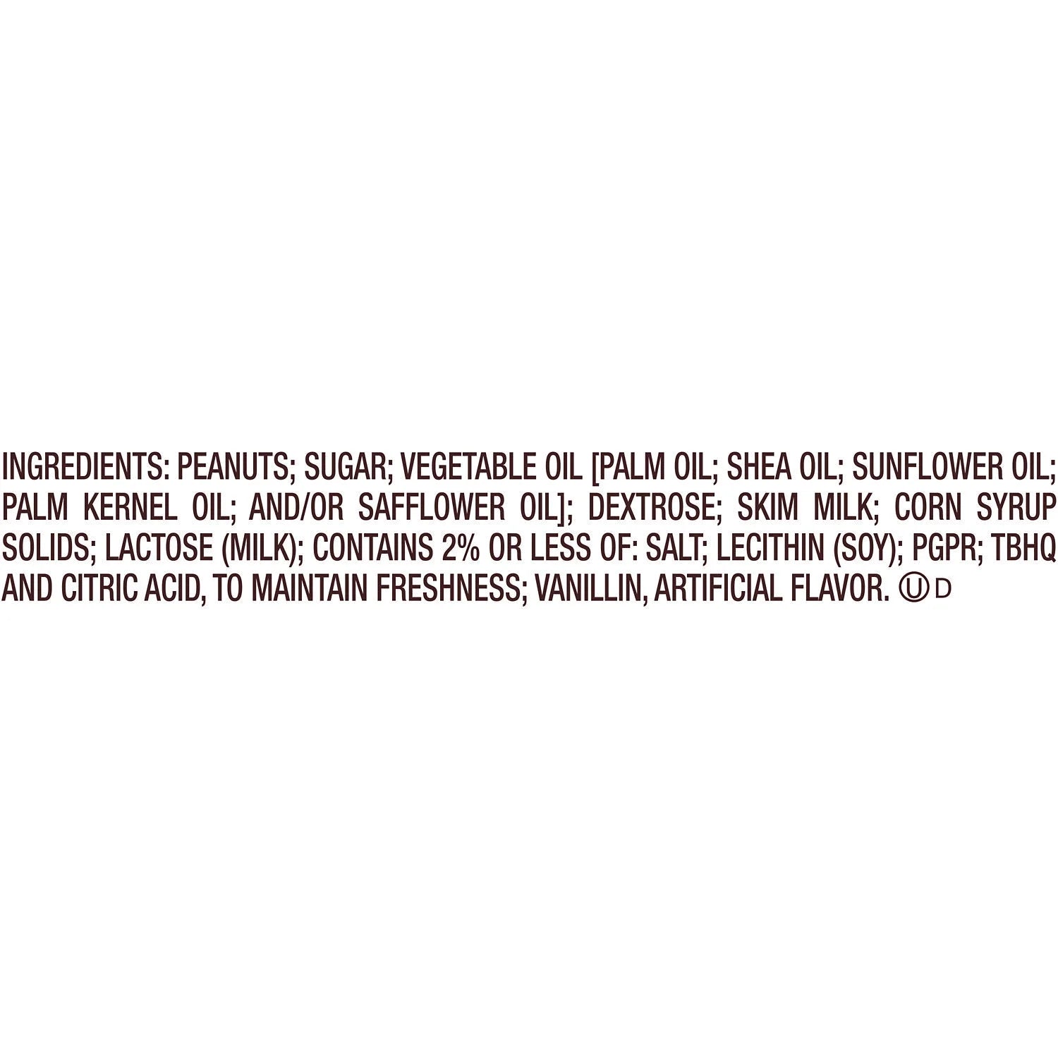 PEANUTS; SUGAR; VEGETABLE OIL [PALM OIL; SHEA OIL; SUNFLOWER OIL; PALM KERNEL OIL; AND/OR SAFFLOWER OIL]; DEXTROSE; SKIM MILK; CORN SYRUP SOLIDS; LACTOSE (MILK); CONTAINS 2% OR LESS OF: SALT; LECITHIN (SOY); PGPR; TBHQ AND CITRIC ACID, TO MAINTAIN FRESHNESS; VANILLIN, ARTIFICIAL FLAVOR/div>