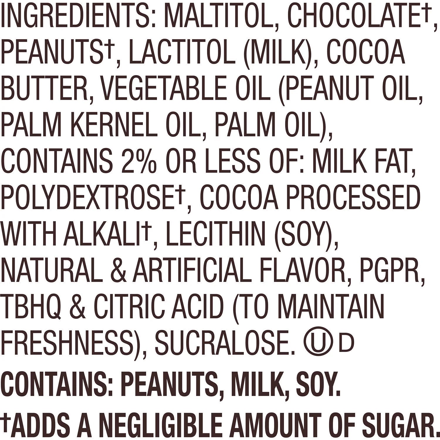 MALTITOL, CHOCOLATE†, PEANUTS†, LACTITOL (MILK), COCOA BUTTER, VEGETABLE OIL (PEANUT OIL, PALM KERNEL OIL, PALM OIL), CONTAINS 2% OR LESS OF: MILK FAT, POLYDEXTROSE†, COCOA PROCESSED WITH ALKALI†, LECITHIN (SOY), NATURAL & ARTIFICIAL FLAVOR, PGPR, TBHQ & CITRIC ACID (TO MAINTAIN FRESHNESS), SUCRALOSE./div>