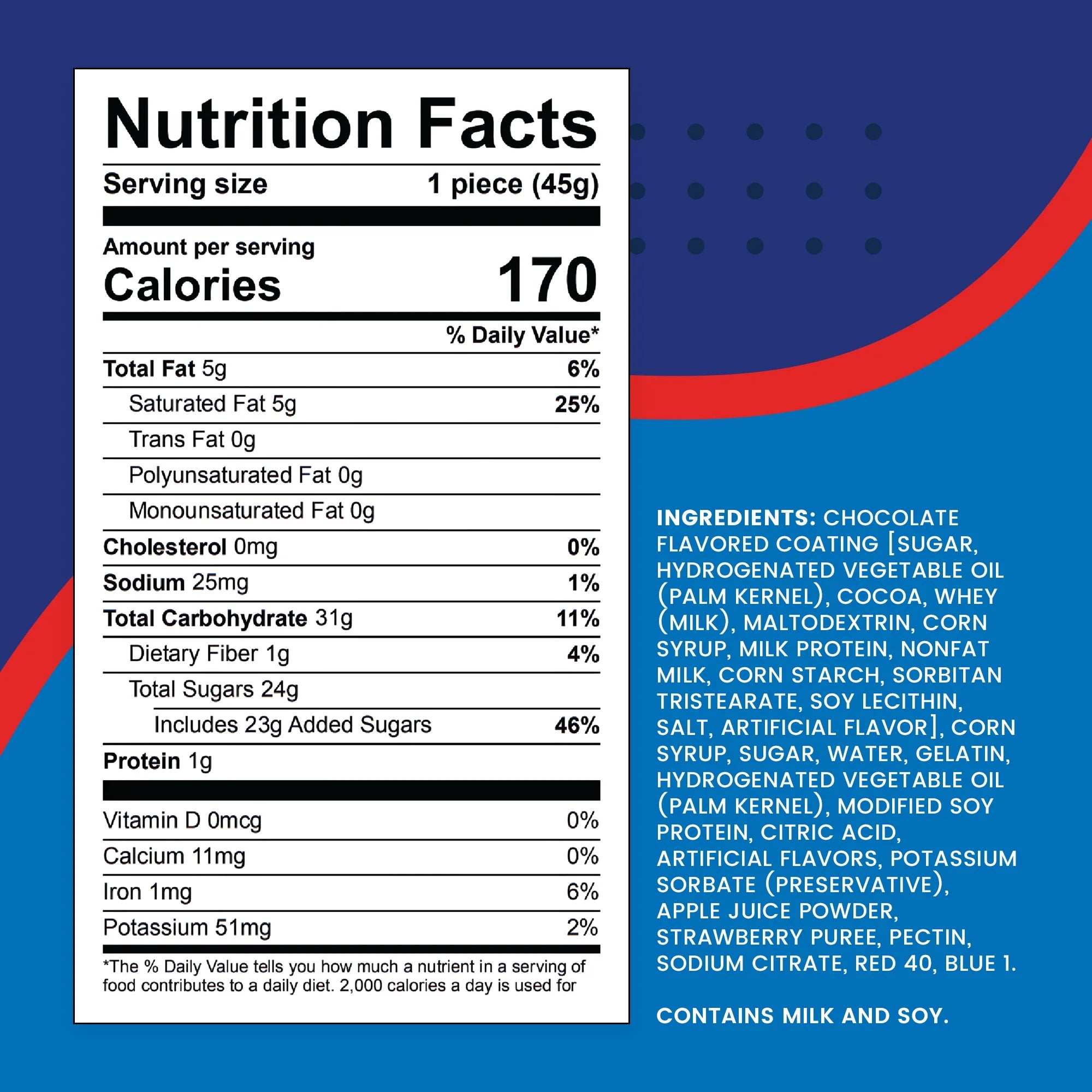 Chocolate Flavored Coating [Sugar, Hydrogenated Vegetable Oil (Palm Kernel), Cocoa, Whey (Milk), Maltodextrin, Corn Syrup, Milk Protein, Nonfat Milk, Corn Starch, Sorbitan Tristearate, Soy Lecithin, Salt, Artificial Flavor], Corn Syrup, Sugar, Water, Gelatin, Hydrogenated Vegetable Oil (Palm Kernel), Modified Soy Protein, Citric Acid, Artificial Flavors, Potassium Sorbate (Preservative), Apple Juice Powder, Strawberry Puree, Pectin, Sodium Citrate, Red 40, Blue 1./div>