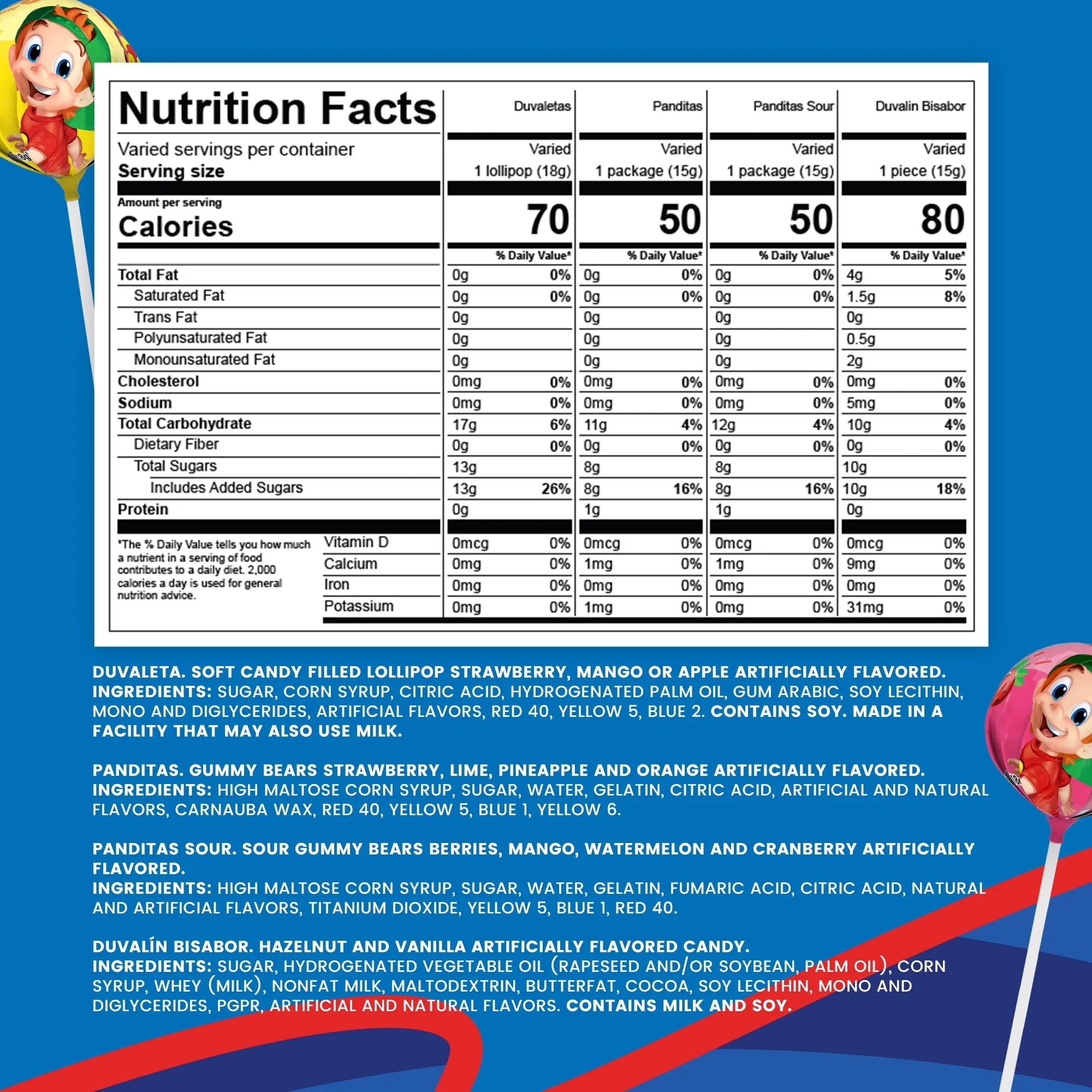 Duvaleta: Sugar, Corn Syrup, Citric Acid, Hydrogenated Palm Oil, Gum Arabic, Soy Lecithin, Mono And Diglycerides, Artificial Flavors, Red 40, Yellow 5, Blue 2.Bocadin: Chocolate Flavored Coating (Sugar, Hydrogenated Vegetable Fat (Palm), Cocoa, Starch, Soy Lecithin, Natural And Artificial Flavors, Pgpr), Sugar, Hydrogenated Vegetable Oil (Palm & Palm Kernel), Wheat Flour, Peanut Butter, Whey (Milk), Malt Extract, Soy Lecithin, Cocoa, Salt, Artificial & Natural Flavors, Baking Soda, Ammonium Bicarbonate, Vegetable Oil (Cottonseed & Canola).Panditas Classic: High Maltose Corn Syrup, Sugar, Water, Gelatin, Citric Acid, Artificial And Natural Flavors, Carnauba Wax, Red 40, Yellow 5, Blue 1, Yellow 6.Panditas Sour: High Maltose Corn Syrup, Sugar, Water, Gelatin, Fumaric Acid, Citric Acid, Natural And Artificial Flavors, Titanium Dioxide, Yellow5, Blue 1, Red 40.Duvalin: Sugar, Hydrogenated Vegetable Oil (Rapeseed And/Or Soybean, And Palm Oil), Corn Syrup, Lactose, Whey (Milk), Nonfat Milk, Milk Protein, Maltodextrin, Butterfat, Cocoa, Corn Starch, Soy Lecithin, Glyceryl Monooleate, Pgpr, Artificial And Natural Flavors./div>