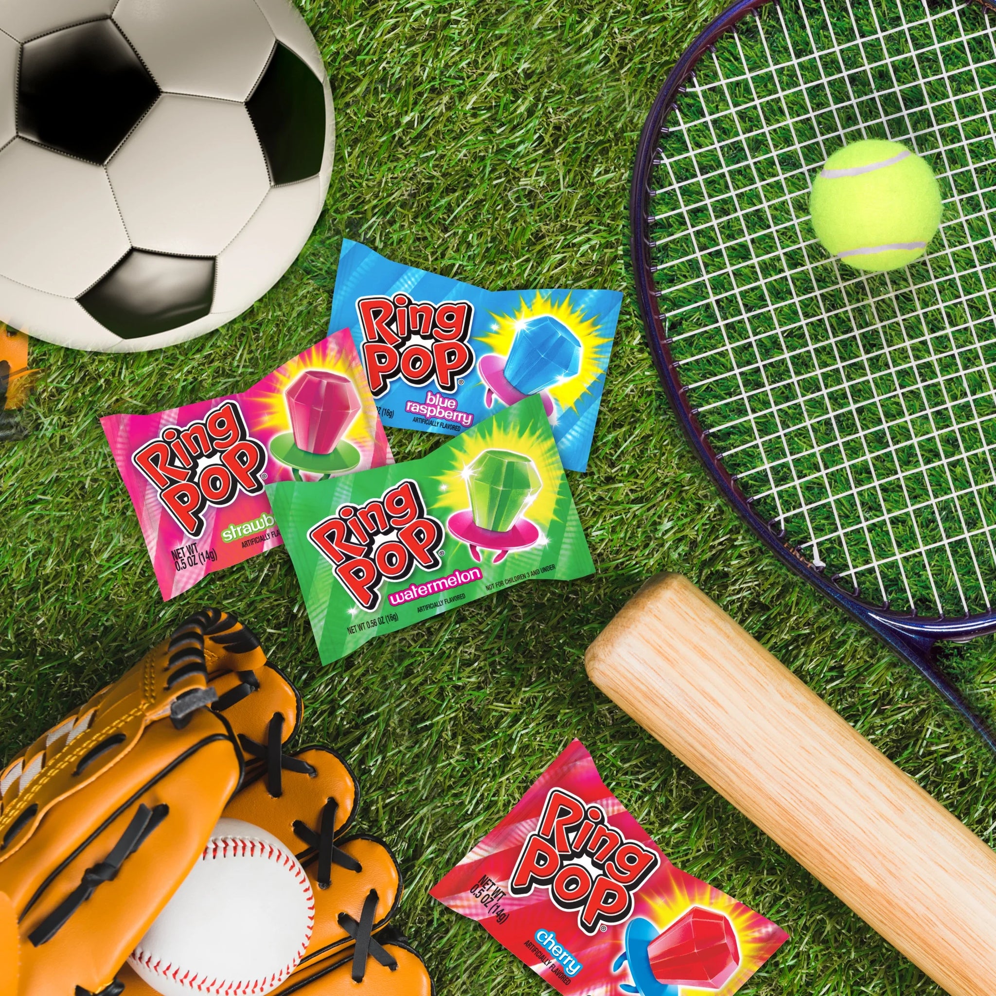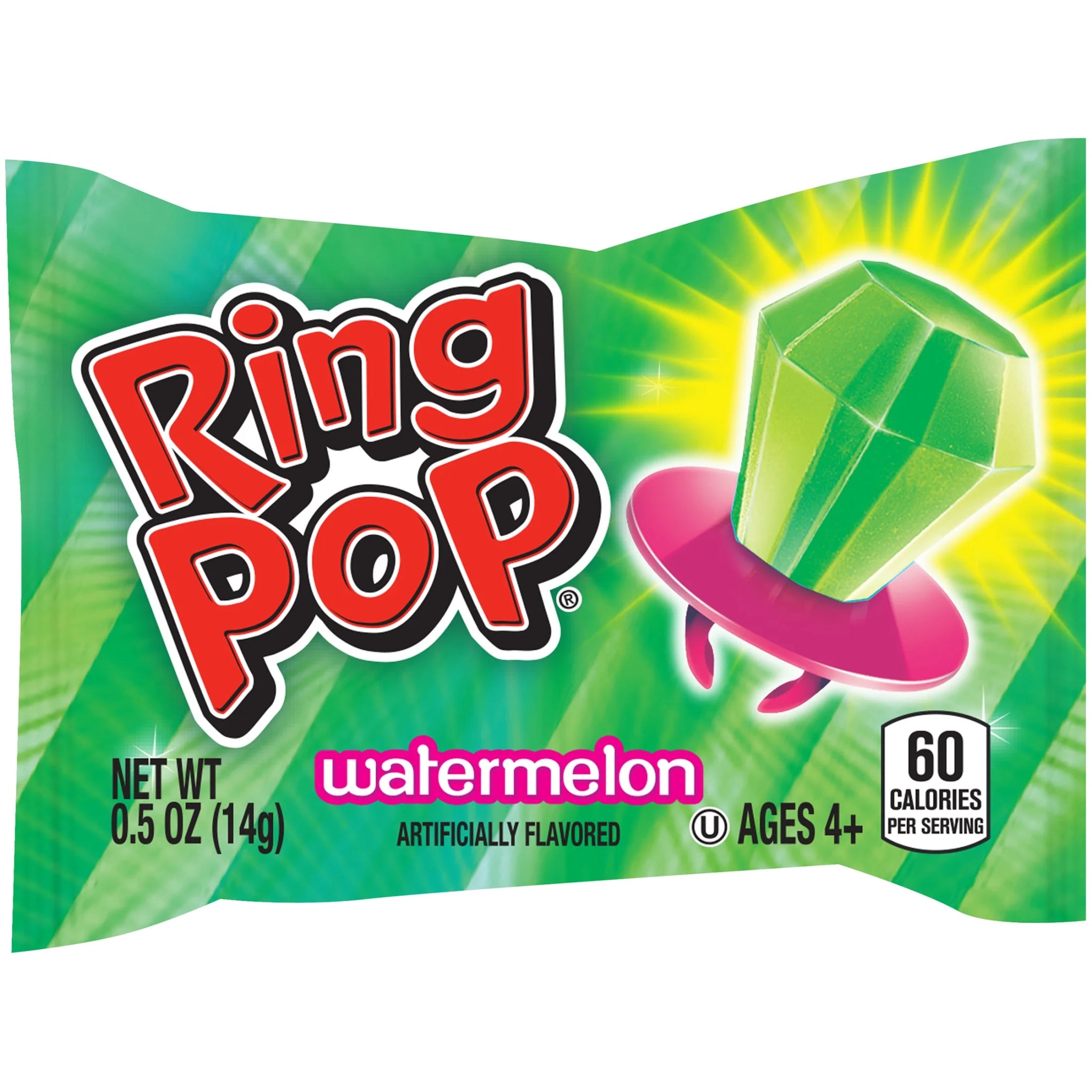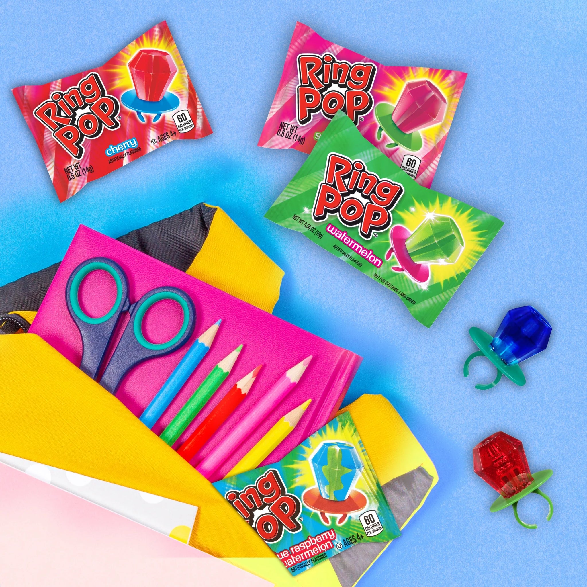 Ring Pop is the wearable lollipop with an enormous eye-catching candy gem that tastes as good as it looks. Slip it on your finger and enjoy the flavor--and the attention! Pick one delicious individually-wrapped Ring Pop lollipop from a selection of 6 mouth-watering fruity flavors: Strawberry, Blue Raspberry, Blue Raspberry Watermelon, Sour Cherry, Watermelon and Berry Blast. Disclaimer: Not for children 3 and under.