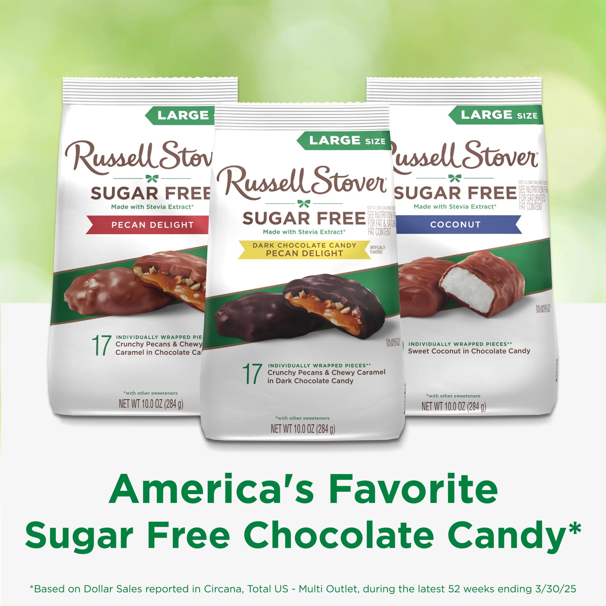 Indulge in the irresistible taste of RUSSELL STOVER Sugar Free Dark Chocolate Pecan Delights. Each 10 oz. bag contains about 17 individually wrapped pieces of crunchy pecans and chewy caramel generously coated in decadent dark chocolate. Crafted with Stevia extract, a plant-based sweetener, our sugar free pecan delights offer the perfect balance of sweetness without compromising on flavor. Enjoy the rich taste of dark chocolate, the satisfying crunch of pecans and rich caramel, all without the guilt. Each piece is individually wrapped for an on-the-go treat, filling up the candy bowl or thoughtful sharing. An American classic since 1923, RUSSELL STOVER has been honoring the craft of chocolate-making using only the finest ingredients and we are proud to offer great tasting, sugar free alternatives to your favorites! Discover the Unbelievable Taste of RUSSELL STOVER Sugar Free Dark Chocolate Pecan Delights Today!