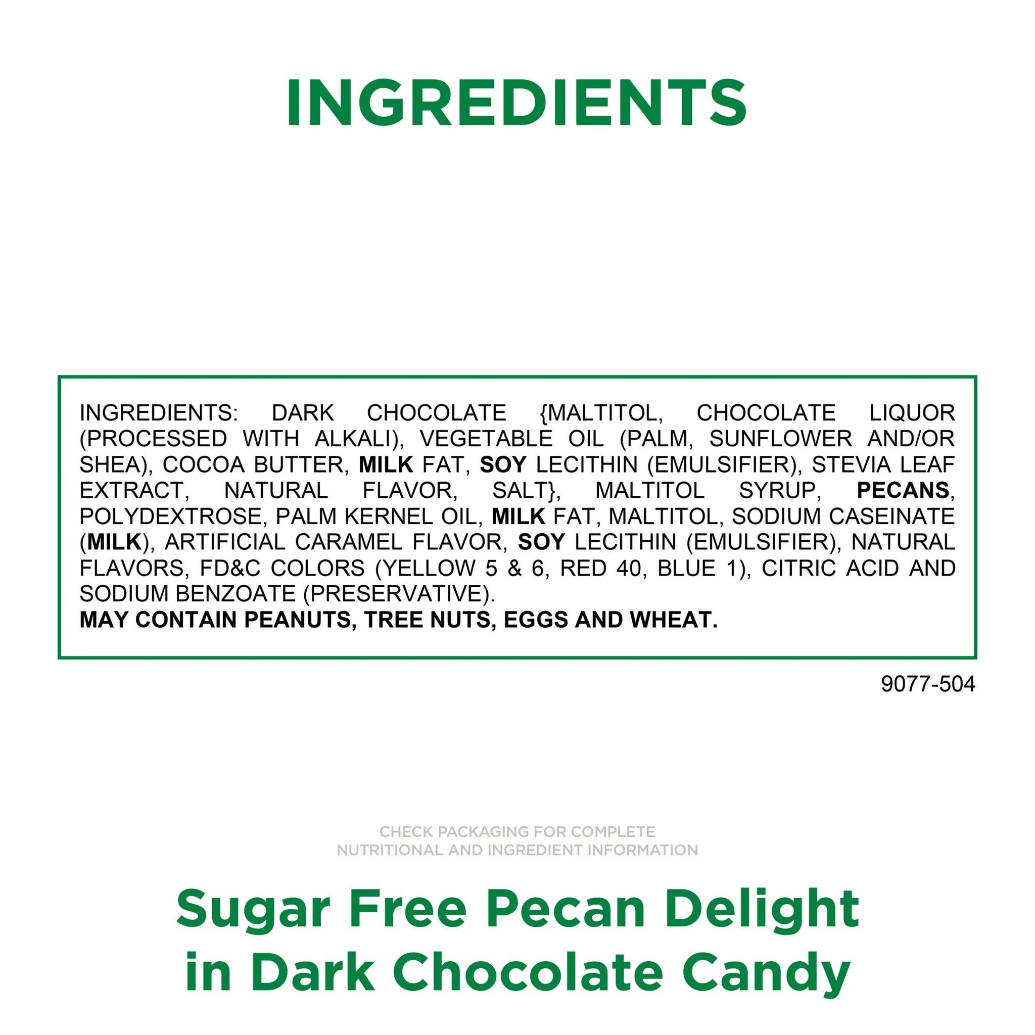 DARK CHOCOLATE {MALTITOL, CHOCOLATE LIQUOR (PROCESSED WITH ALKALI), VEGETABLE OIL (PALM, SUNFLOWER AND/OR SHEA), COCOA BUTTER, MILK FAT, SOY LECITHIN (EMULSIFIER), STEVIA LEAF EXTRACT, NATURAL FLAVOR, SALT}, MALTITOL SYRUP, PECANS, POLYDEXTROSE, PALM KERNEL OIL, MILK FAT, MALTITOL, SODIUM CASEINATE (MILK), ARTIFICIAL CARAMEL FLAVOR, SOY LECITHIN (EMULSIFIER), NATURAL FLAVORS, FD&C COLORS (YELLOW 5 & 6, RED 40, BLUE 1), CITRIC ACID AND SODIUM BENZOATE (PRESERVATIVE)./div>