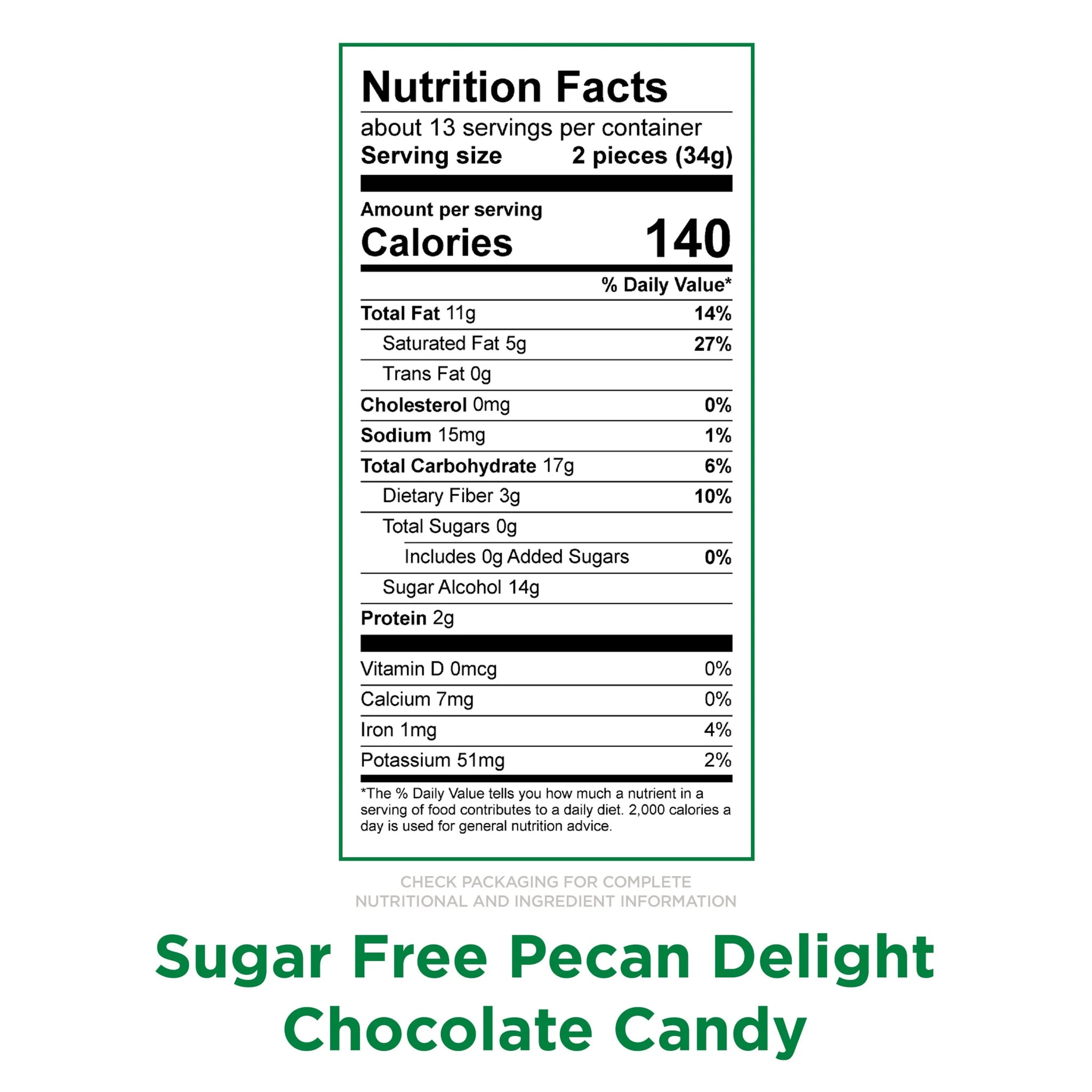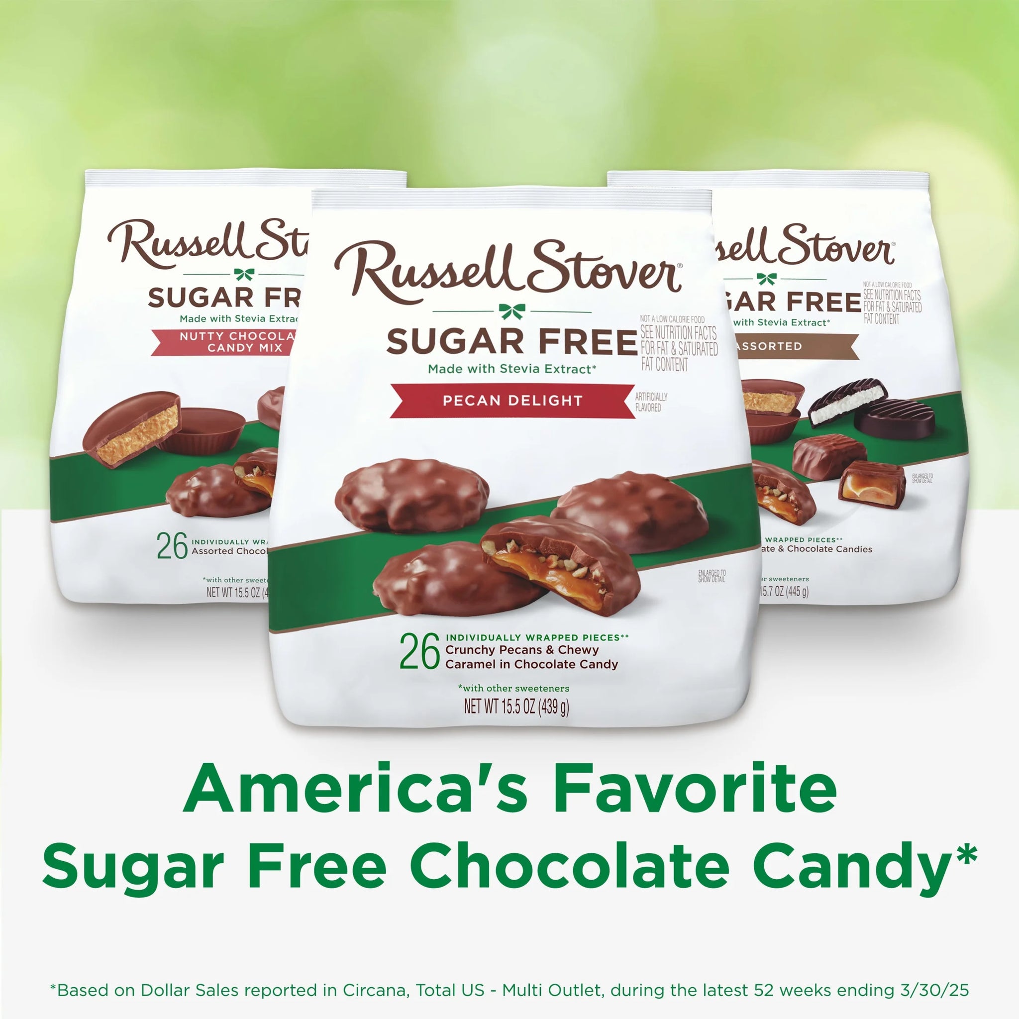 • No sugar, great taste! RUSSELL STOVER Sugar Free Pecan Delights in Chocolate Candy, 15.5 oz., is made with Stevia extract, a plant-based sweetener that delivers all the sweet taste you crave with no added sugar.