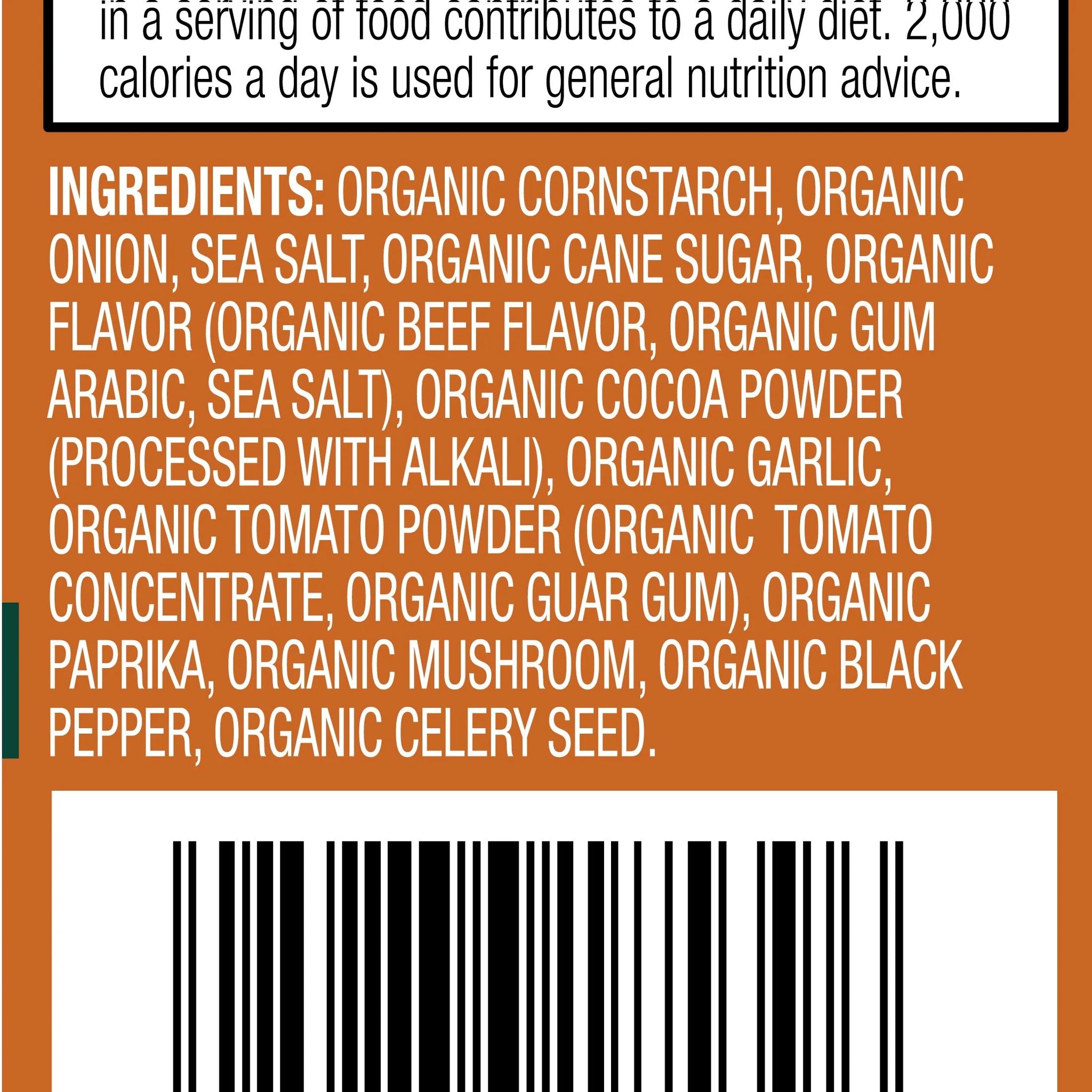 Organic Cornstarch, Sea Salt, Organic Maltodextrin, Organic Cane Sugar, Organic Flavor (Organic Beef Flavor, Organic Gum Arabic, Sea Salt), Organic Cocoa Powder (Processed with Alkali), Organic Garlic, Organic Onion, Organic Rice Concentrate, Organic Mushroom, Organic Paprika, Organic Black Pepper, Organic Celery Seed./div>