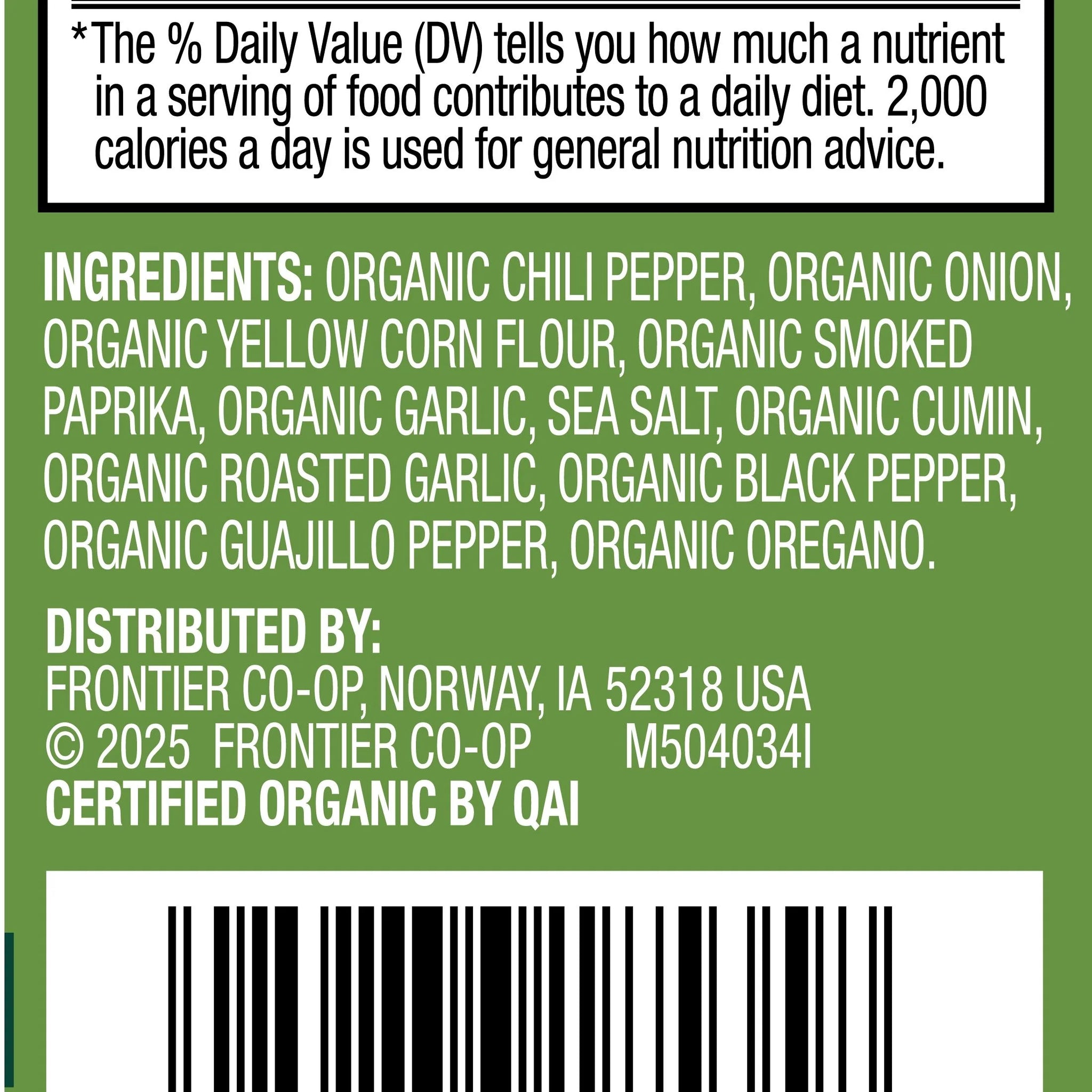 Organic Chili Pepper, Organic onion, organic yellow corn flour, organic smoked paprika, organic garlic, sea salt, organic cumin, organic roasted garlic, organic black pepper, organic guajillo pepper, organic oregano/div>
