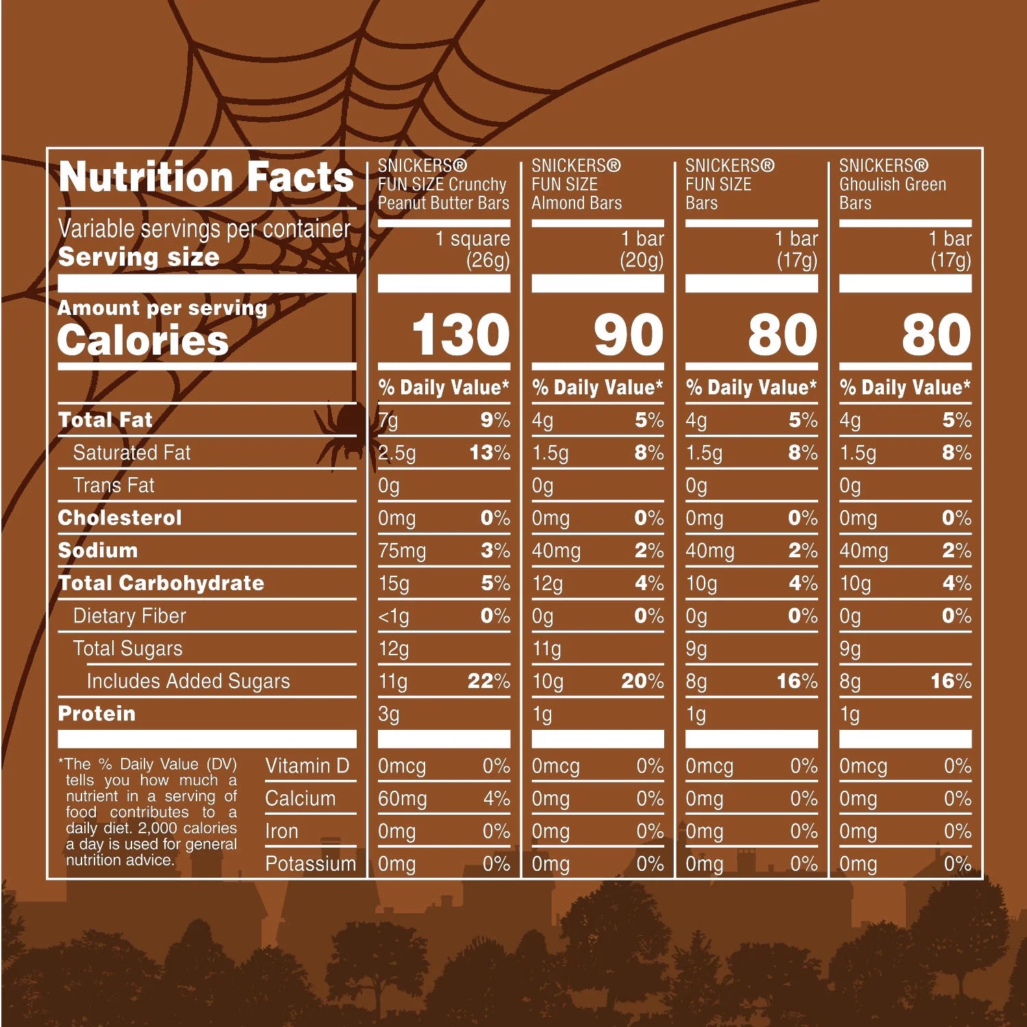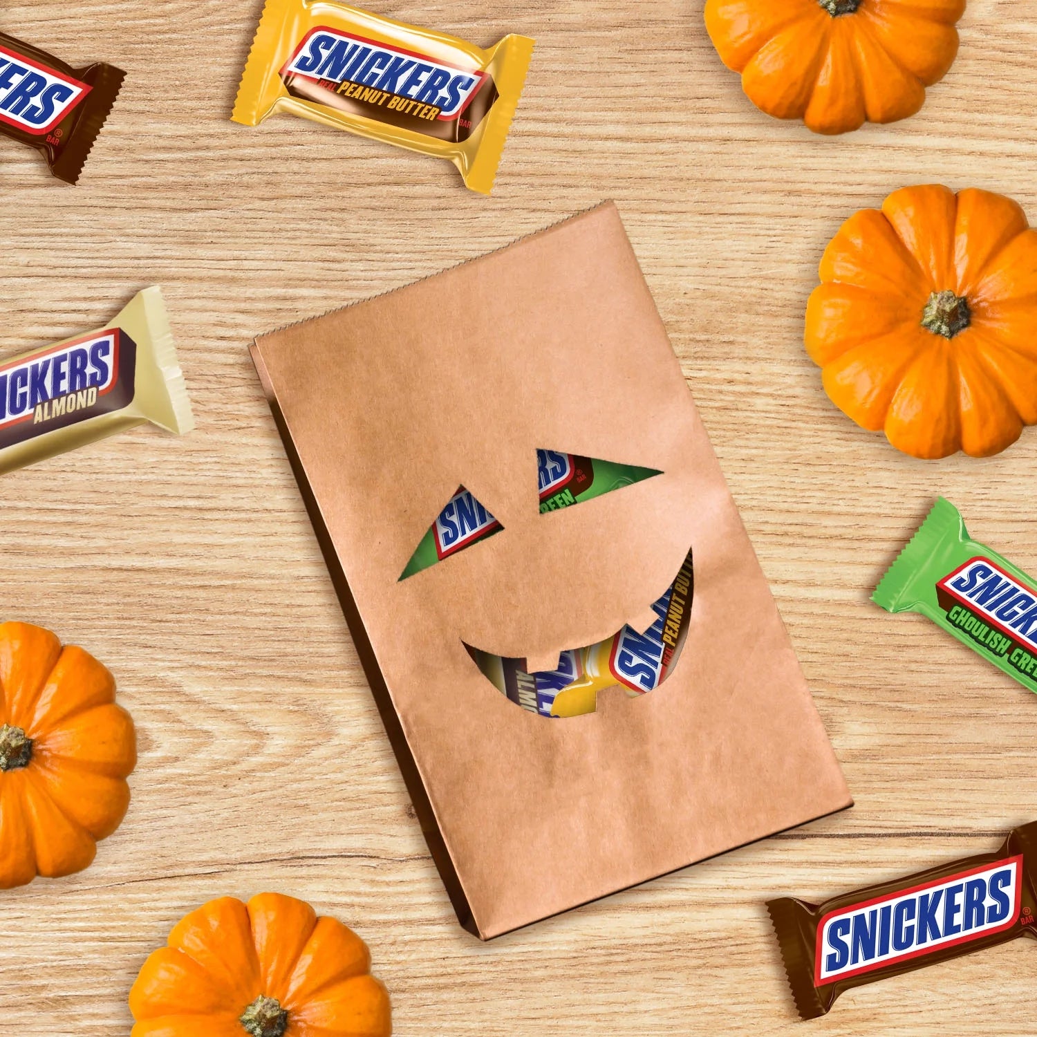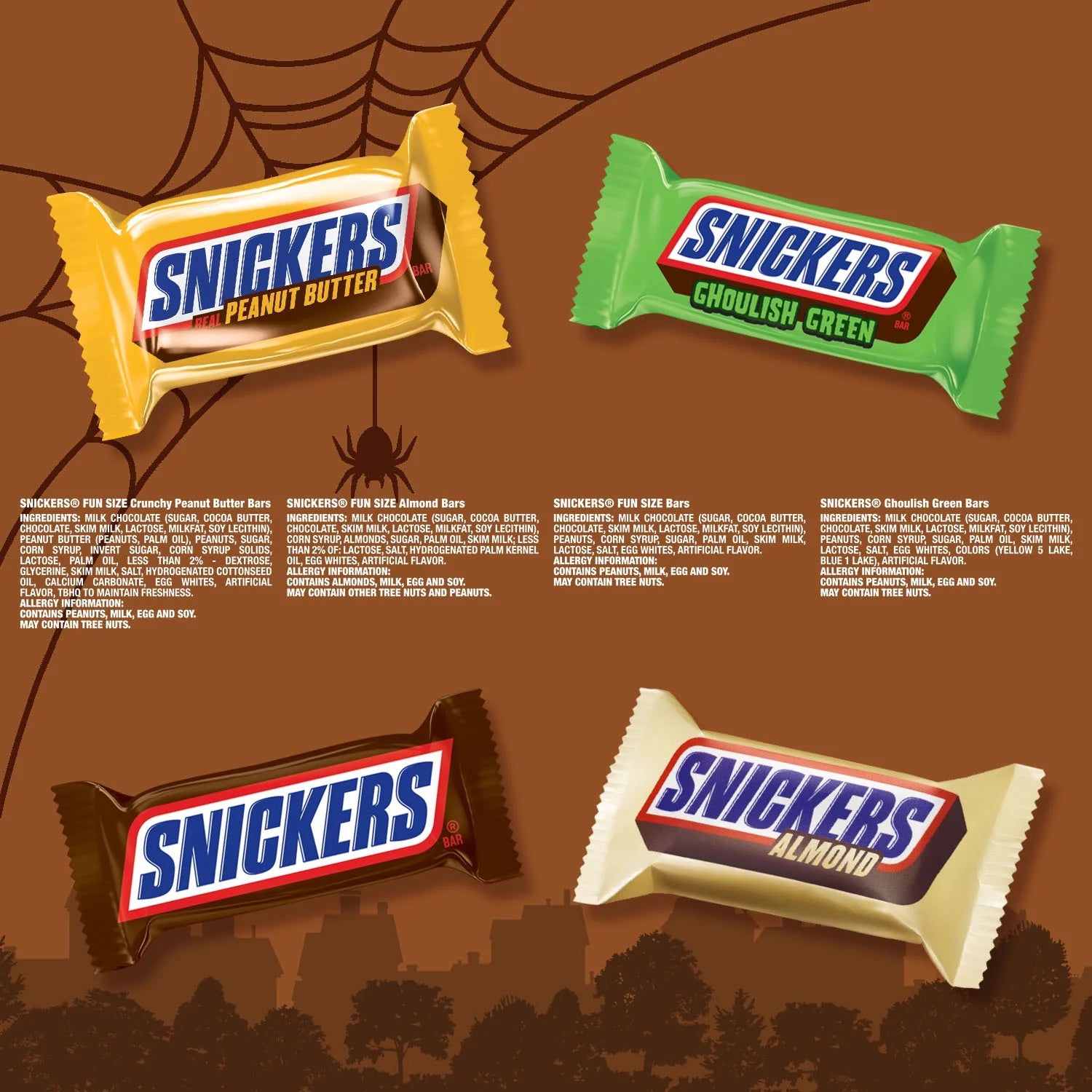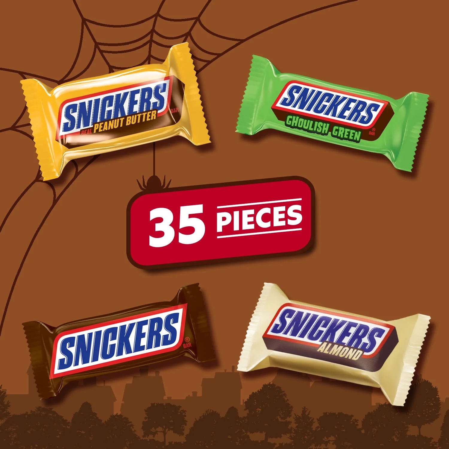 • Contains one (1) 22.99-ounce, 35-piece variety bag of SNICKERS Fun Size Original , SNICKERS Almond, SNICKERS Crunchy Peanut Butter, and SNICKER Ghoulish Green Halloween Candy Bars