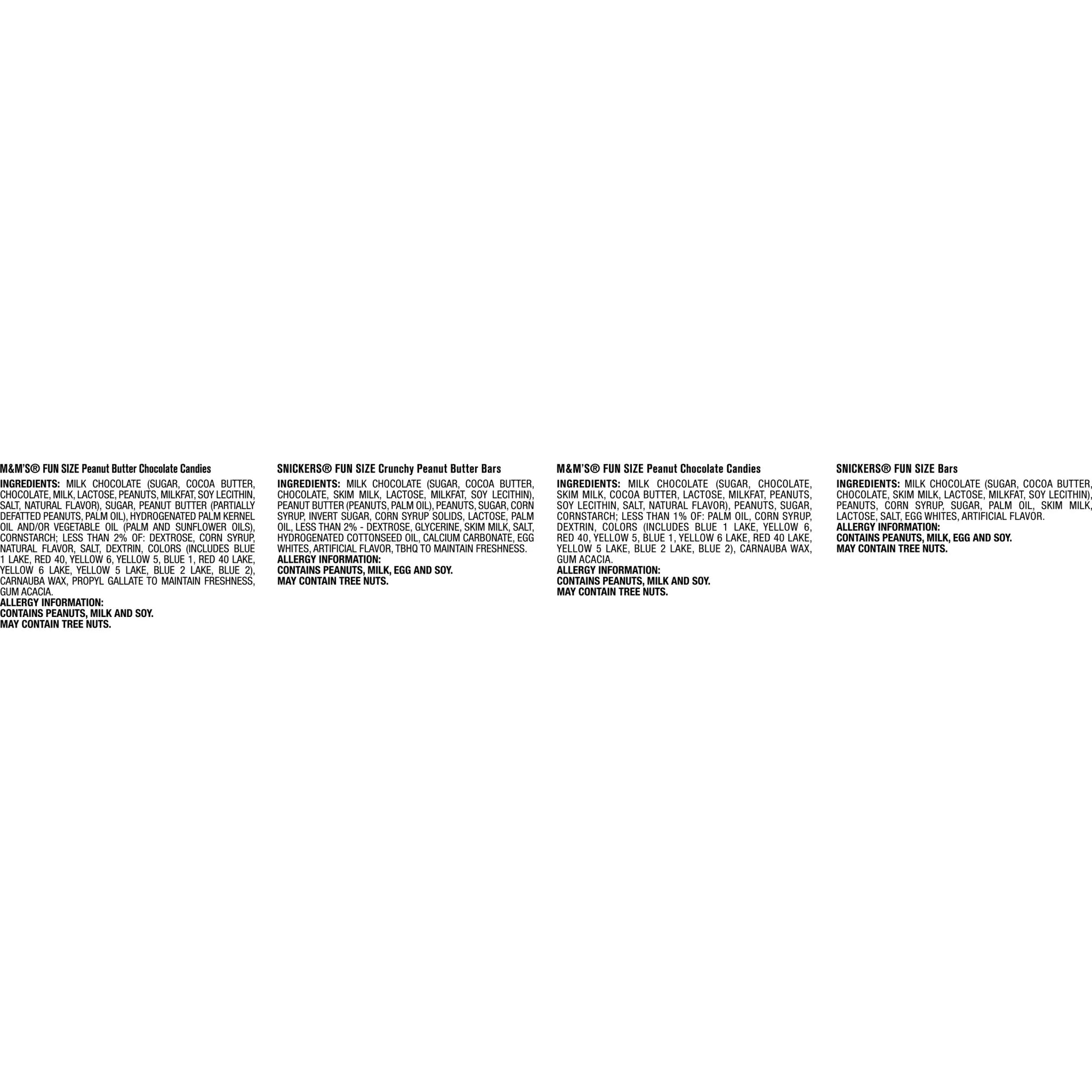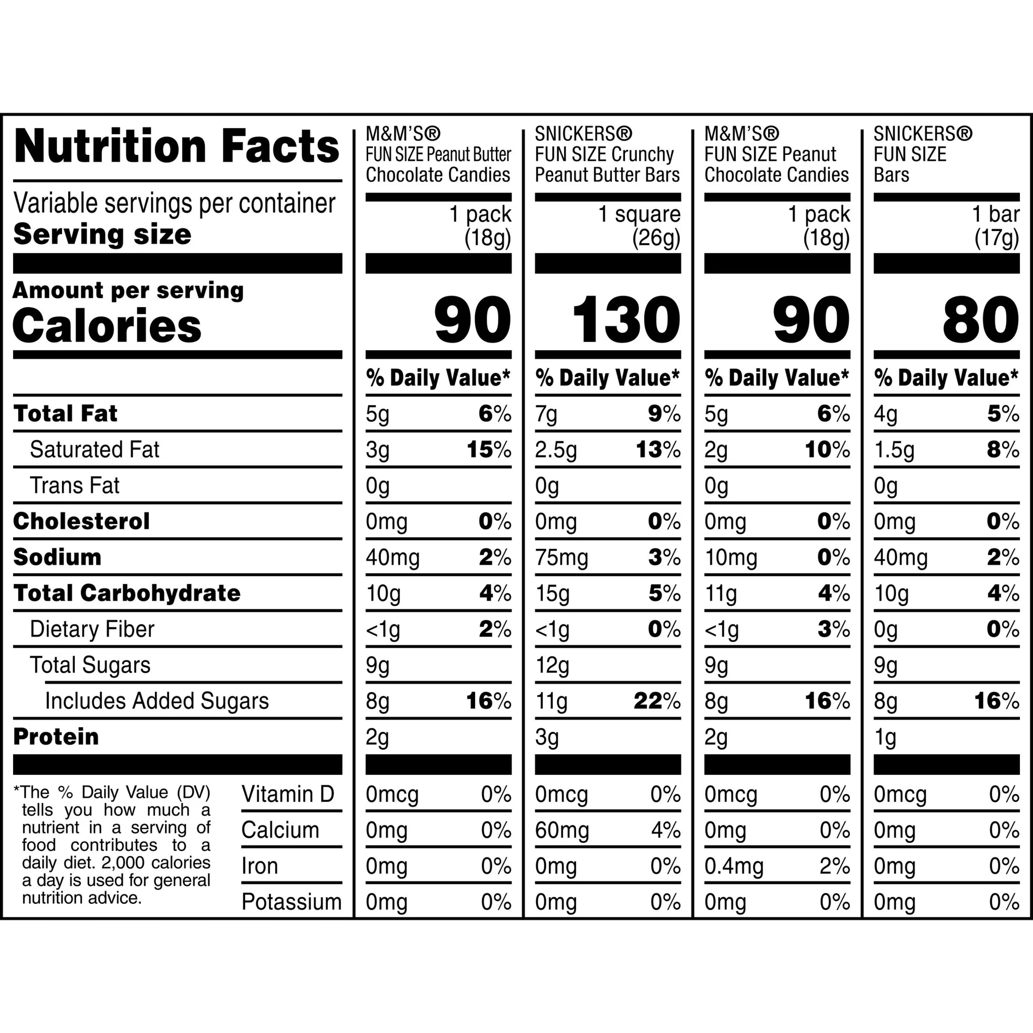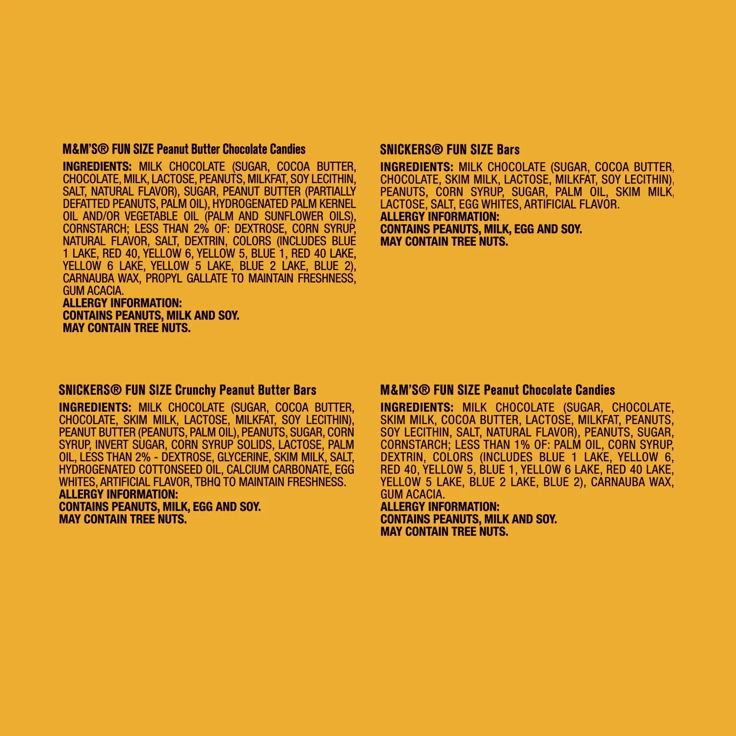 - Features a fun size assortment of SNICKERS Original Milk Chocolate Candy Bars, SNICKERS Crunchy Peanut Butter Milk Chocolate Candy Bars, M&M'S Peanut, and M&M'S Peanut Butter Candy
