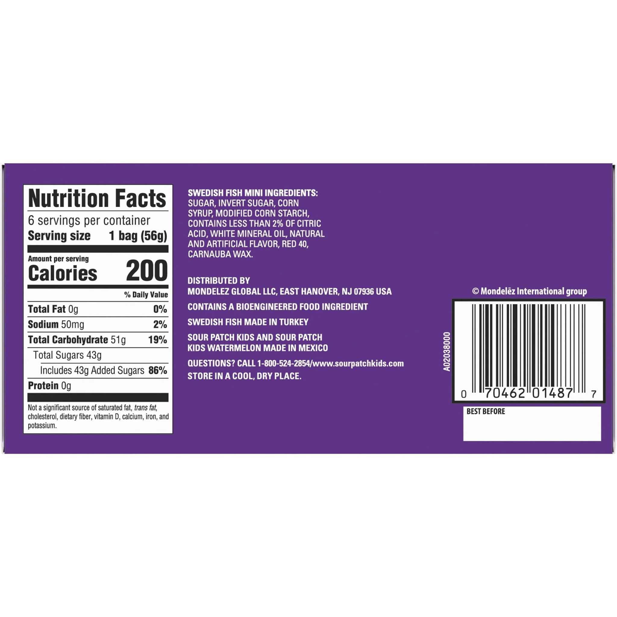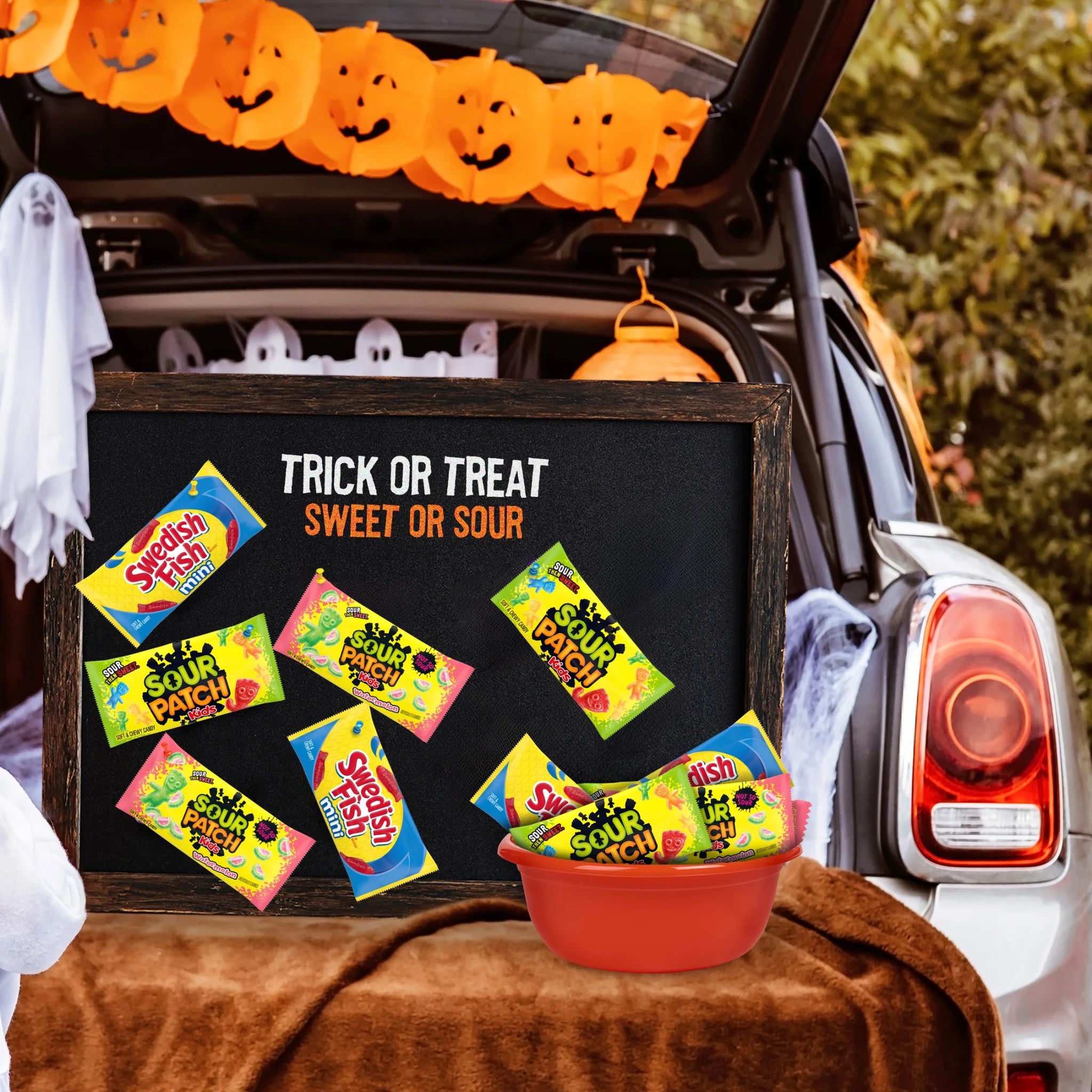 Make your house a trick-or-treating hot spot with the SOUR PATCH KIDS and SWEDISH FISH Mini Soft & Chewy Halloween Candy Variety Pack. This fun and fruity candy mix variety pack contains full-sized bags with SOUR PATCH KIDS Original and Watermelon Soft & Chewy Candy for a SOUR THEN SWEET treat that's a fat free food to satisfy your taste buds. This sweet and sour candy mix pack also includes SWEDISH FISH candy with its signature red gummy fish shape in a mini size. With this bulk Halloween candy pack of chewy snacks, you'll be ready for all the trick-or-treaters.