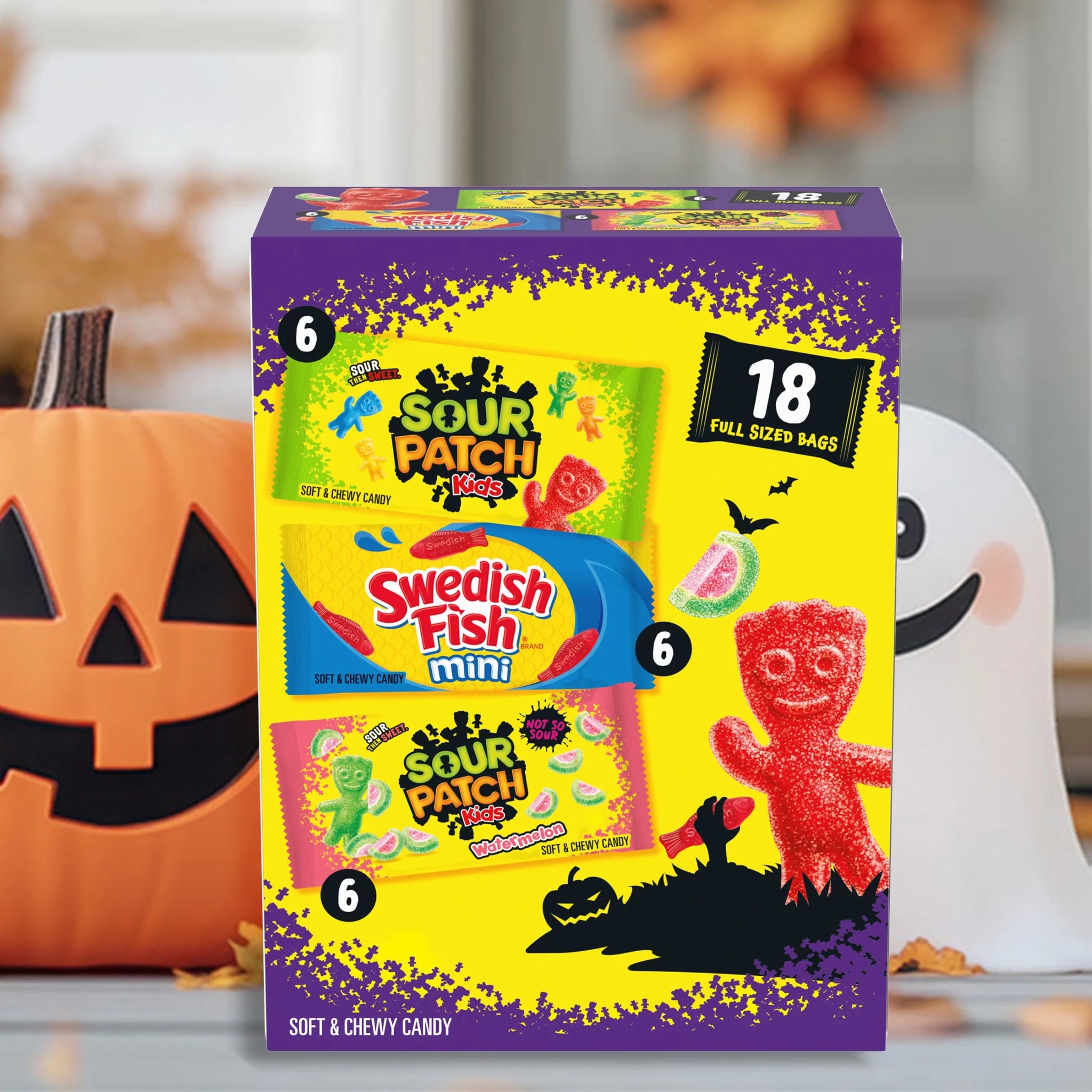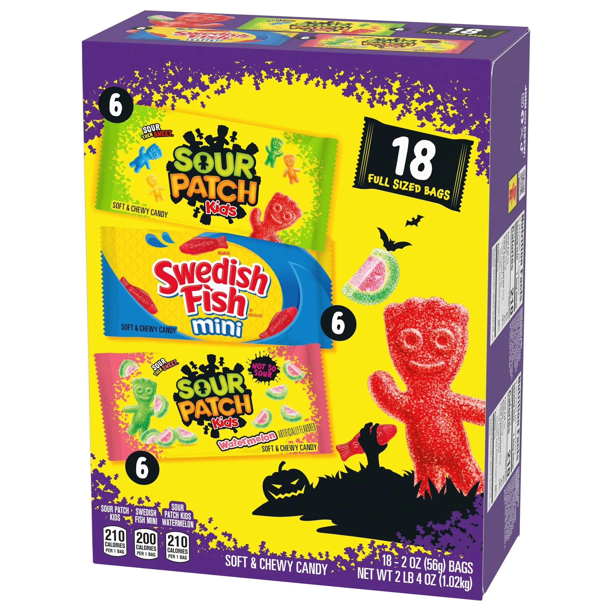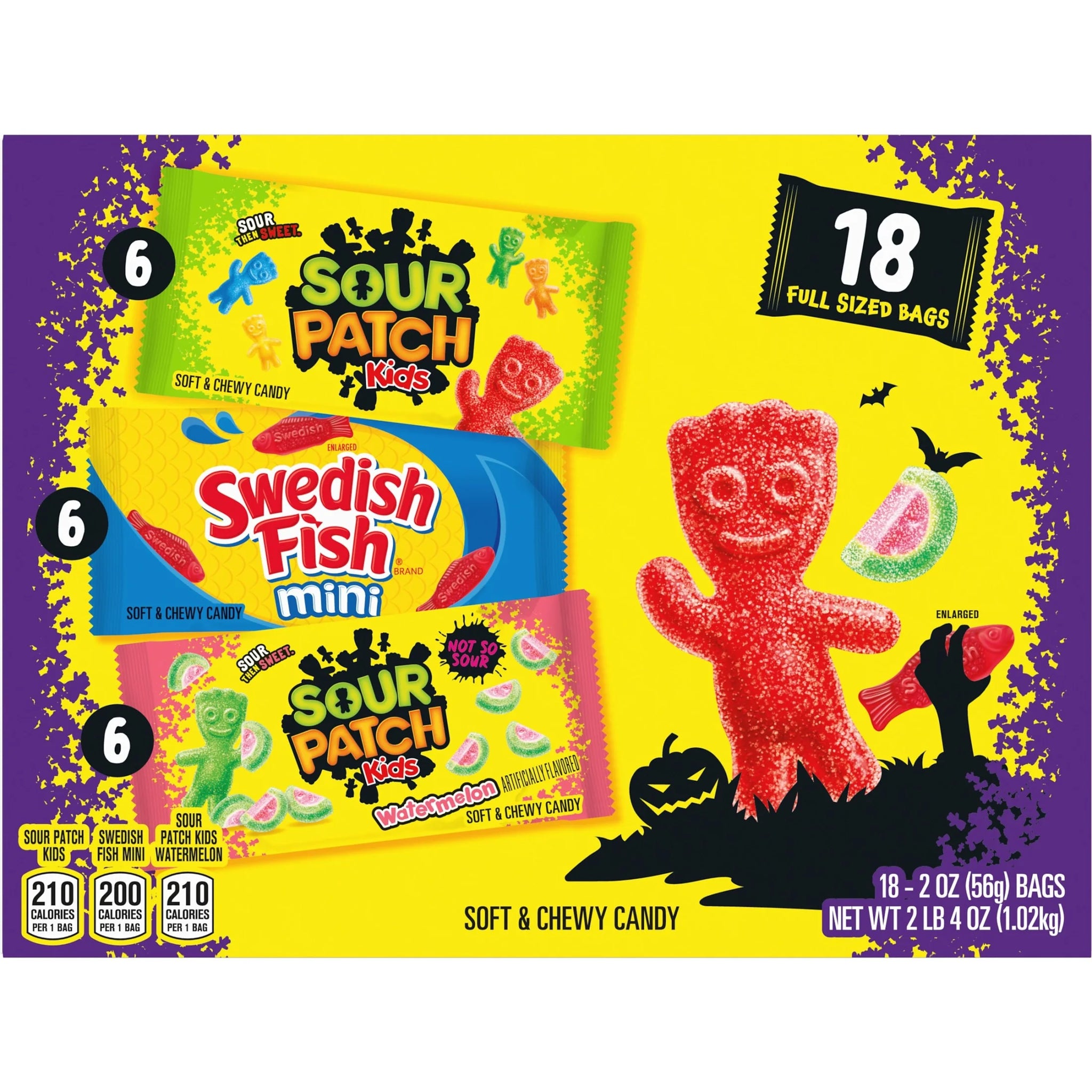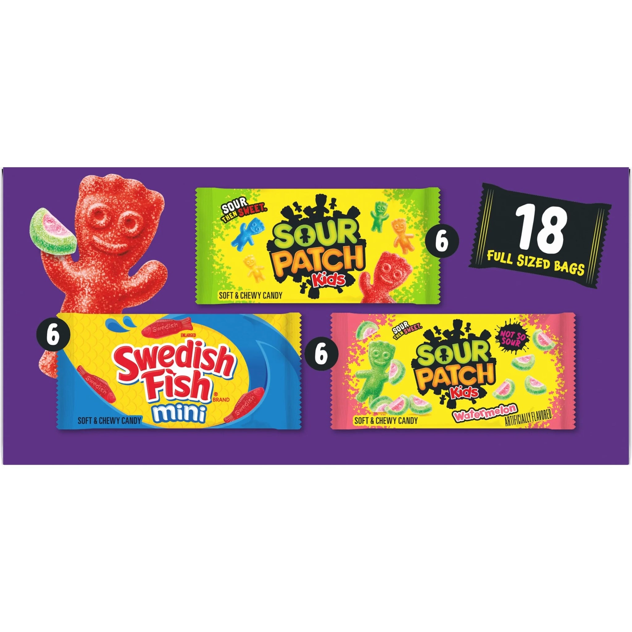 - One variety pack box, 18 - 2 oz snack packs, of SOUR PATCH KIDS Watermelon, SOUR PATCH KIDS Original, and SWEDISH FISH Mini Soft & Chewy Halloween Candy