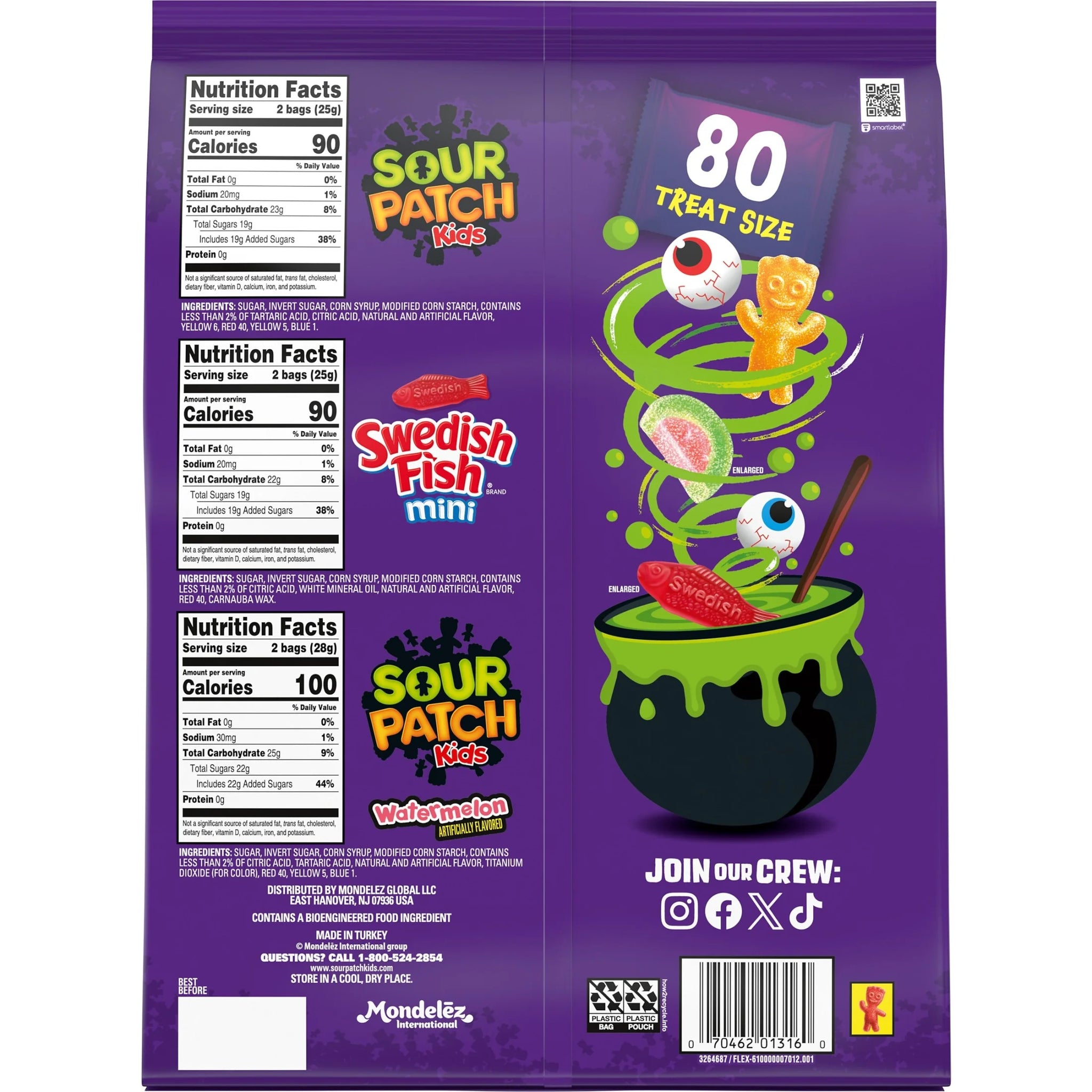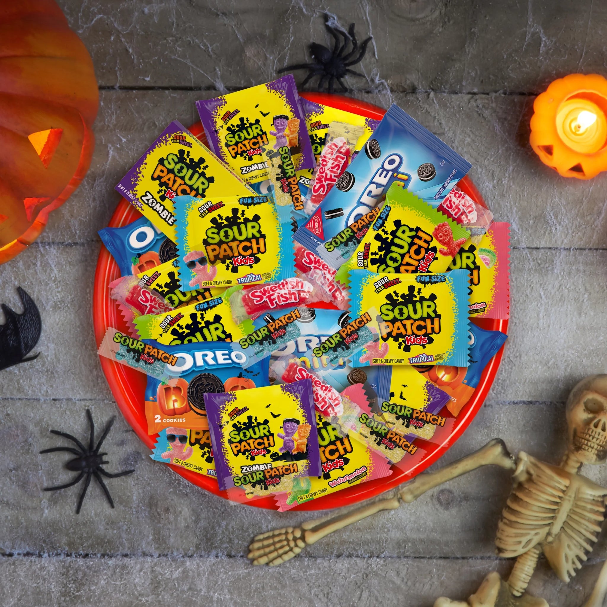 • One variety pack with 80 treat-size bags of SOUR PATCH KIDS Watermelon, SOUR PATCH KIDS Original, and SWEDISH FISH Mini Soft & Chewy Halloween Candy